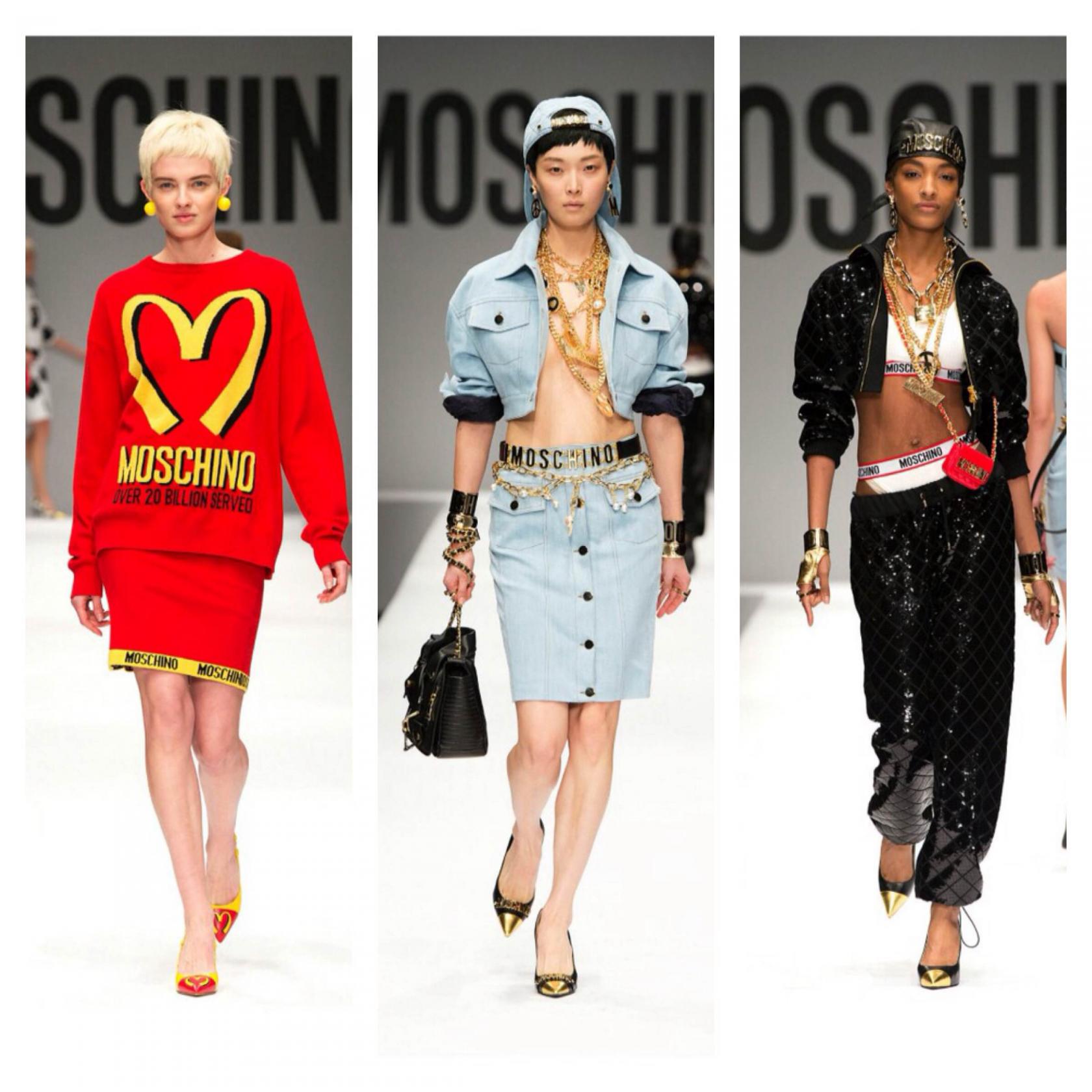 Umorismo tongue-in-cheek e impertinenza divertita: la première di Jeremy Scott per Moschino è un trionfo, un ritorno all'atmosfera esuberante e divertita che caratterizzava gli show dello stilista scomparso. Ossessione del fast food riscritta in chiave couture, logomania e giochi di parole l'omaggio a Franco Moschino; la serie "Sponge Bob", i boxer bikini e gli abiti da sera stampati con involucri di caramelle e packaging di corn flakes e tavolette di cioccolato sono invece tutta farina del sacco del nuovo direttore creativo che ha dichiarato:"I don't speak italian but I do speak Moschino".