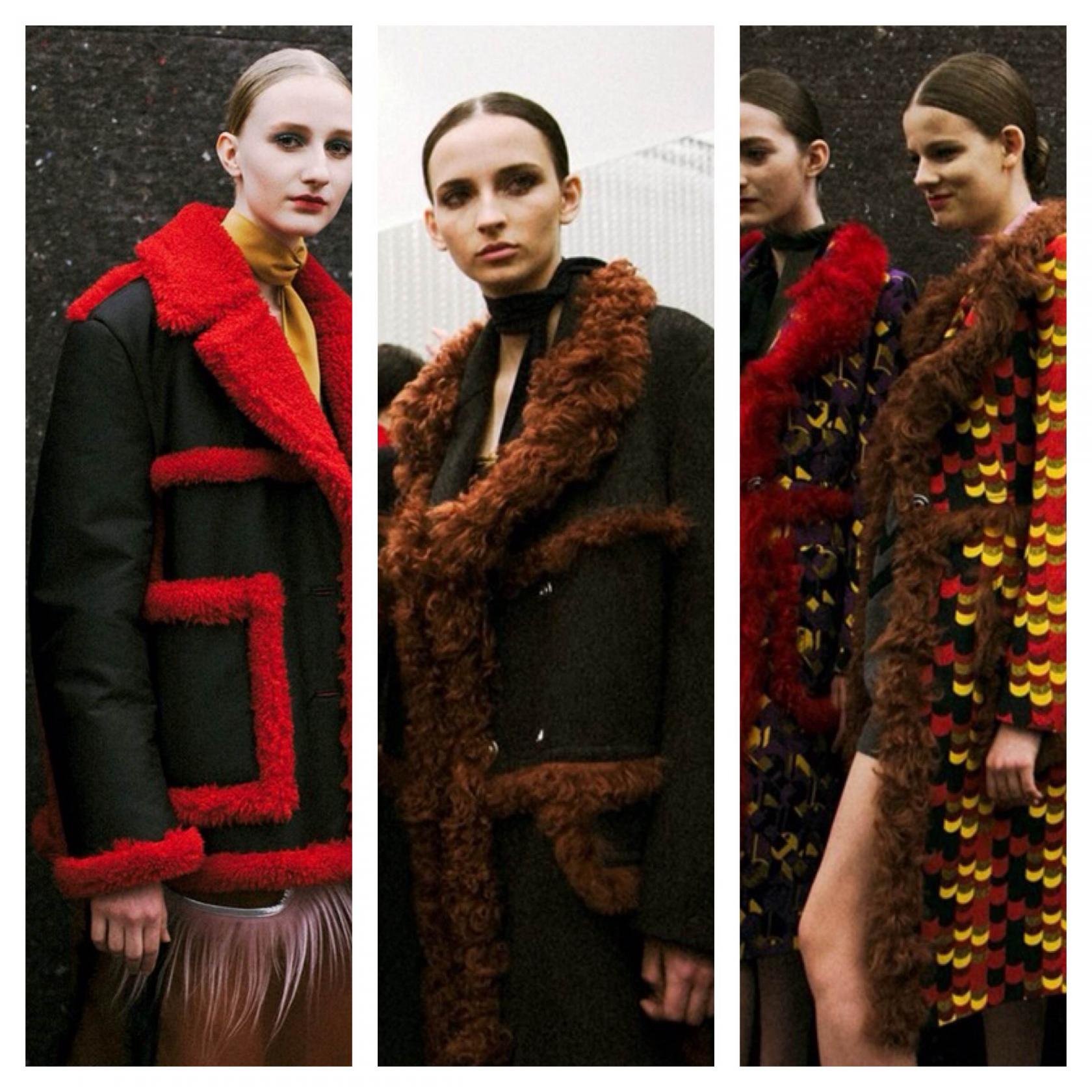Teatro d'avanguardia tedesco l'ispirazione per l'outerwear di Miuccia, che scolpisce una figura mascolina e squadrata, a volte addolcita da pattern anni Settanta, a volte impreziosita da shearling in colori a contrasto. Il fascino à la garçonne dei capispalla è sovvertito da ciò che sta sotto: abiti-lingerie impalpabili e trasparenti, bordati di pelliccia, richiamano e allo stesso tempo rompono il ritmo geometrico di una donna a metà fra la casalinga borghese frustrata e la street walker sovversiva.