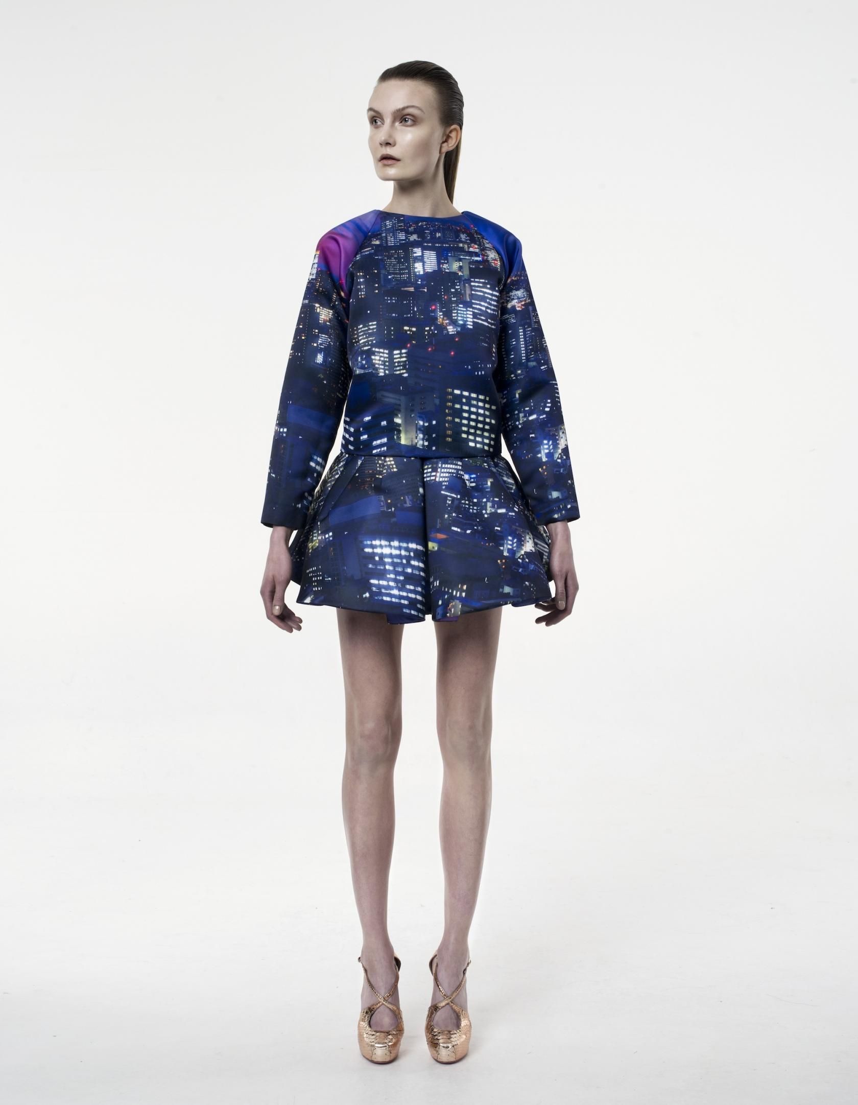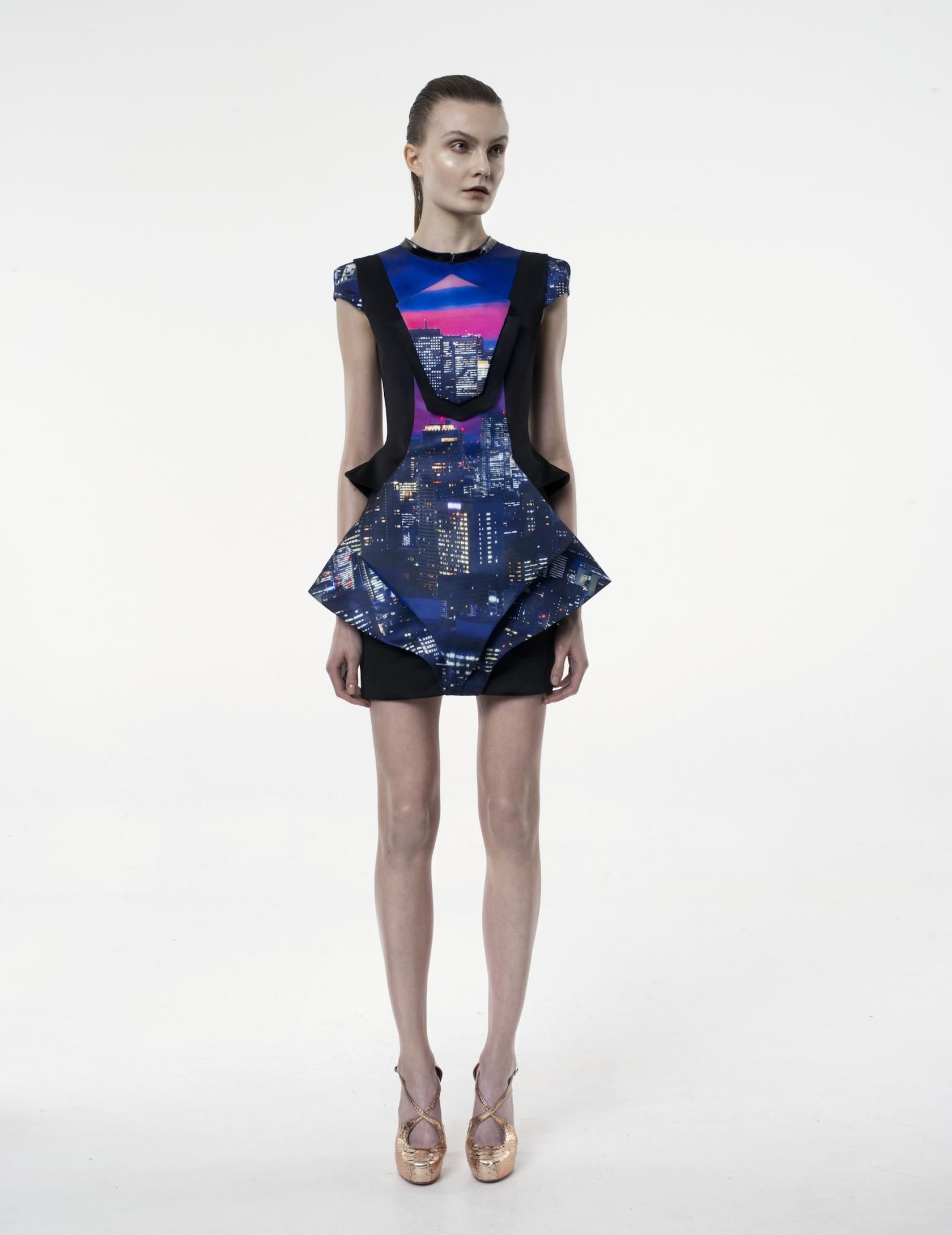 La nuova collezione #NEOTOKYO racchiude due delle mie tante passioni, il Giappone e la fantascienza. Ho immaginato una distopica megalopoli del futuro, che si è materializzata nelle stampe digitali. Uno skyline notturno che si anima di luce non solo grazie all'utilizzo di materiali pregiati, come la duchesse ma anche attraverso preziosi ricami lavorati a mano, che conferiscono maggiore profondità e movimento al capo. Ho mixato tessuti tecnici dello sportswear a tessuti pregiati e abiti scultorei. Mentre per interni e t-shirts ho unito i graffiti urbani alla fotografia Giapponese di fine ‘800.