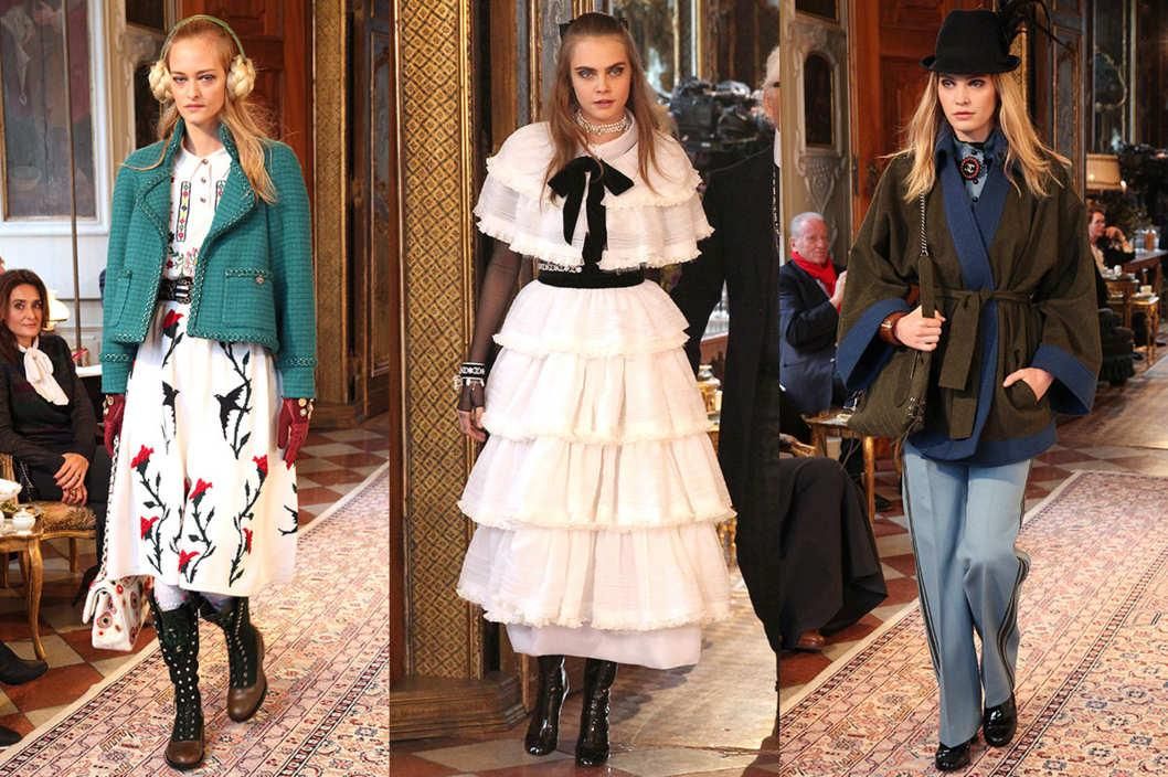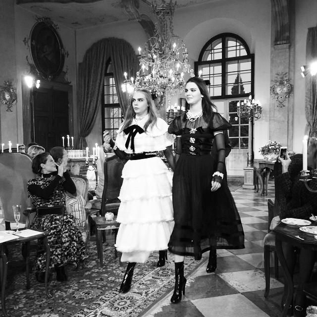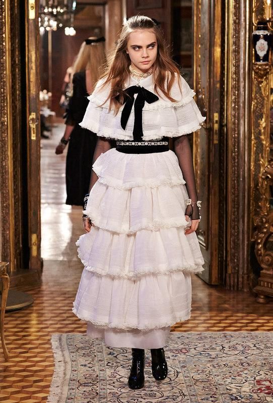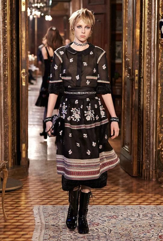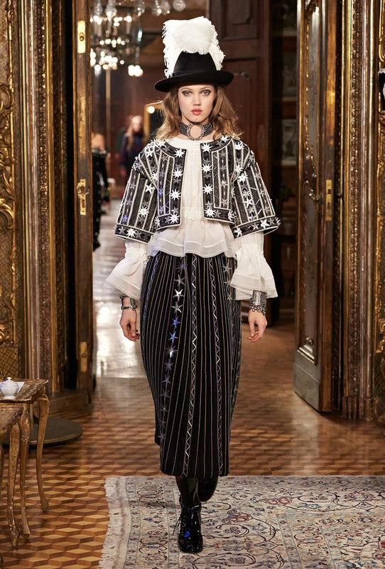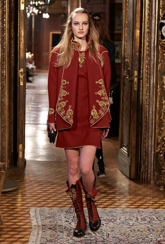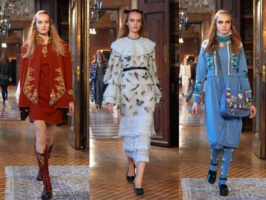 Apre lo show una Lara Stone in un tailleur nero con catene e medaglie tintinnanti, continuano, in contemporanea rilettura della tradizione mitteleuropea, Jamie Bochert, elegante in un abito da sera nero con un mantello, Lindsey Wixson fata in chiffon blu e l'immancabile Cara Delevingne con un candido vestito a balze.