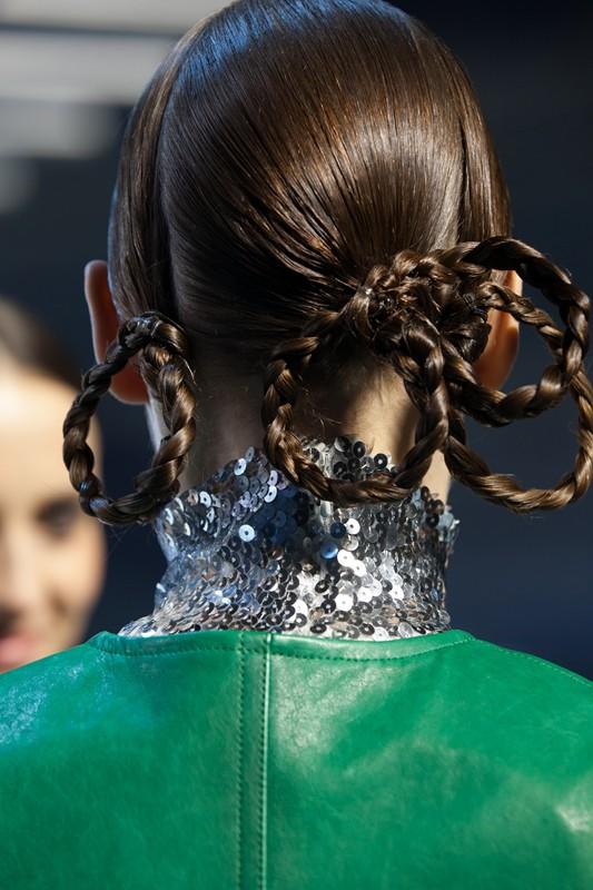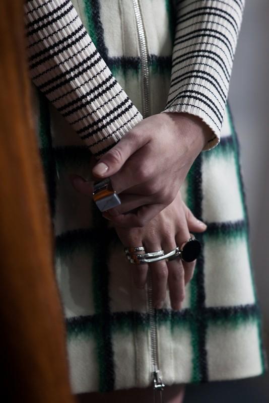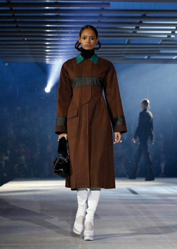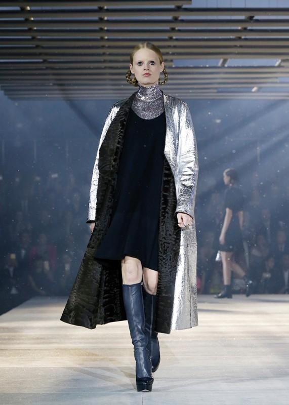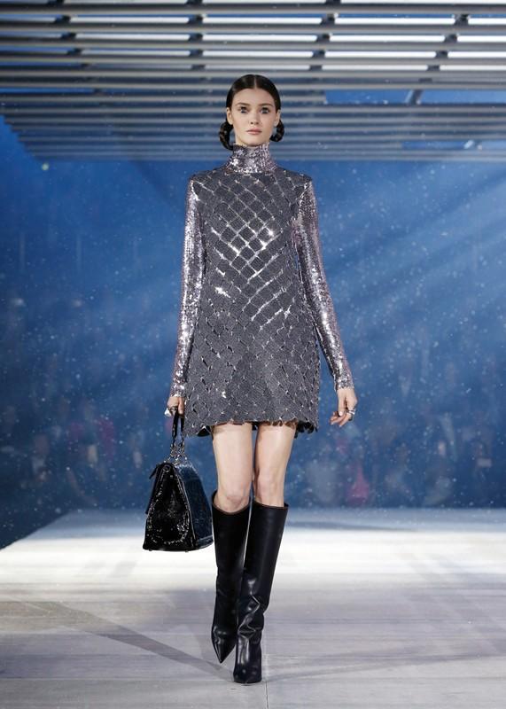 Questo paesaggio urbano astratto, futuristico e cinematografico è lo schermo che riflette le molte ispirazioni di Raf Simons: Blade Runner, lo street style di Tokyo, l'espansione urbana, lo sperimentalismo di Paco Rabanne negli anni Sessanta, una vecchia foto di Serge Gainsbourg e Jane Birkin vestiti di paillettes.