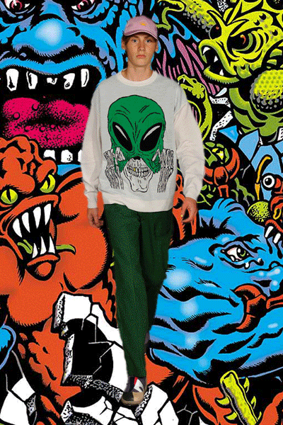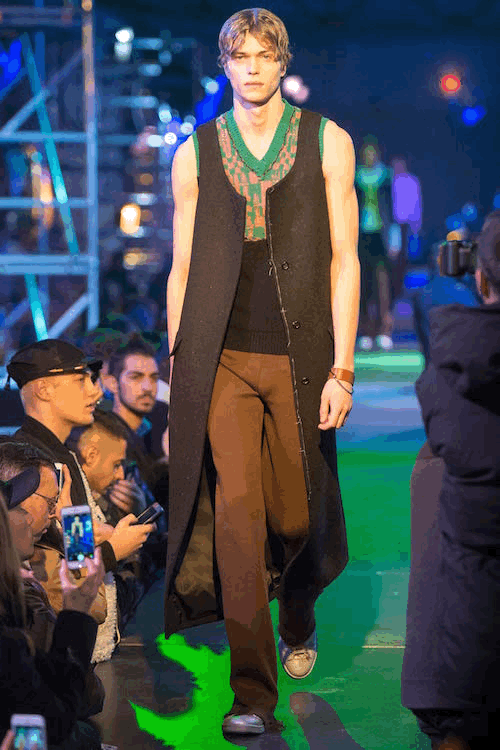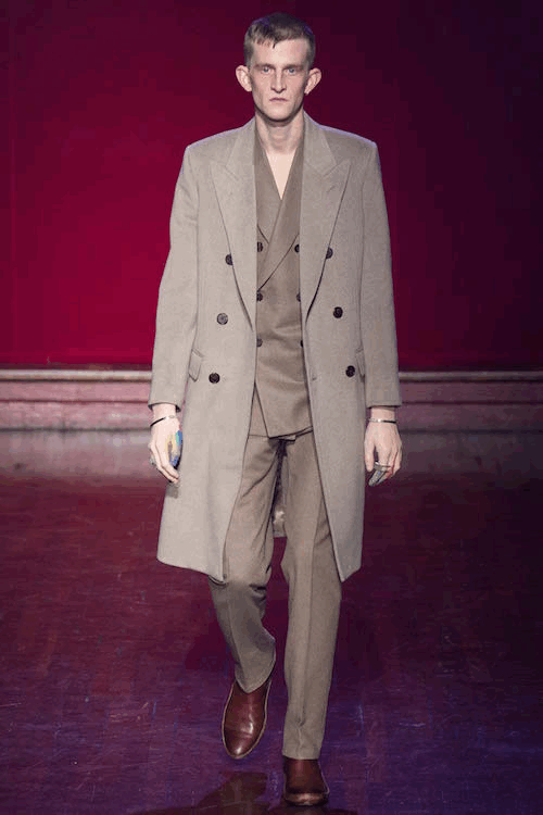 Illuminazione stroboscopica e musica dei Primal Scream disegnano i contorni di una collezione che omaggia gli anni '70s ed il glamour rock di quel periodo. Nessun total look, ma un mix eterogeneo di pezzi: maglie in lurex e pantaloni sartoriali, gilet oversize e skinny floreali, caban col collo in pelliccia e peacoat patchwork.