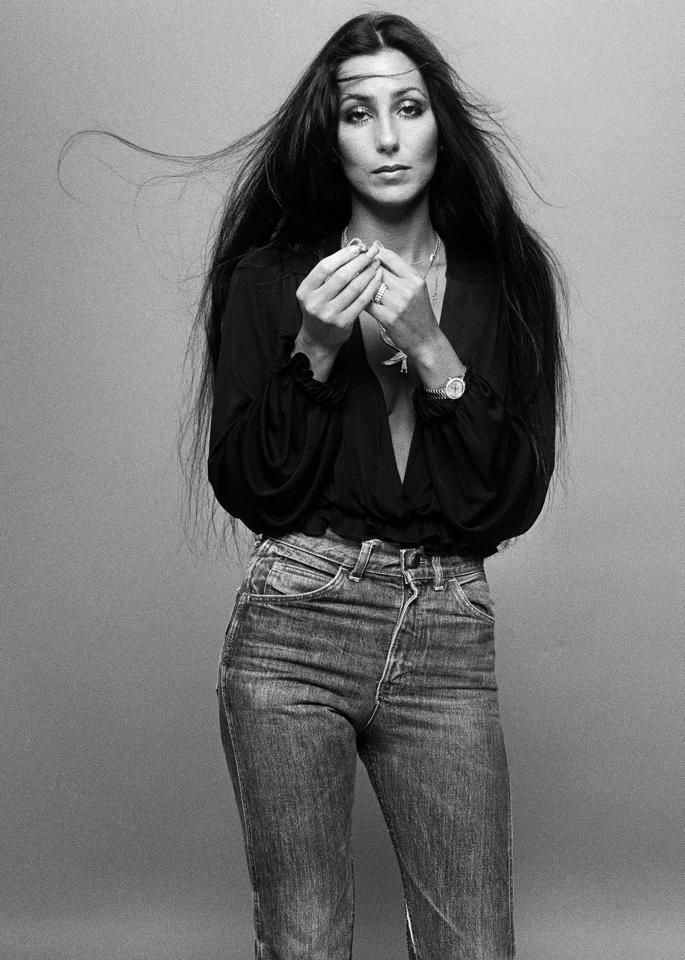 Jeans, blusa nera, i lunghi capelli ad incorniciarle la figura. Questa immagine del 1975 di Norman Seef commetata dalla stessa star: "In quel periodo indossavo solo i 501. E' quello che mia madre e mia nonna indossavano, e quello che ho messo ai miei figli". Al polso ha un Rolex di diamanti regalo dell'allora fidanzato David Geffen, la collana di Edward Merrifield raffigura la dea egizia Iside.