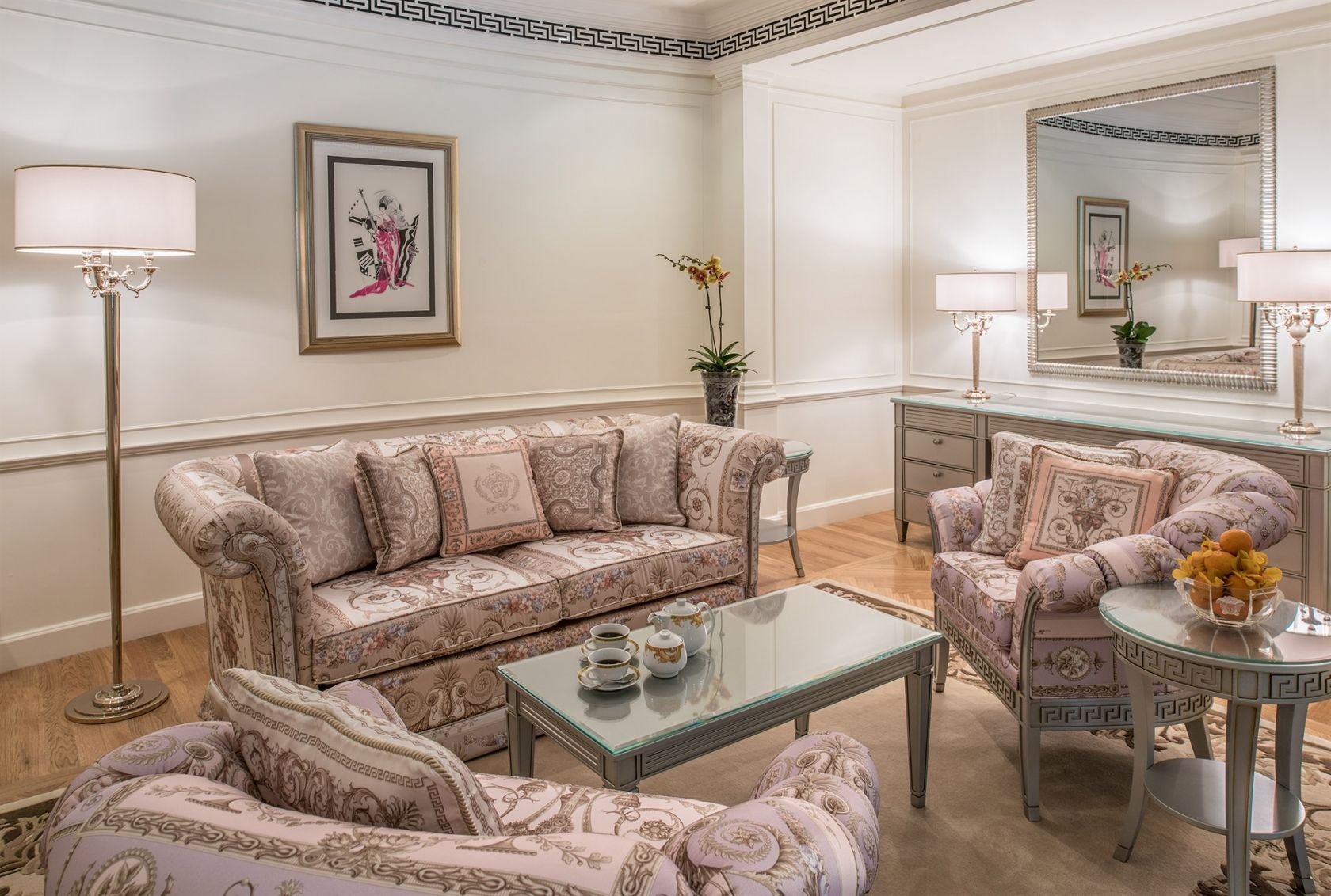 Ogni dettaglio è ricercato ed arredato in stile Versace con gli iconici motivi della maison: Medusa, Greca, Pavone, Falco, Cavallo e altre stampe, alcune realizzate in esclusiva per il palazzo.