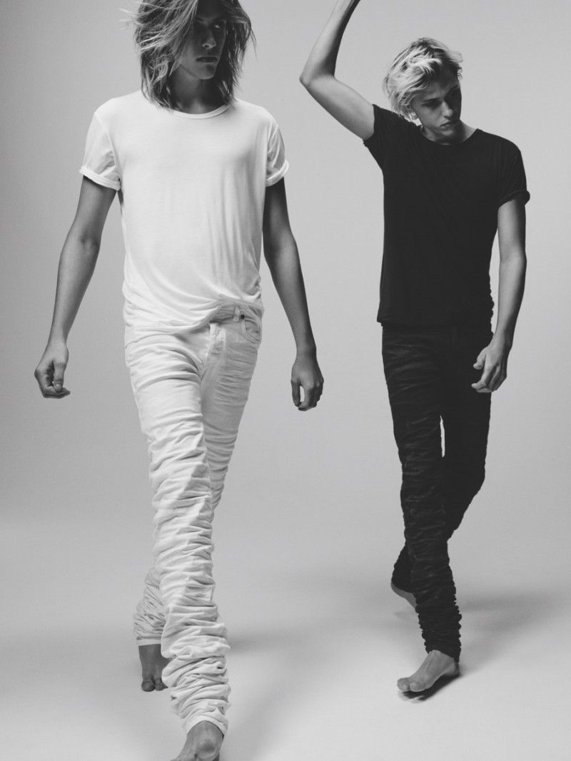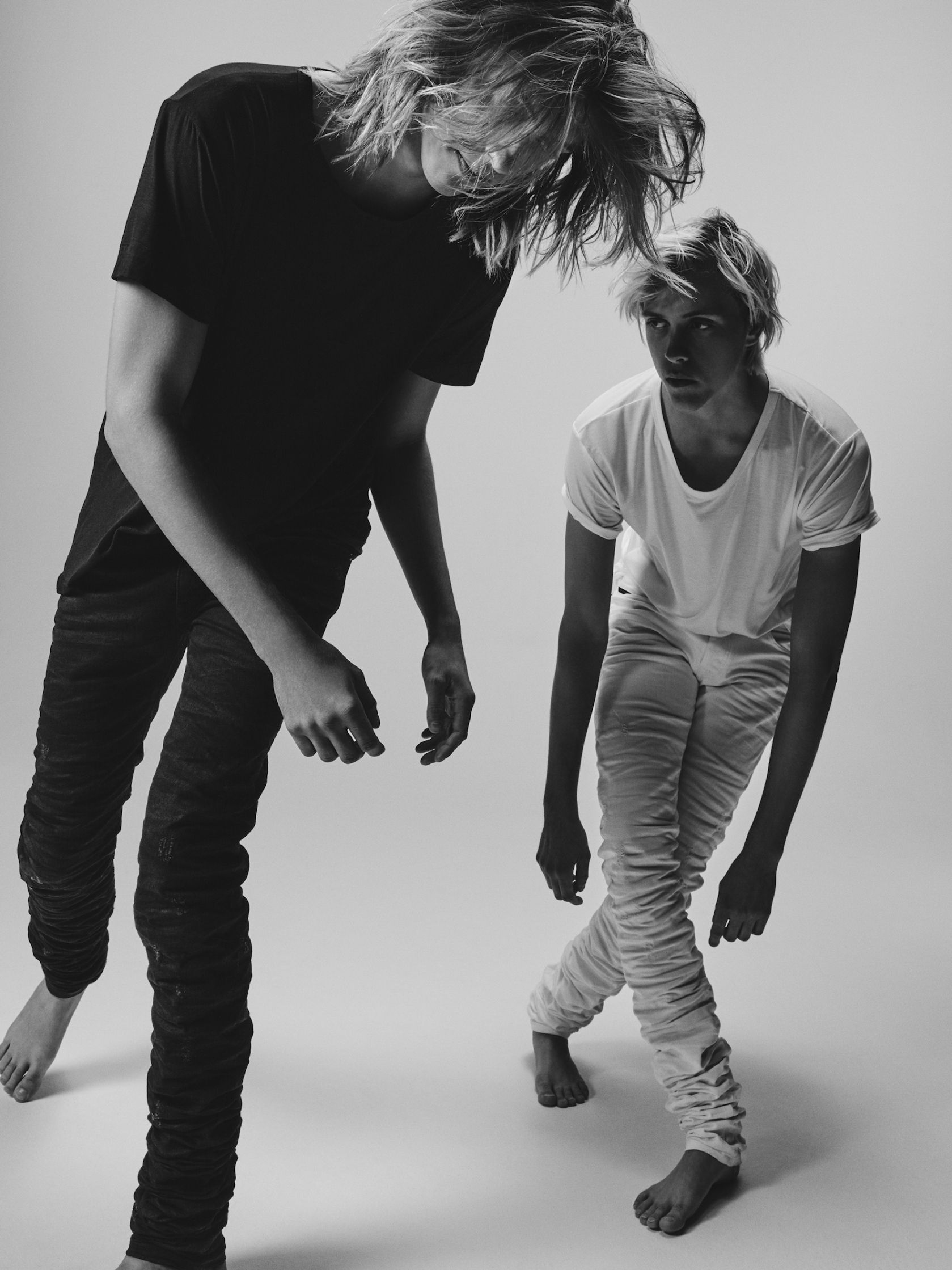 I gemelli più celebri di Los Angeles posano contro uno sfondo candido dinanzi all’obiettivo di Yvan Fabing, in maniera quasi complementare: Fletcher indossa un outfit total white mentre Wyatt sfoggia jeans e t-shirt total black.