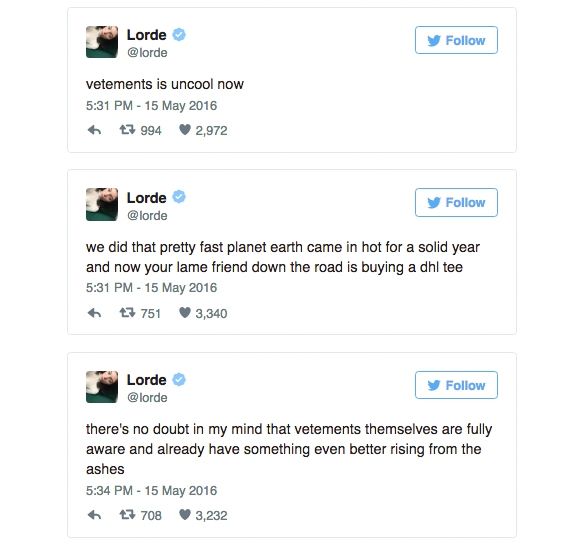 Kanye West non è l'unico che dà libero sfogo alle sue idee su Twitter. Infatti, qualche giorno fa, è stato il turno di Lorde che, con una serie di tweet, ha espresso la sua opinione nei confronti di Vetements.