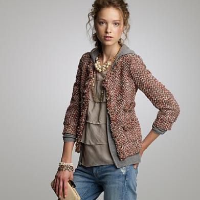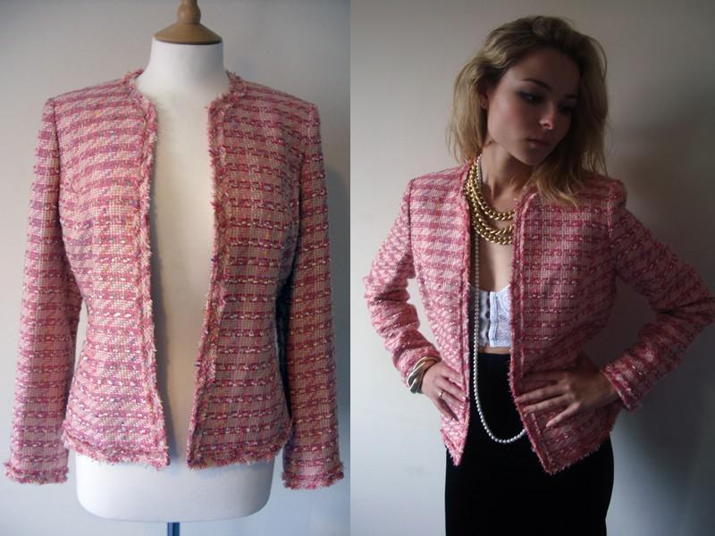 La giacca in questione fa parte del famigerato tailleur di Chanel, lanciato sul mercato a cavallo tra gli anni 20 e 30 del secolo scorso e che non è mai mancato nelle collezioni della maison francese, che si è sempre prodigata per farlo diventare un classico segno di riconoscimento. Ad oggi separata dalla sua gonna, è stata mixata più e più volte in diversi outfits, dando un tocco retrò al look scelto. Definirei fortunate quelle che fra voi ne posseggono una original vintage, agguerrite quelle che ne hanno una delle nuove collezioni, originali chi è ricorsa alla personalizzazione della mitica giacca modello cardigan, che fa subito chanel allure! Declinata nelle tinte classiche del beige, grigio e blu navy, deve il suo successo alla forma corta e squadrata, resa morbida dai tessuti utilizzati da sempre, quali il gabardine, il cheviot, la vigogna ed il tweed. I tratti irrinunciabili, che si ripetono in ogni rivisitazione, sono le tasche quadrate, i bottoni gioiello o profili a contrasto ed il frequente effetto matlasse. Se però non avete il privilegio di una giacca Chanel nell’armadio, se non siete soddisfatte delle proposte cheap dei vari H&M, Zara e Topshop se il banchetto vintage di fiducia è stato già saccheggiato, beh, acquistate una plain e rendetela vostra, con applicazioni evidenti, magari con borchie o lustrini vari, cambiate i bottoni e avrete sicuramente l’approvazione di Mademoiselle!