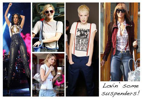 L’ispirazione è facilmente reperibile tra le celebrities: Ashton Kutcher, Fergie, Beyonce, Andre 3000 (per il quale sono quasi un marchio di fabbrica) la bellissima Micha Barton (che le adotta in versione sia street che glam) e Nicole Richie sono solo alcune delle stars che amano le bretelle. Kanye West non vi rinuncia neanche quando non le ha, indossando un maglione che le ricorda nel disegno. Seguite il nostro consiglio, indossate le bretelle!