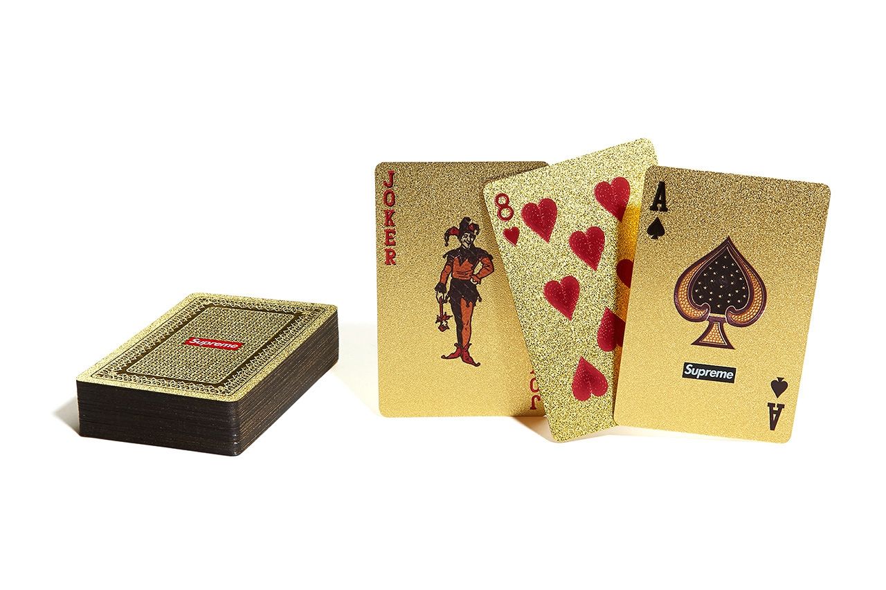 La prima collaborazione tra Supreme e Biclyce, il marchio americano di carte da gioco, risale al 2009. Ne seguirono altre, fino a quella del 2013 con un mazzo di carte da gioco dorate.