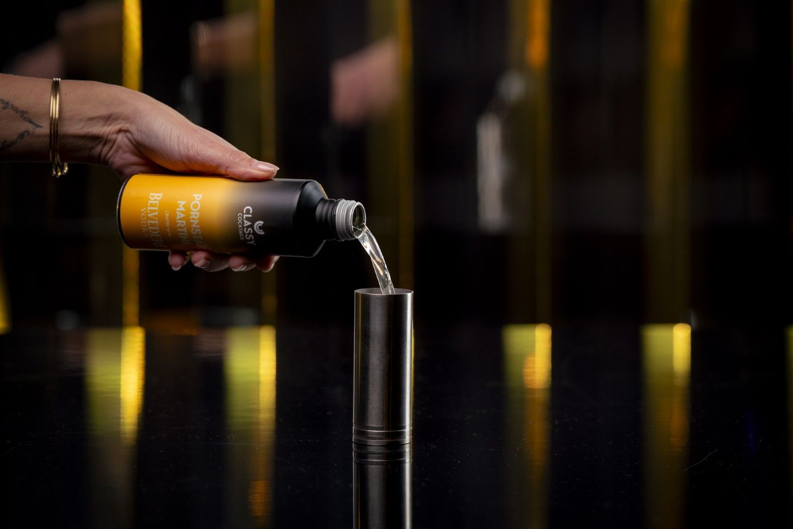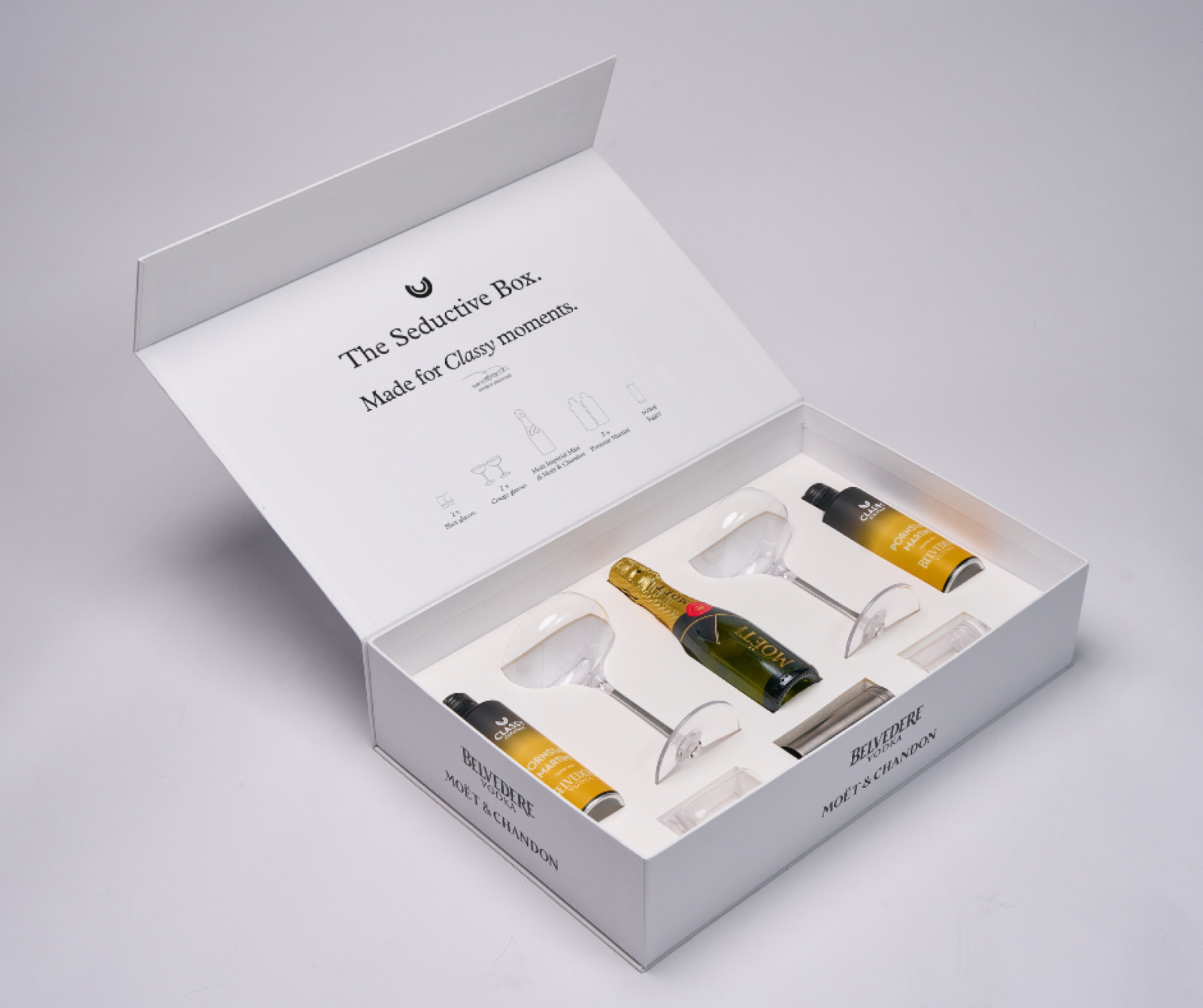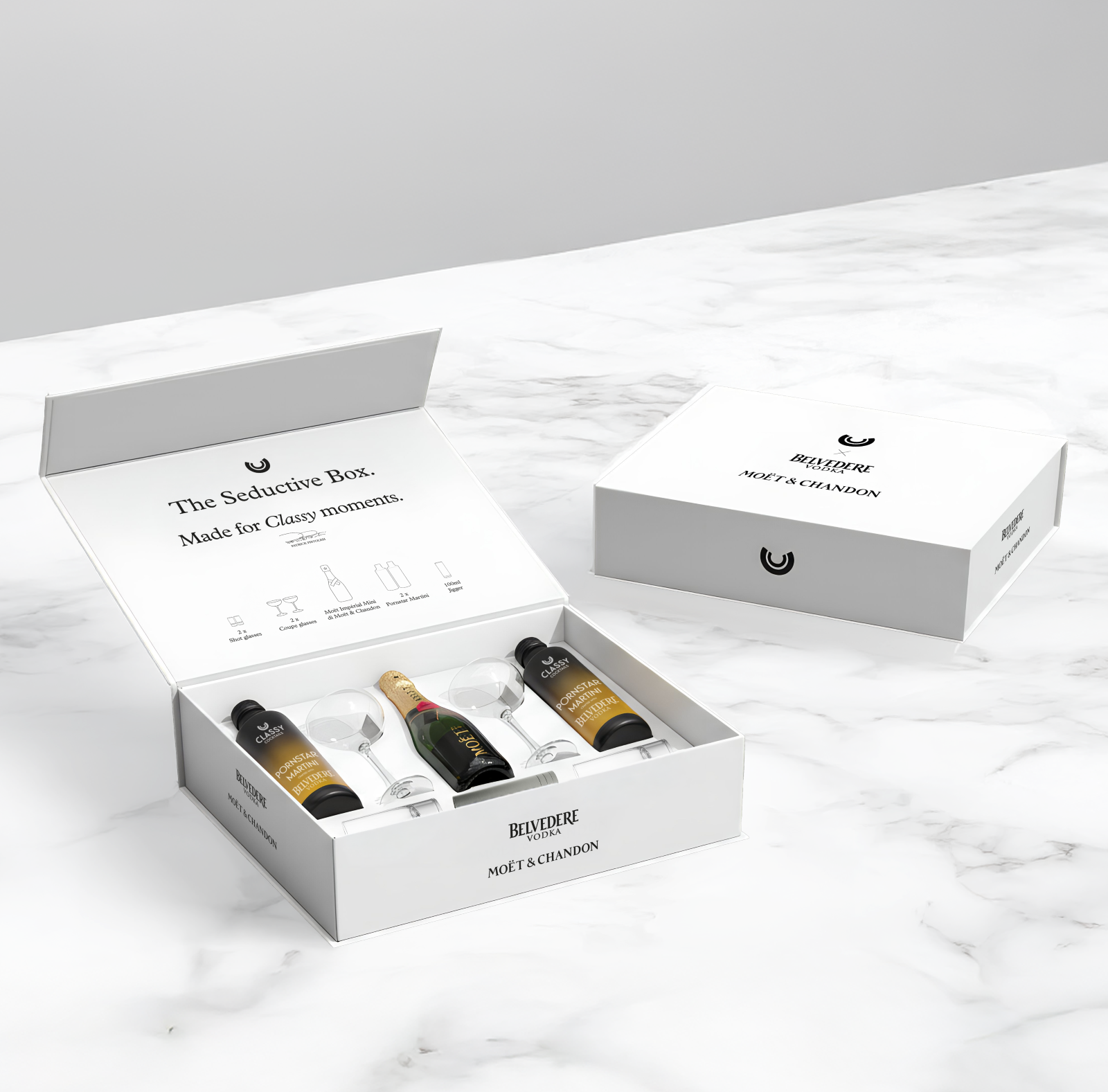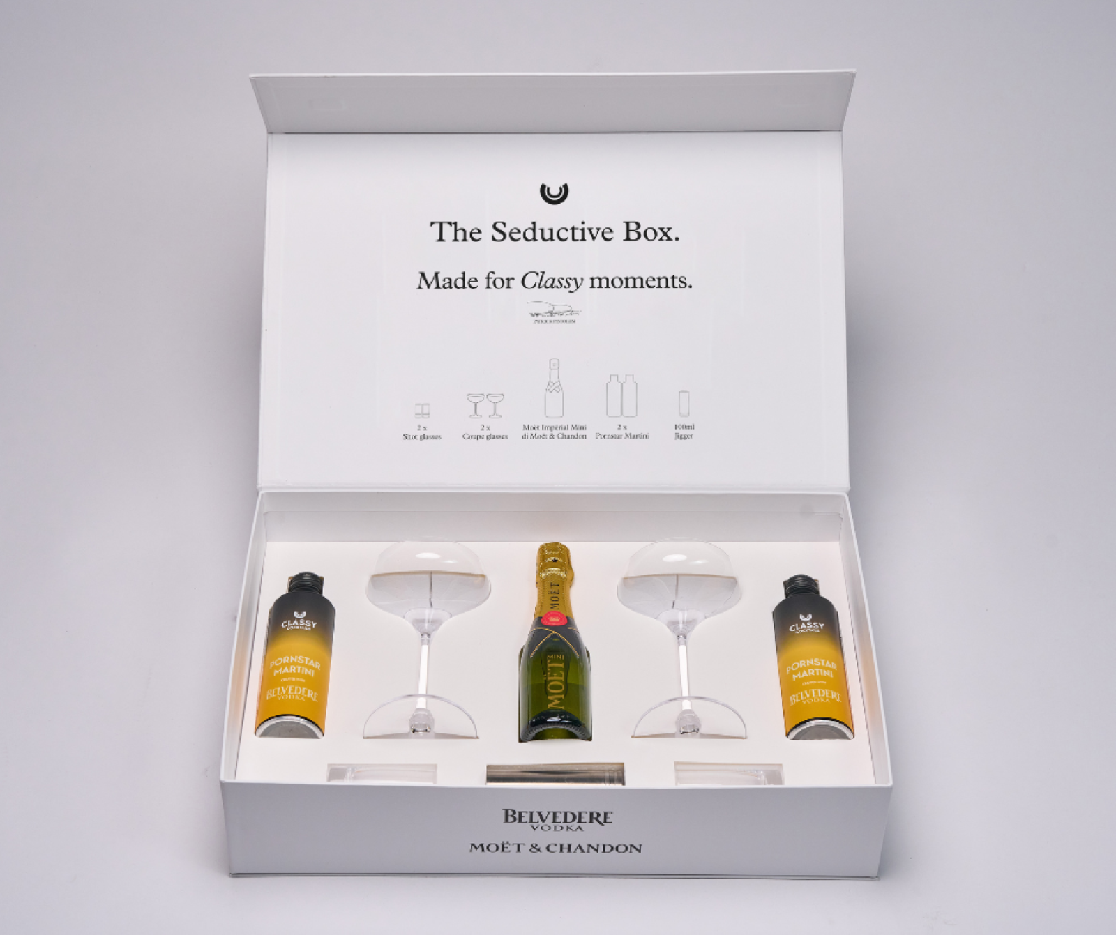 La Seductive Box è curata nei minimi dettagli che include due bottiglie di Classy Cocktails Pornstar Martini pronti da versare, a base di Belvedere Vodka; una mini bottiglia di Moët Impérial; due 2 coupe glasses con altrettanti bicchieri da shot e un jigger da 100 ml per misurazioni precise. Il rituale è semplice e affascinante: basterà agitare il cocktail, versarlo nelle coupe, e alternare sorsi con lo shot di Champagne, proprio come nell'originale concezione di Ankrah. Questo gesto non è solo una preparazione, ma un momento di connessione sensuale e condivisa, ideale per cene romantiche o serate tra amici.