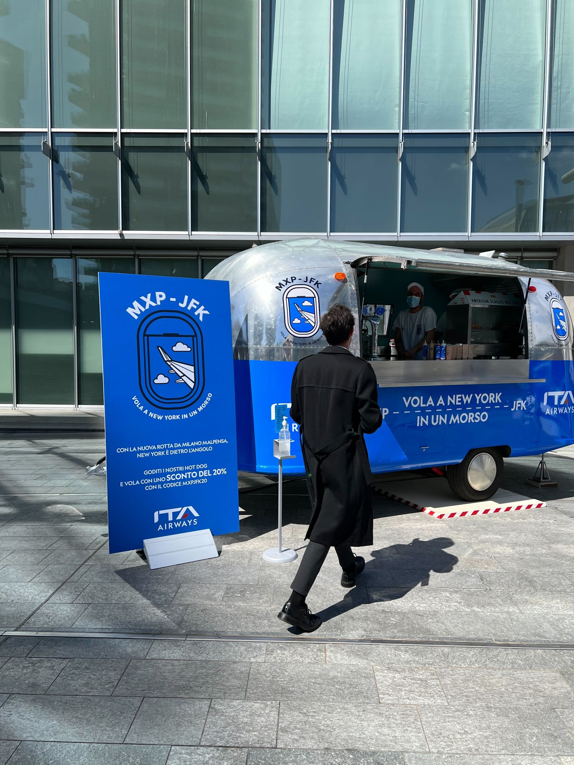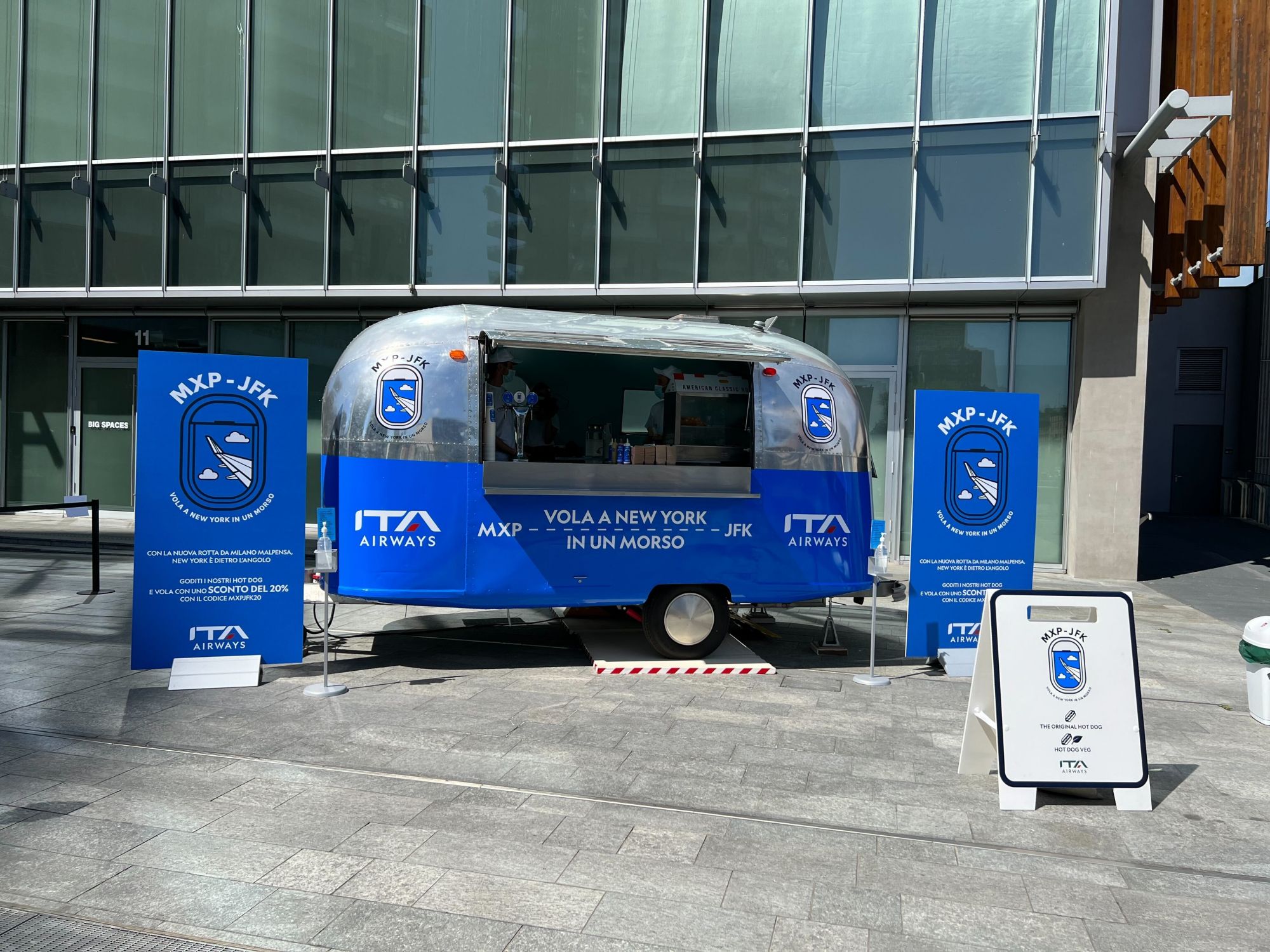 Un soffice panino dalla Grande Mela per ricordarci come i confini e le distanze siano labili nel mondo moderno e quanto NY sia davvero dietro l'angolo: da venerdì 8 a sabato 9 aprile un hot dog cart newyorkese brandizzato ITA Airways regalerà panini ai passanti di una zona trafficata di Milano con l’obiettivo di intercettare viaggiatori entusiasti pronti ad inseguire, anche se per poco, il sogno americano. Per tutti quelli che passeranno all'evento sarà disponibile un codice sconto spendibile sulla rotta MXP/JFK di ITA Airways, un tragitto già inaugurato lo scorso 2 aprile con il volo passeggeri per JFK su un Airbus A330-200, decollato dall’aeroporto di Malpensa alle 13.40 per atterrare negli Usa alle 17 (ora locale, le 23 in Italia).