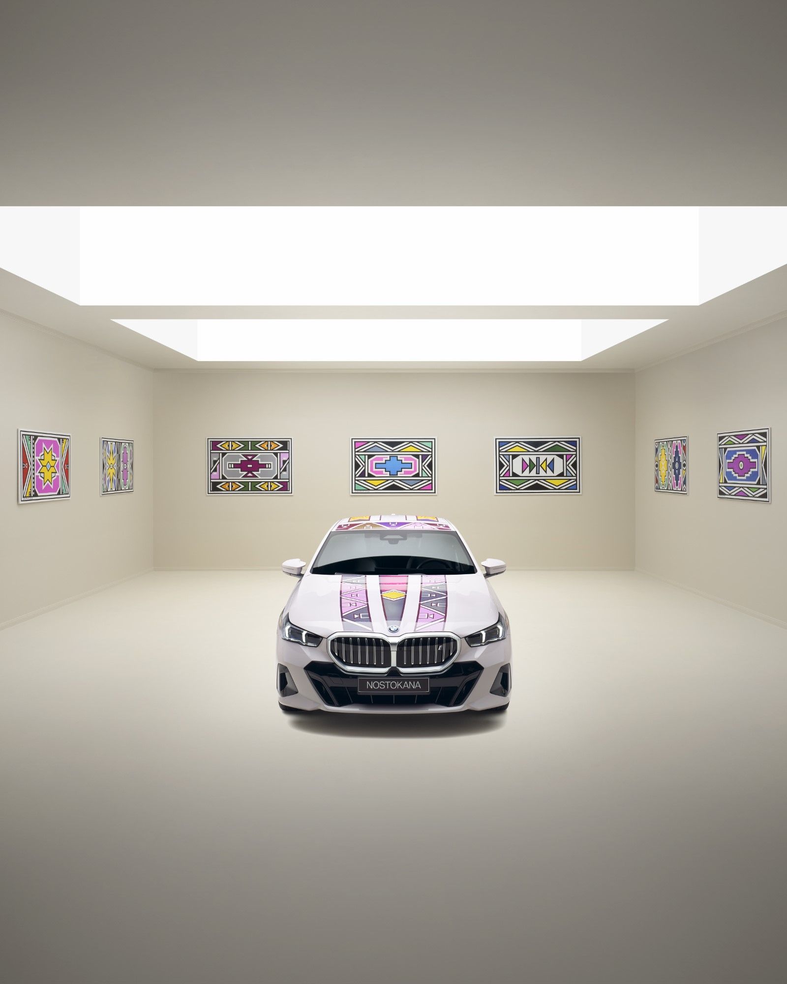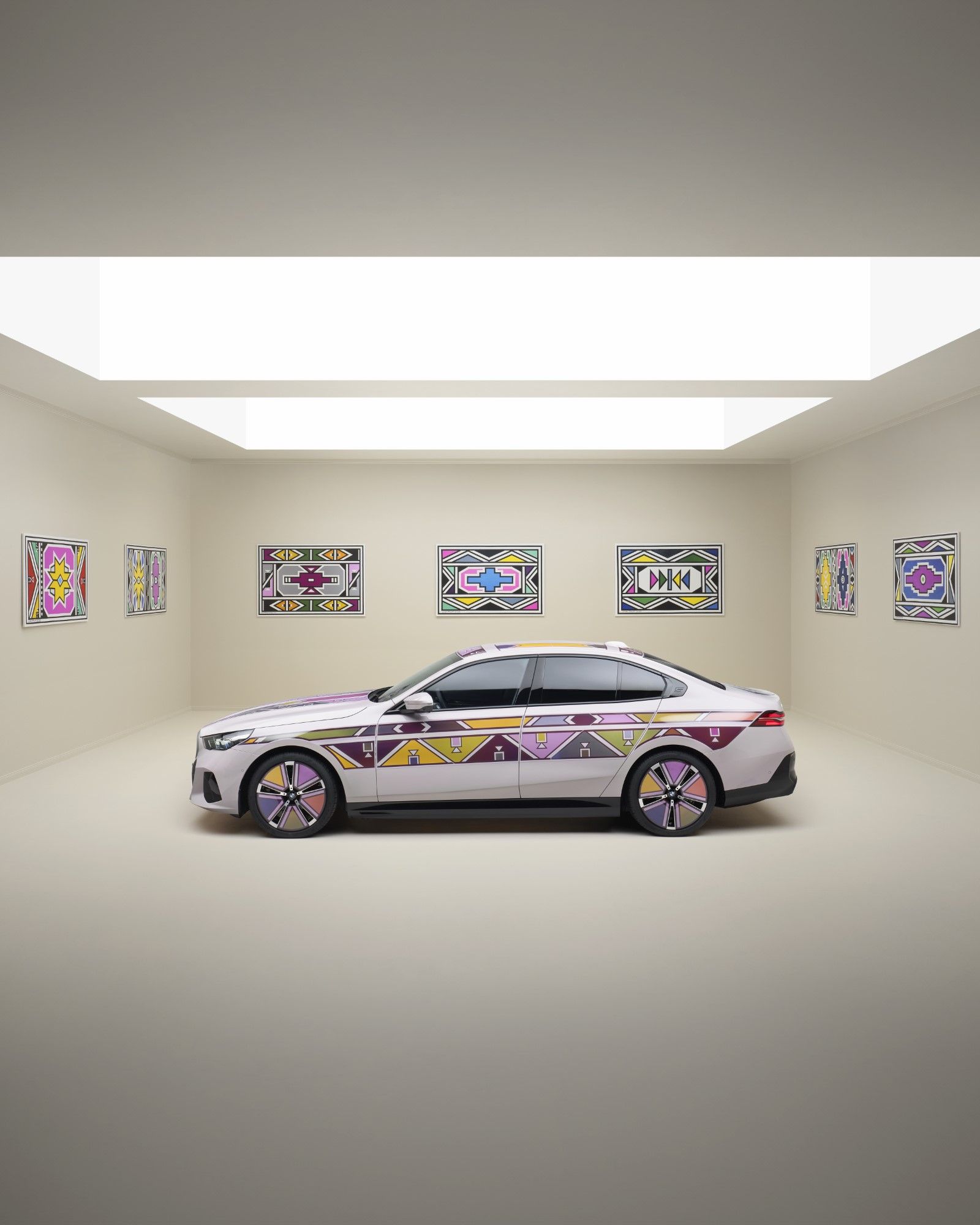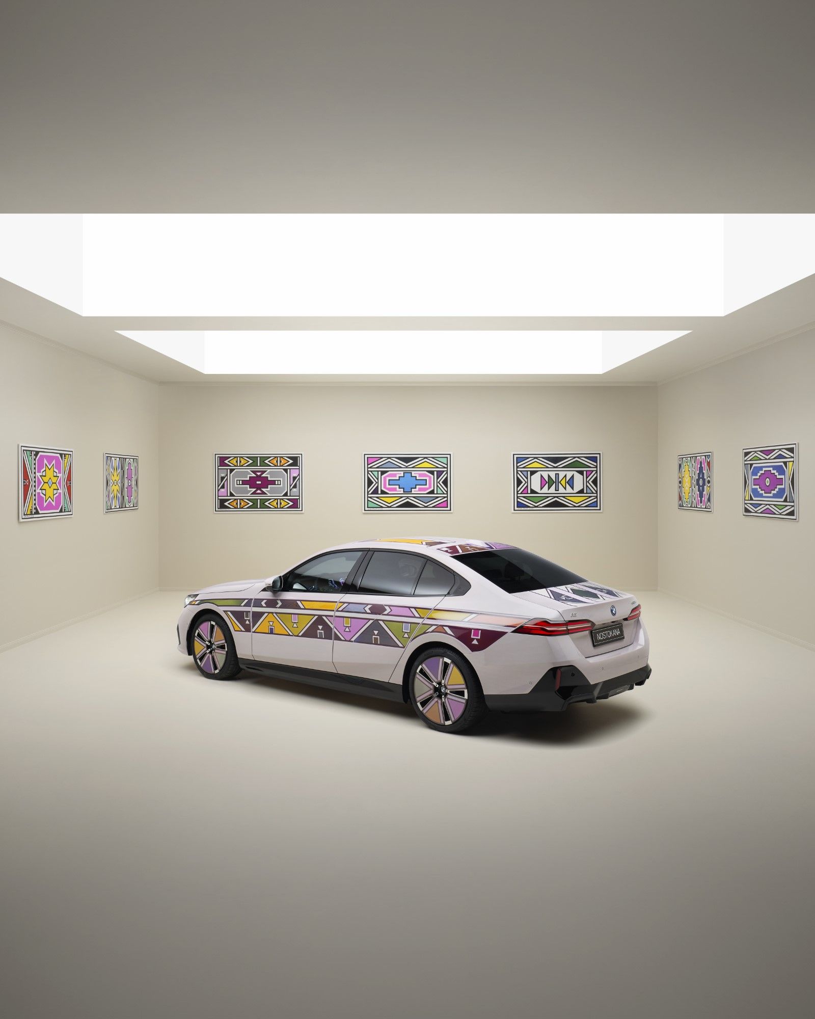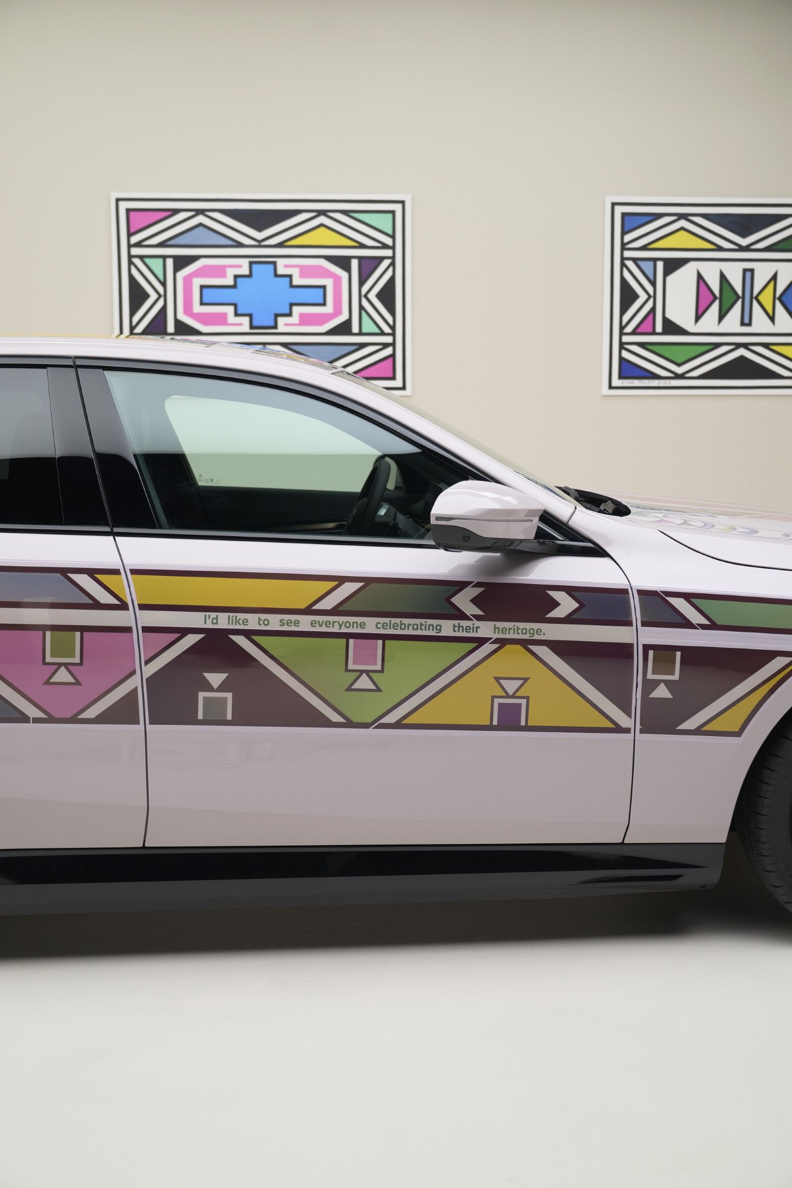 L'arte di Mahlangu trae ispirazione dai motivi intricati trovati negli abiti e nei gioielli tradizionali del popolo Ndebele. Conosciuta per le sue composizioni vibranti e geometriche, le sue opere spesso occupano tele di grandi dimensioni. Il suo approccio prevede la trasposizione dell'arte murale tradizionale Ndebele, realizzata tradizionalmente su pareti di adobe ricoperte di letame di mucca, su varie superfici come tela e leghe metalliche. Uno dei suoi marchi distintivi è l'incorporazione di linee bianche incorniciate disposte diagonalmente o a forma di chevron, un motivo che firma con le iniziali "E M" in perline. Questo genio artistico di 88 anni si manifesta in ogni dettaglio della BMW i5 Flow NOSTOKANA, dove i suoi colori e motivi geometrici distintivi prendono vita attraverso sezioni di pellicola animate elettronicamente che adornano l'esterno del veicolo. Questo uso innovativo dei cambiamenti di colore elettroforetici non solo rende omaggio al suo patrimonio, ma trasforma anche la berlina in un'opera d'arte dinamica, catturando gli spettatori con le sue composizioni sempre mutevoli.