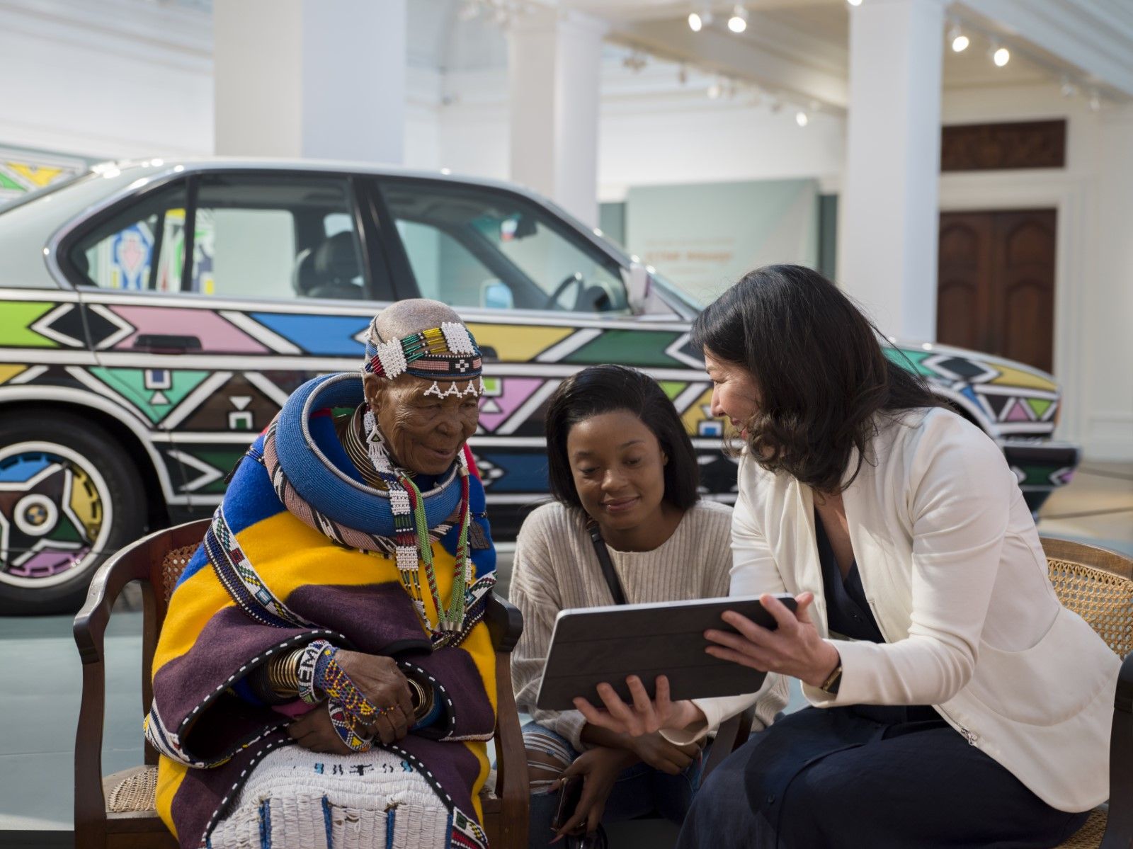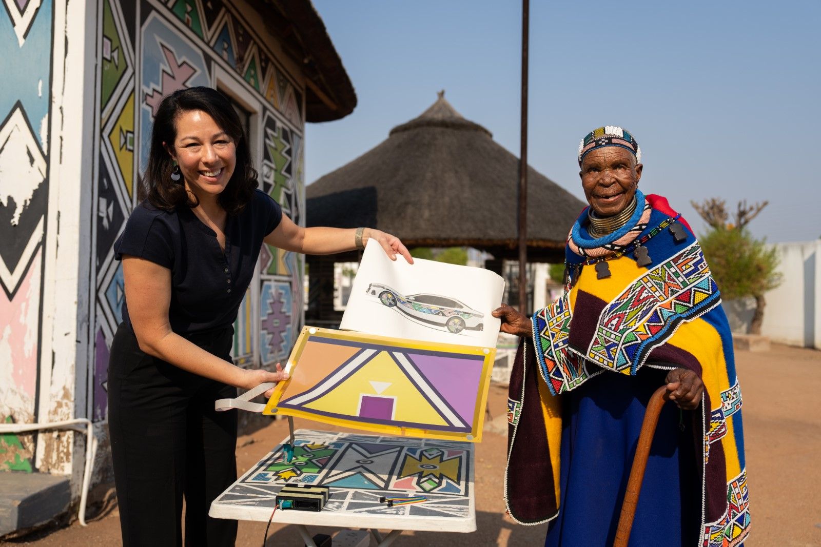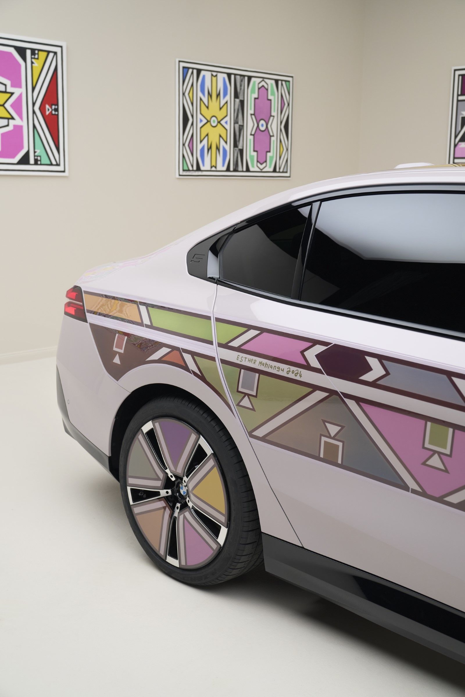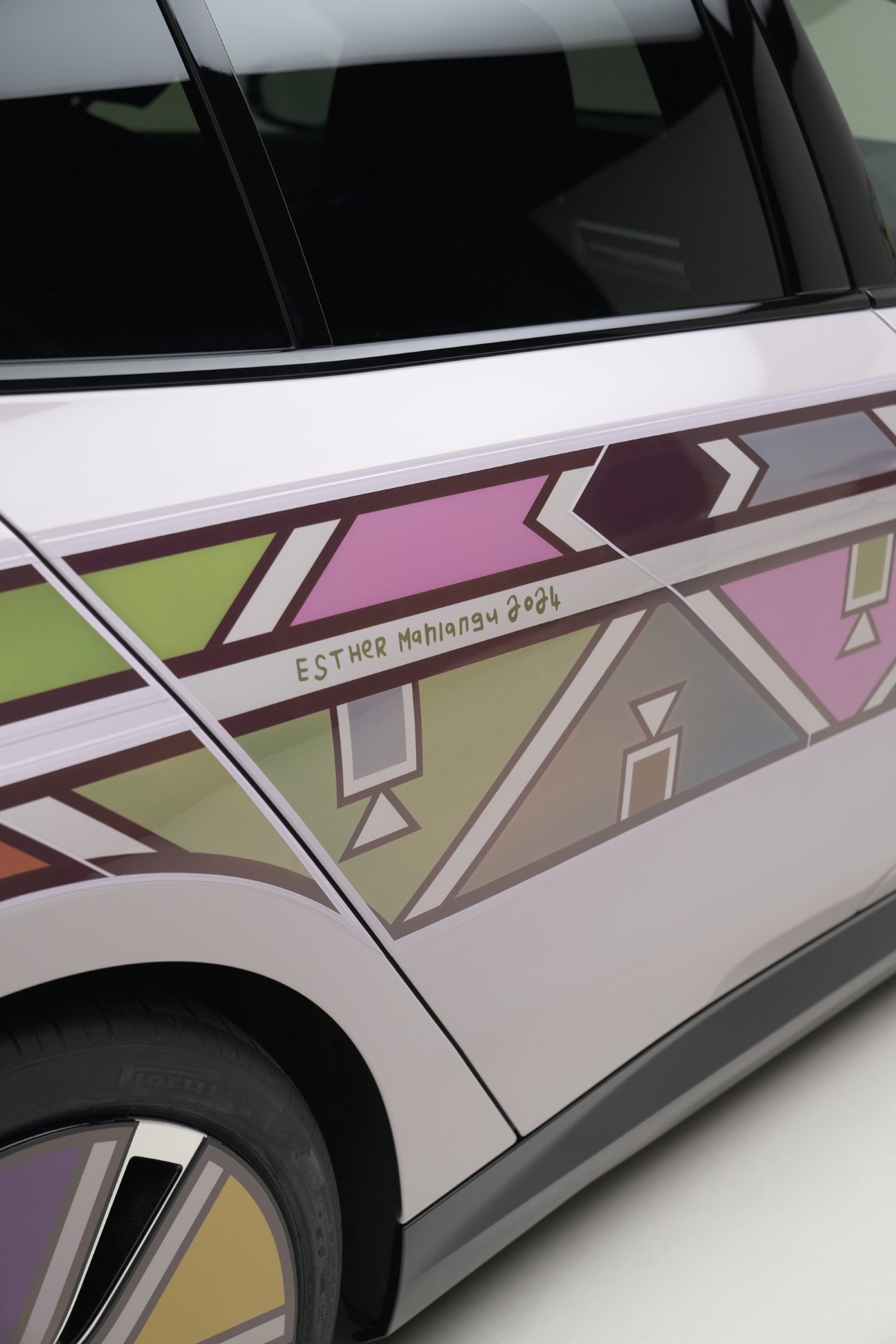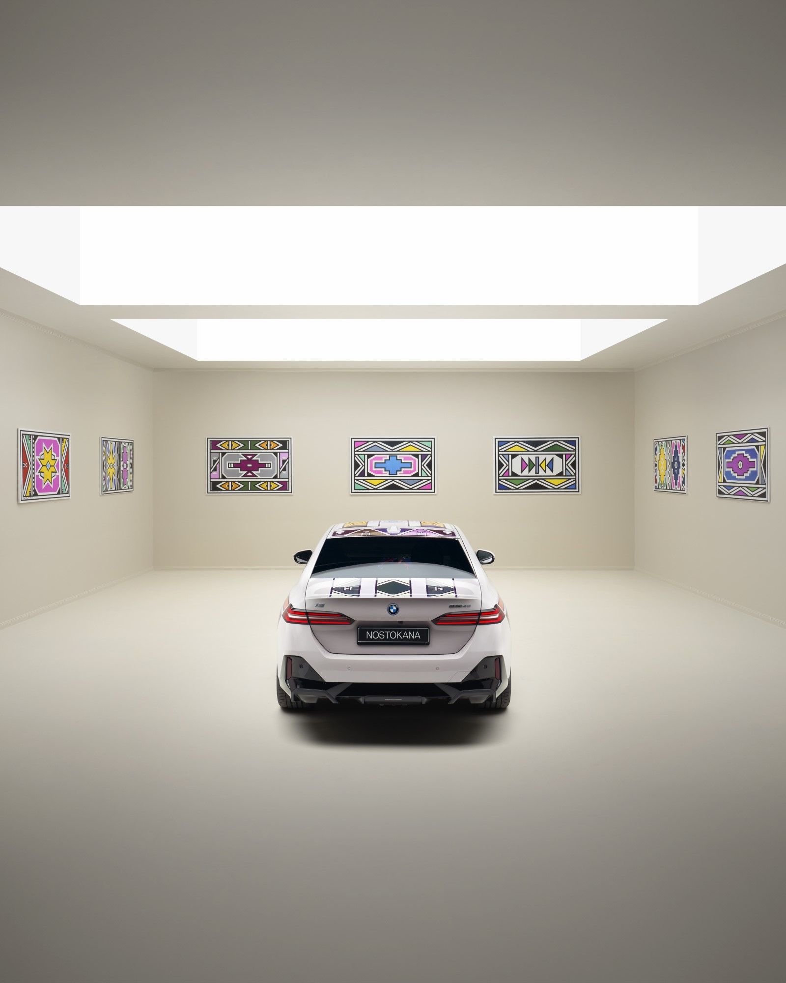 L'arte di Mahlangu trae ispirazione dai motivi intricati trovati negli abiti e nei gioielli tradizionali del popolo Ndebele. Conosciuta per le sue composizioni vibranti e geometriche, le sue opere spesso occupano tele di grandi dimensioni. Il suo approccio prevede la trasposizione dell'arte murale tradizionale Ndebele, realizzata tradizionalmente su pareti di adobe ricoperte di letame di mucca, su varie superfici come tela e leghe metalliche. Uno dei suoi marchi distintivi è l'incorporazione di linee bianche incorniciate disposte diagonalmente o a forma di chevron, un motivo che firma con le iniziali "E M" in perline. Questo genio artistico di 88 anni si manifesta in ogni dettaglio della BMW i5 Flow NOSTOKANA, dove i suoi colori e motivi geometrici distintivi prendono vita attraverso sezioni di pellicola animate elettronicamente che adornano l'esterno del veicolo. Questo uso innovativo dei cambiamenti di colore elettroforetici non solo rende omaggio al suo patrimonio, ma trasforma anche la berlina in un'opera d'arte dinamica, catturando gli spettatori con le sue composizioni sempre mutevoli.