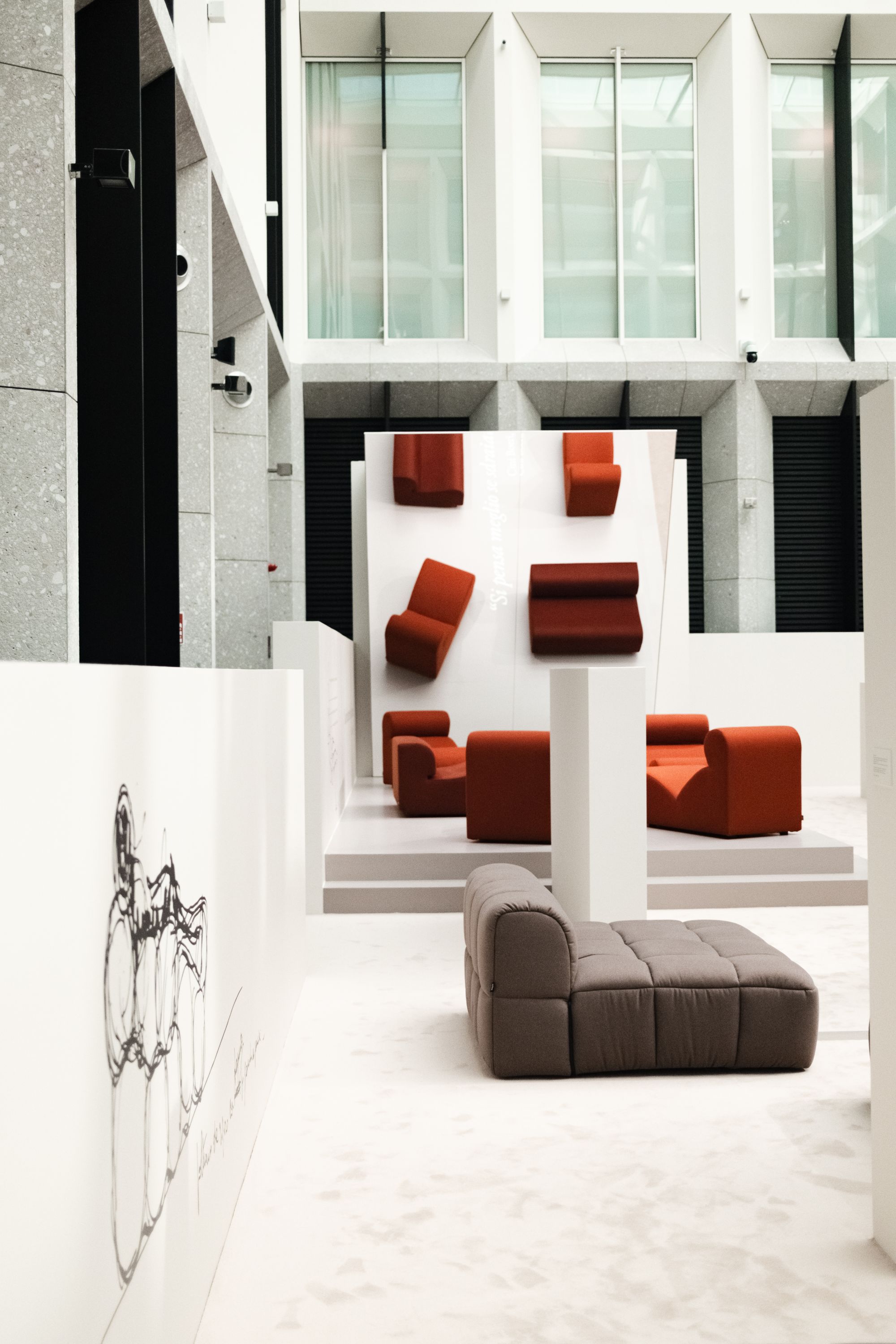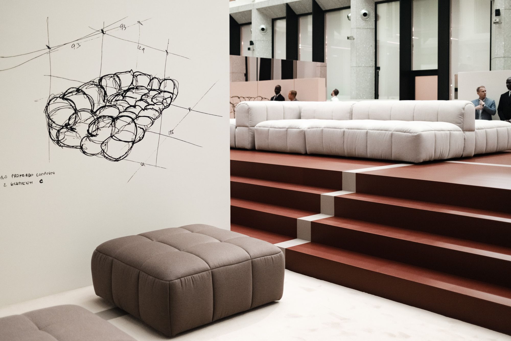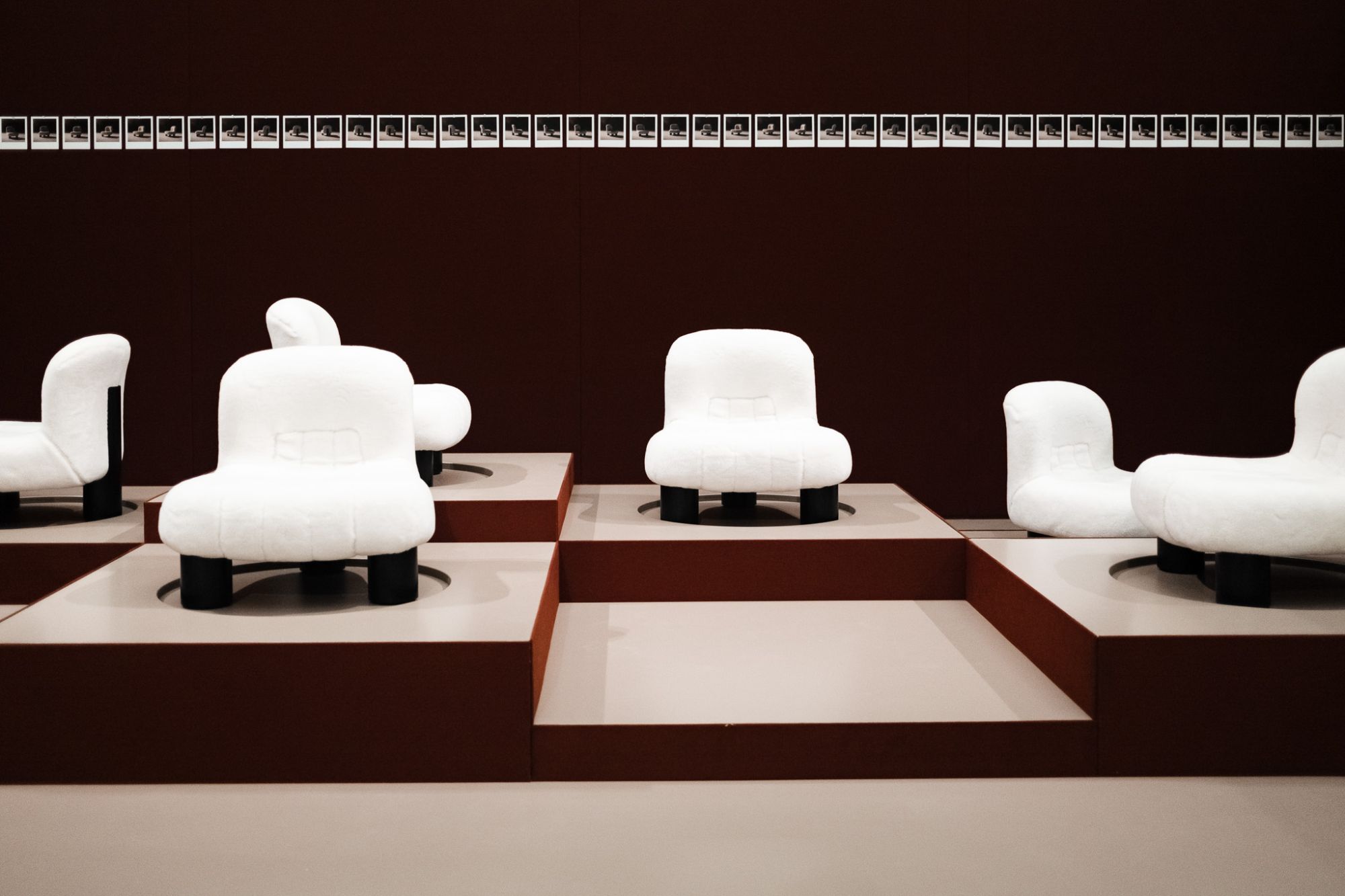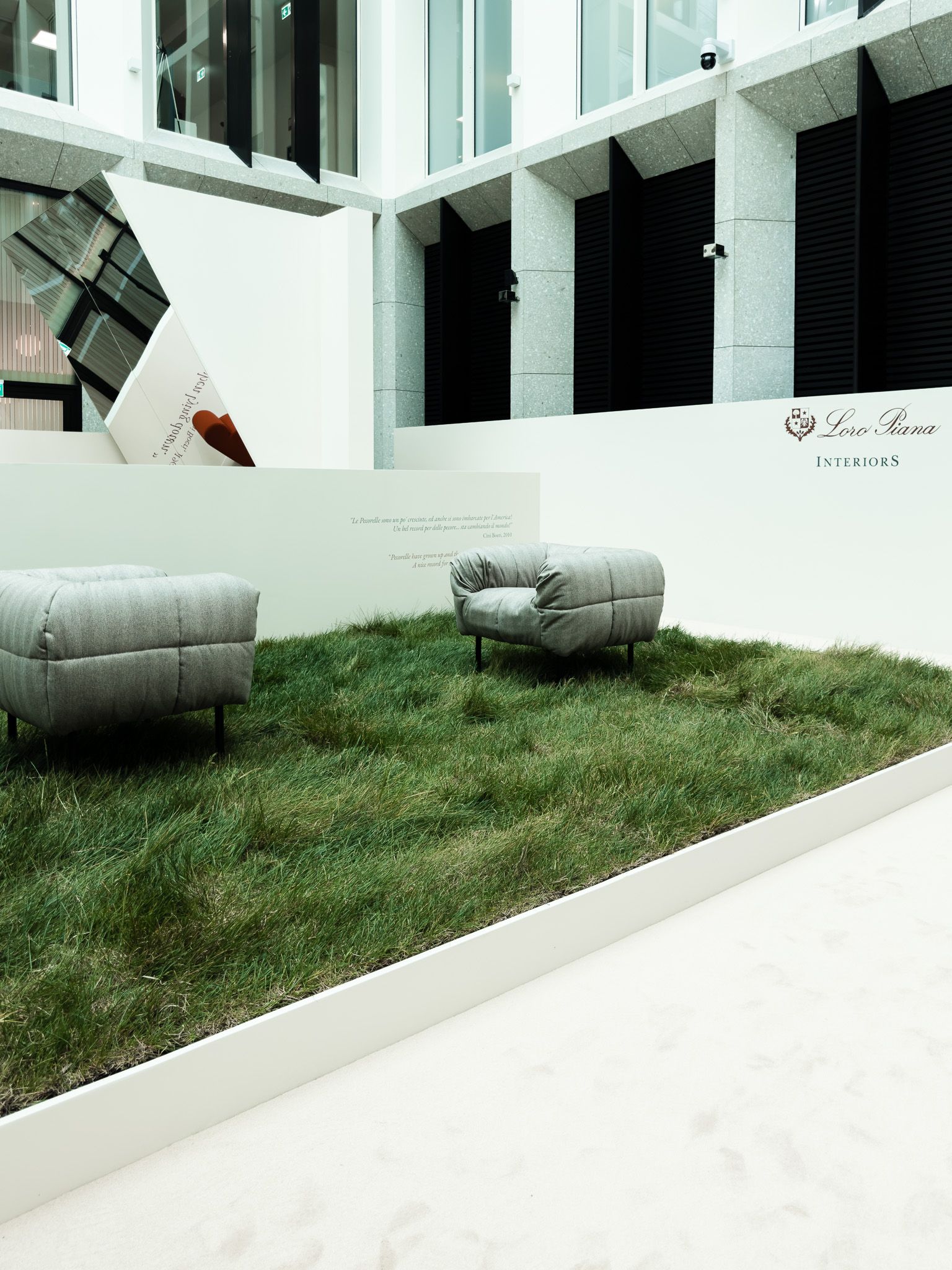 L'installazione, creata in collaborazione con l'Archivio Cini Boeri, segue uno dei principi guida della filosofia della leggendaria architetta: l'idea della casa con stanze separate rappresentate da diverse piattaforme attraverso cui muoversi e un'area comune, dove gli abitanti si riuniscono per scelta, non per imposizione. L'area centrale dell’exhibition ospita il celeberrimo sistema Strips, mentre gli ambienti circostanti sono dedicati a diverse famiglie di prodotti la cui comunanza è espressa dal fatto che i diversi ambienti sono collegati a un nucleo centrale. Il percorso è interattivo e invita gli ospiti a sperimentare la forma dei mobili e la texture dei tessuti che li foderano e a interagire con essi, seguendo l'insegnamento di Cini Boeri che voleva mobili in grado di adattarsi alle esigenze degli utilizzatori. Esplorando le diverse sezioni dell’installazione, i visitatori scopriranno una vera antologia dei migliori lavori firmati da Cini Boeri: il già citato sistema modulare Strips, vincitore del Compasso d'Oro nel 1979; il letto Strips, le poltrone Pecorelle, Bobo e Boborelax e le sedie Botolo alte e basse. Queste ultime sedute, nello specifico, sono rivestite con il morbido Cashfur in cashmere e seta, dando vita a una serie limitata di 100 pezzi che rappresenta anche la creazione di un vero pezzo da collezione. Per il divano modulare Strips, invece, è stato scelto il Cashmere Raw, mentre il letto Strips ricoperto da una trapunta che si estende a ricoprire l'intero pavimento della sezione è rivestito in lana Tiepolo. Le poltrone Pecorelle, esposte su un prato erboso, sono invece rivestite dal tessuto Pecora Nera®, ottenuto dal vello di pecore merino neozelandesi.