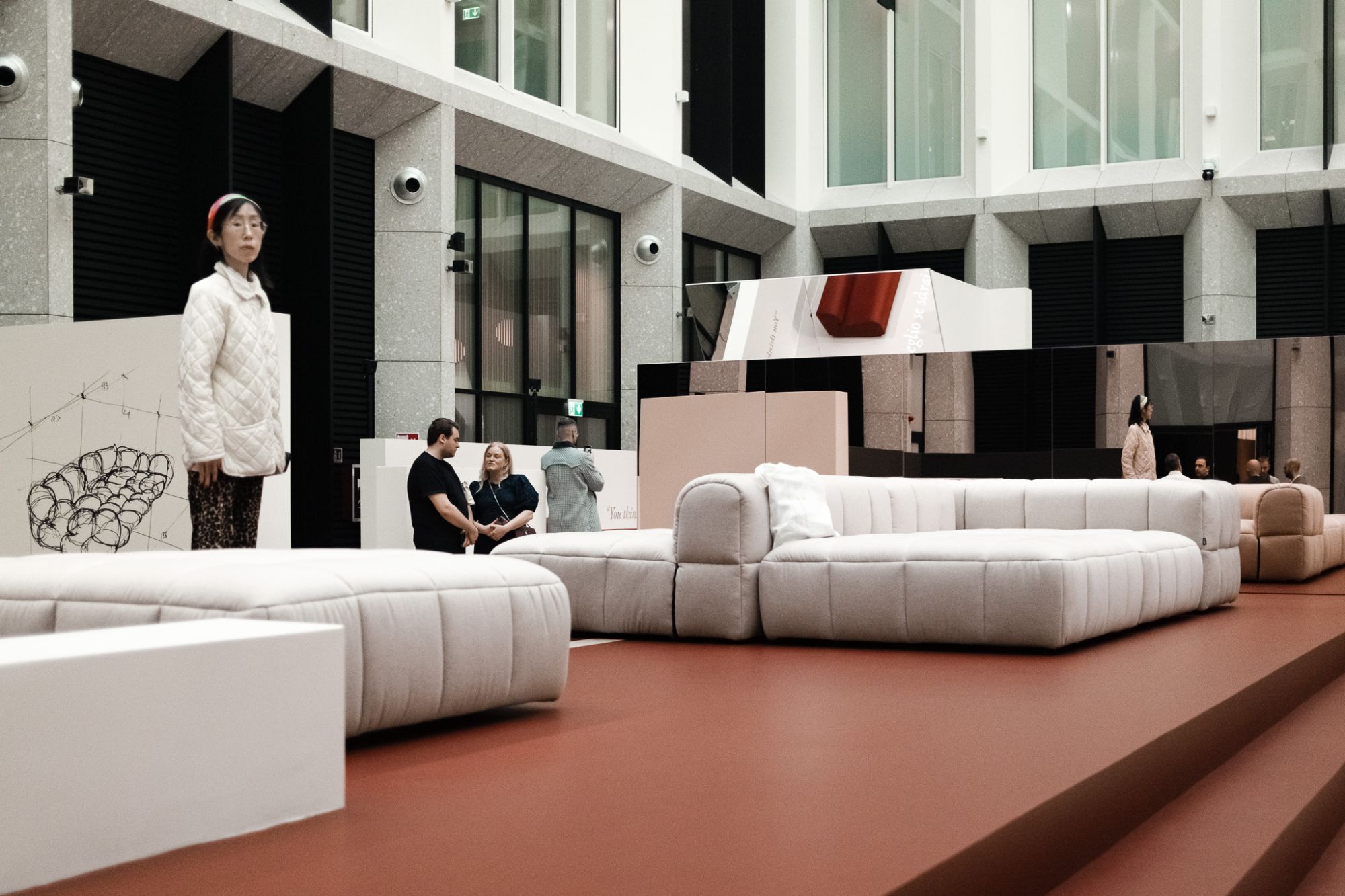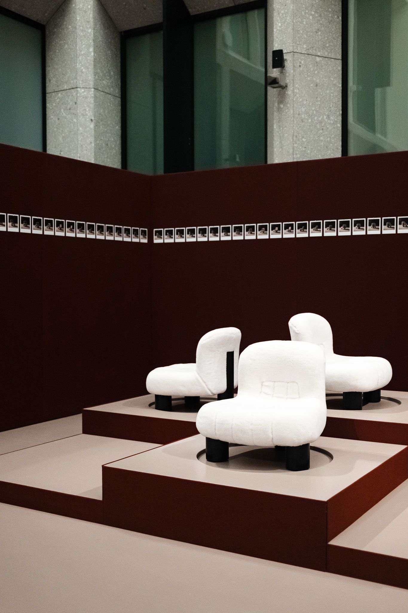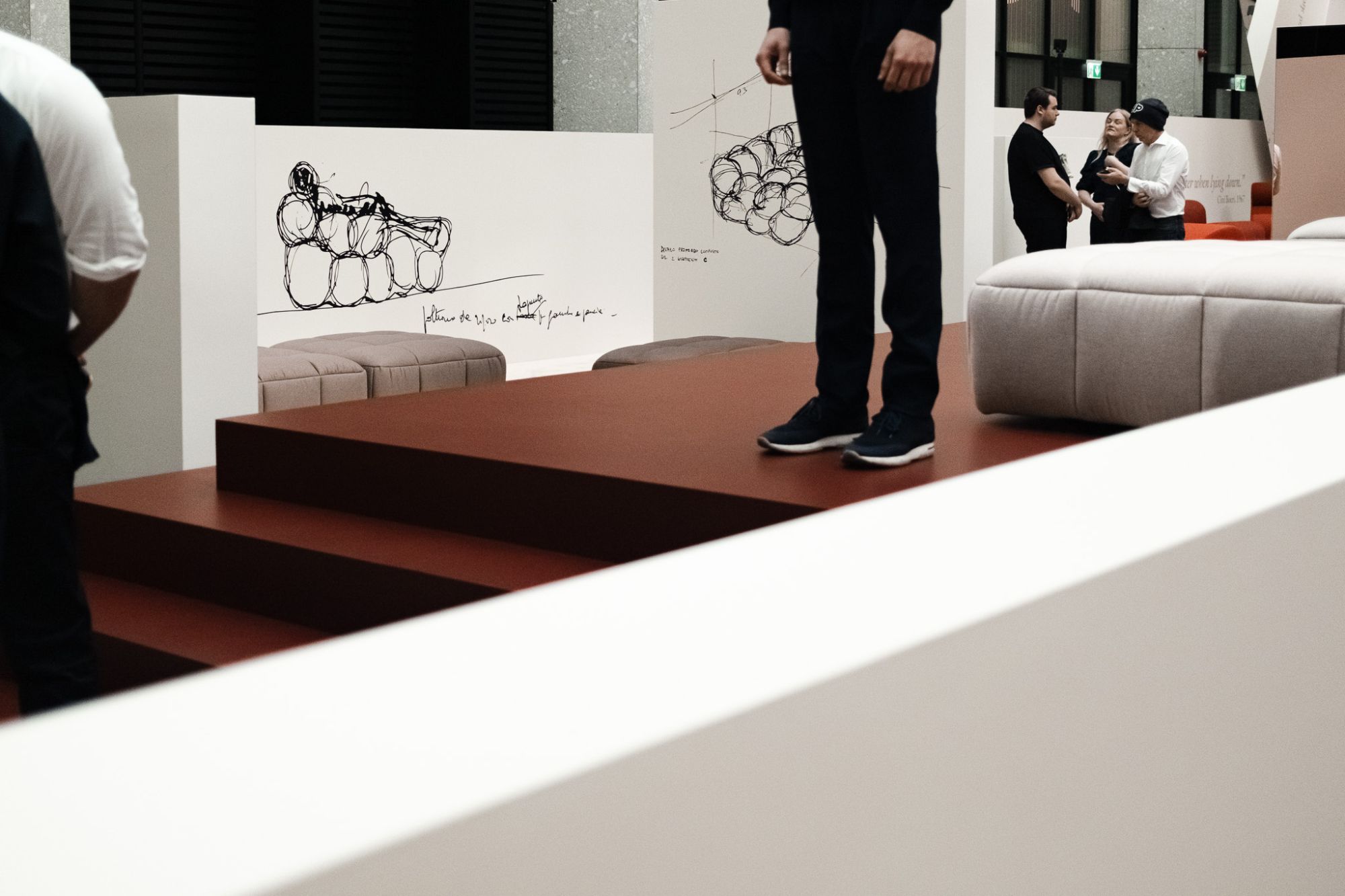 L'installazione, creata in collaborazione con l'Archivio Cini Boeri, segue uno dei principi guida della filosofia della leggendaria architetta: l'idea della casa con stanze separate rappresentate da diverse piattaforme attraverso cui muoversi e un'area comune, dove gli abitanti si riuniscono per scelta, non per imposizione. L'area centrale dell’exhibition ospita il celeberrimo sistema Strips, mentre gli ambienti circostanti sono dedicati a diverse famiglie di prodotti la cui comunanza è espressa dal fatto che i diversi ambienti sono collegati a un nucleo centrale. Il percorso è interattivo e invita gli ospiti a sperimentare la forma dei mobili e la texture dei tessuti che li foderano e a interagire con essi, seguendo l'insegnamento di Cini Boeri che voleva mobili in grado di adattarsi alle esigenze degli utilizzatori. Esplorando le diverse sezioni dell’installazione, i visitatori scopriranno una vera antologia dei migliori lavori firmati da Cini Boeri: il già citato sistema modulare Strips, vincitore del Compasso d'Oro nel 1979; il letto Strips, le poltrone Pecorelle, Bobo e Boborelax e le sedie Botolo alte e basse. Queste ultime sedute, nello specifico, sono rivestite con il morbido Cashfur in cashmere e seta, dando vita a una serie limitata di 100 pezzi che rappresenta anche la creazione di un vero pezzo da collezione. Per il divano modulare Strips, invece, è stato scelto il Cashmere Raw, mentre il letto Strips ricoperto da una trapunta che si estende a ricoprire l'intero pavimento della sezione è rivestito in lana Tiepolo. Le poltrone Pecorelle, esposte su un prato erboso, sono invece rivestite dal tessuto Pecora Nera®, ottenuto dal vello di pecore merino neozelandesi.
