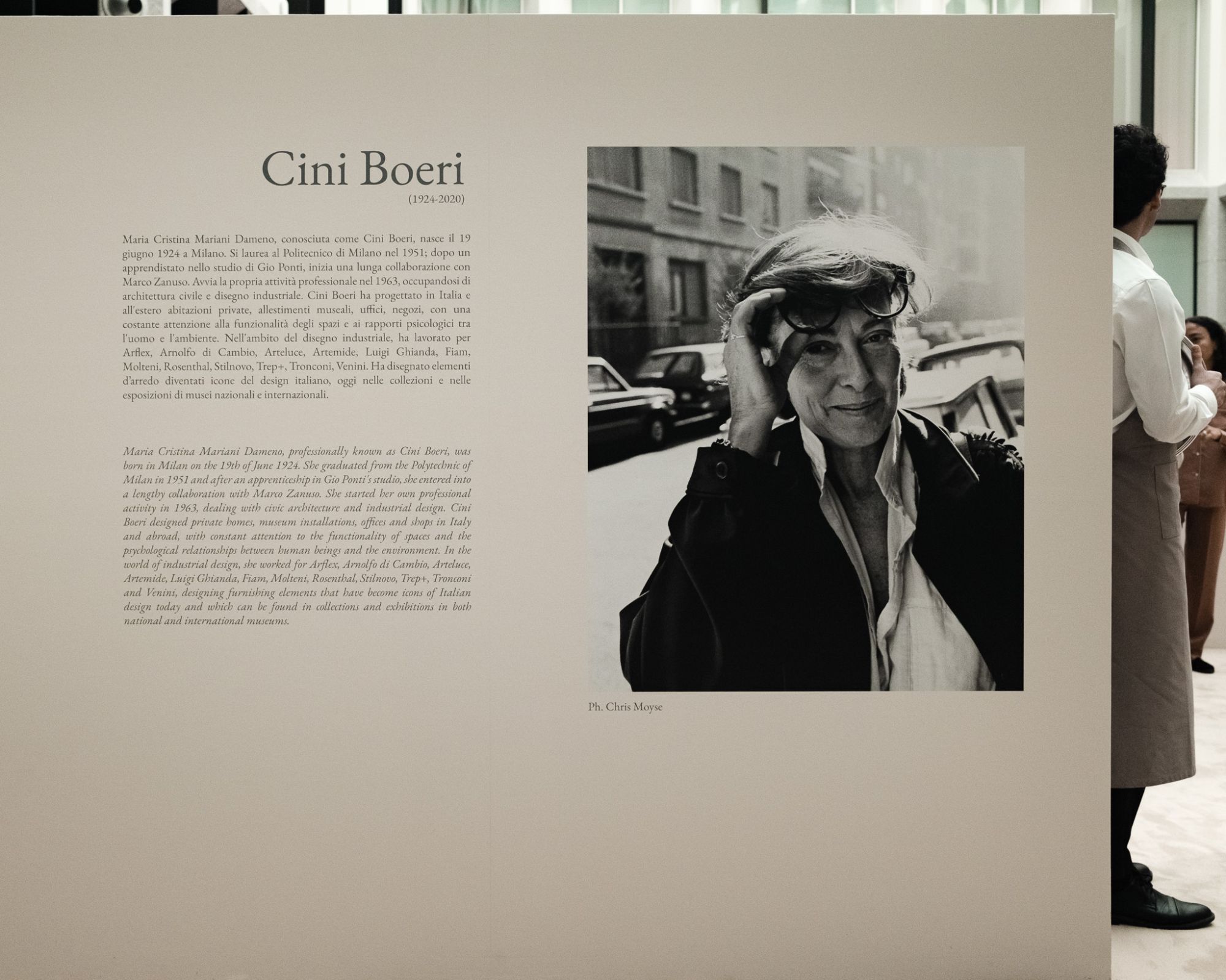 Giulia e Antonio Boeri, nipoti di Cini Boeri e fondatori dell'Archivio che porta il suo nome, hanno definito così il lavoro della designer: «Cini ci ha insegnato a praticare la Gioia, nelle scelte della vita e nelle aspettative future. Ed è questo il messaggio principale che vogliamo trasmettere lavorando con il suo Archivio, la gioia di progettare con impegno ma anche con responsabilità e passione». Ma la celebrazione della vita e del lavoro straordinario di Boeri non si fermerà solo a quest’installazione dato che, in onore del centenario della sua nascita, l'Archivio Cini Boeri e Triennale Milano hanno collaborato alla mostra Cini Boeri nella Biblioteca del Parco, aperta dal 15 al 28 aprile presso la celebre biblioteca disegnata da Ico Parisi nel Parco Sempione – anche questo progetto è stato supportato da Loro Piana Interiors che ha collaborato con l'Archivio diventando uno dei partner ufficiali di Triennale Milano.