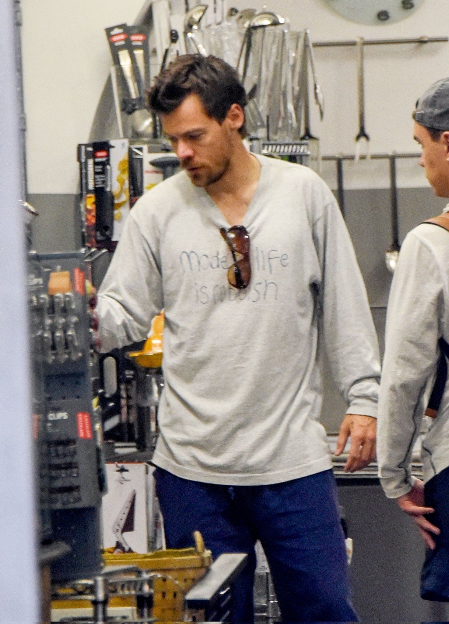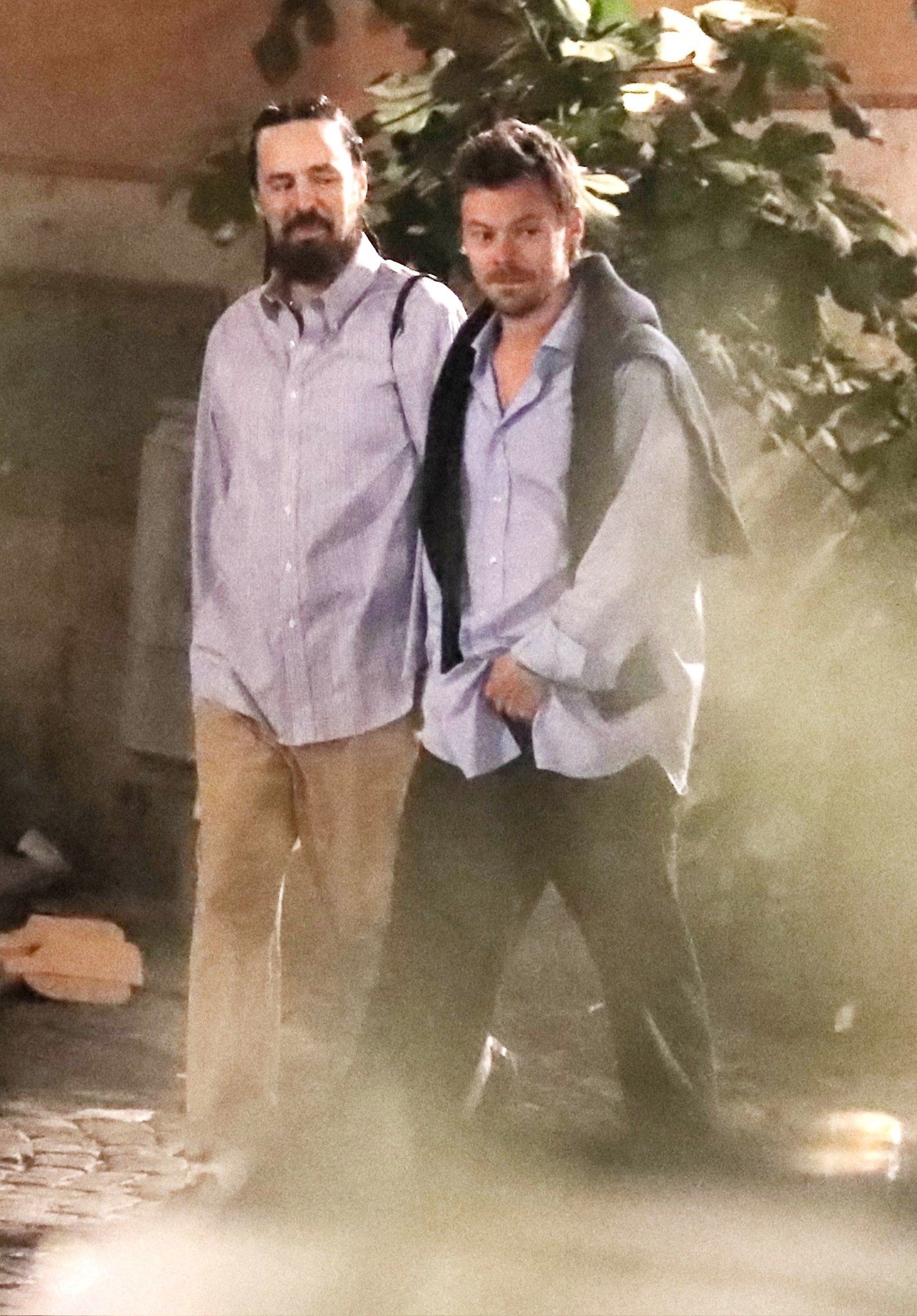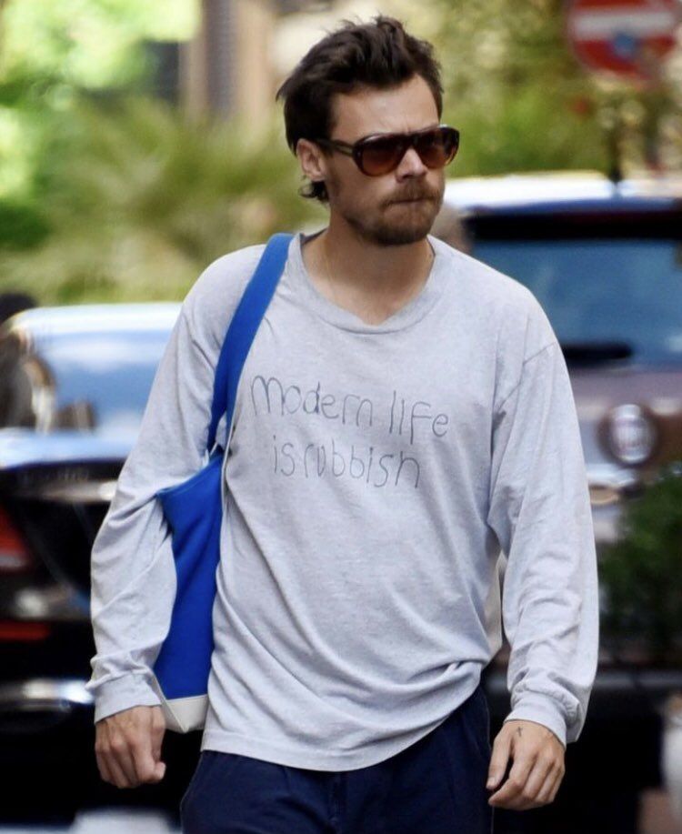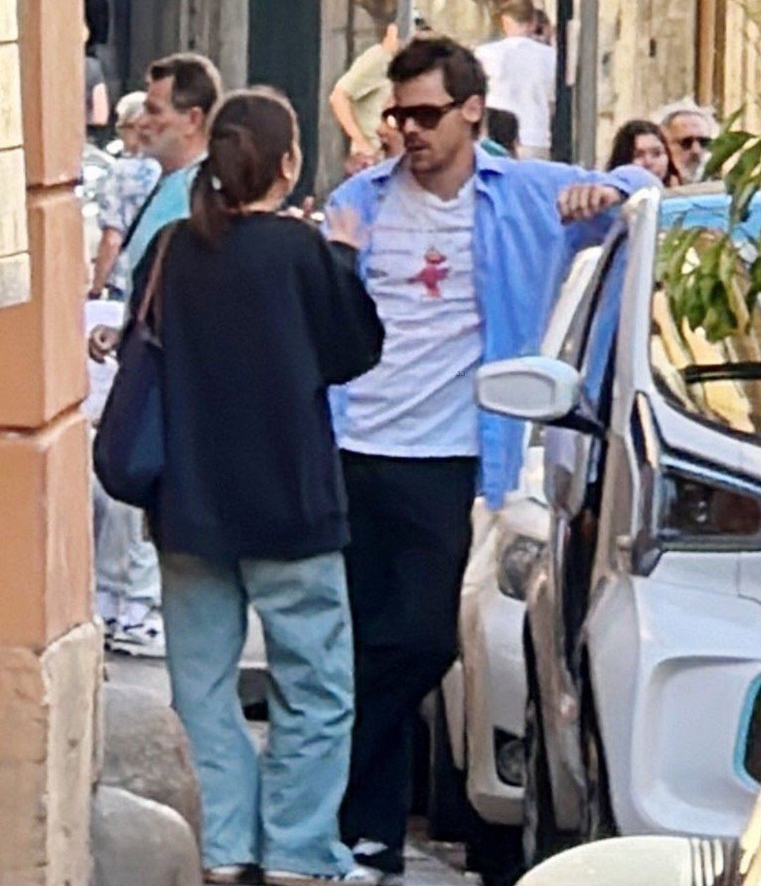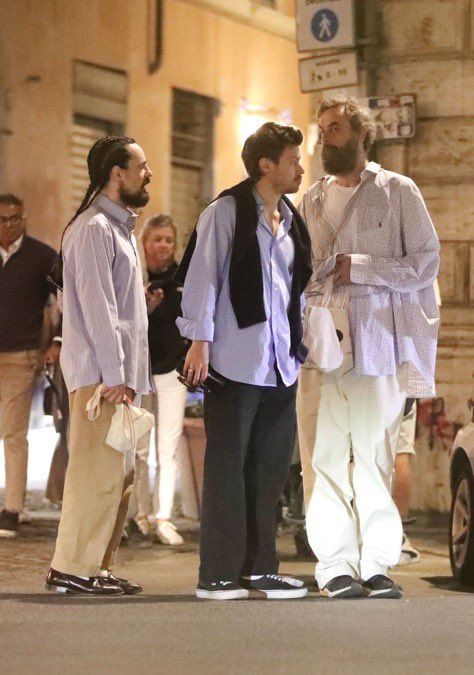 L’ultima volta che avevamo visto i due creativi insieme era nel 2022, prima che Michele lasciasse la direzione creativa di Gucci. Styles non è solo un grande amico del designer, ma anche una grande fonte di ispirazione, forse la stessa che vedremmo evocata nelle nuovi collezioni dello stilista romano per Valentino. Il cantante, ex membro degli One Direction, contattò Michele prima di lanciare la sua carriera da solista, nel 2017, e da allora ciascuno dei loro progetti ha fortemente contribuito alle scelte artistiche dell'altro, dai look realizzati per i tour mondiali di Styles a collezioni come Gucci HA HA HA, ultimo "frutto" che hanno coltivato per il brand. La tagline della collaborazione era “Via libera alla vanità”, e in effetti comprendeva silhouette e grafiche audaci, dai kilt ai dettagli a forma di orsetto, dalla maglieria rosa ai pantaloni anni ’70 rigorosamente a zampa. Oltre al look da papà imprenditore, nella sua vacanza romana Styles ha indossato un outfit che comprendeva Vans Authentic, pantaloni blu e una maglia dei Blur a maniche lunghe grigia con il titolo dell’album Modern Life Is Rubbish, e un’altra camicia azzura, questa volta lasciata aperta sopra una t-shirt bianca. Nessun orecchino, nessuno smalto colorato: del suo vecchio stile resta un grande paio di occhiali da sole, a goccia, ma anche quelli in colori neutri.