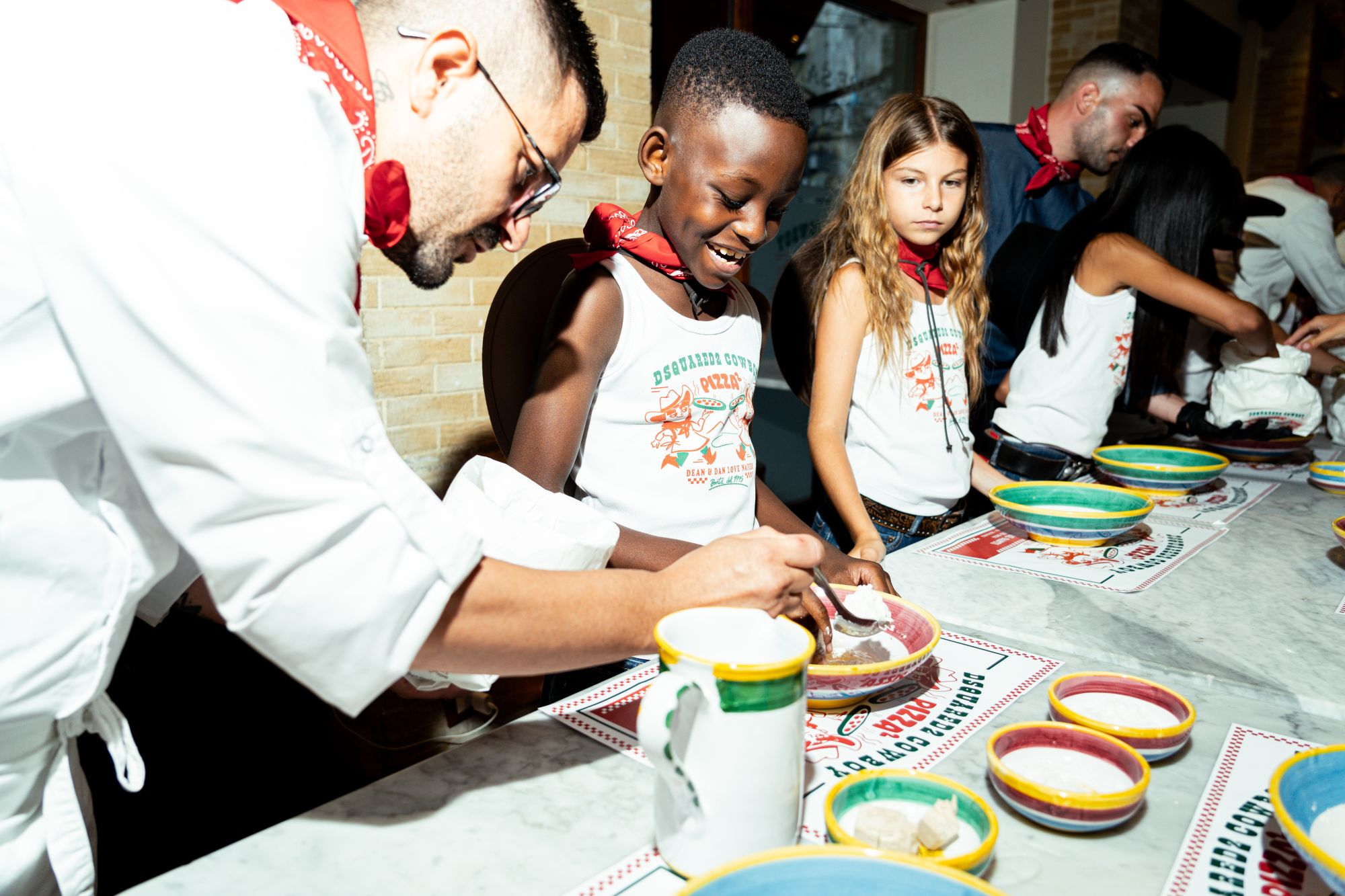 I più piccoli hanno avuto l’occasione di diventare pizzaioli esperti per una serata e infornare le loro creazioni culinarie, tutto in stile Concettina. Per continuare la serata, gli ospiti sono stati deliziati dalle portate d’autore del ristorante e dall’intrattenimento del cantautore napoletano Gabriele Esposito. Anche il locale era addobbato con l'estetica D2: per l'occasione il brand ha creato piatti e scatole della pizza personalizzati come ricordo della serata passata insieme. La capsule collection, che include una felpa speciale, una canottiera e una t-shirt, sarà lanciata ad ottobre in tutti i canali ufficiali di DSQUARED2, nei retailer selezionati globali e su Bravekid.com.