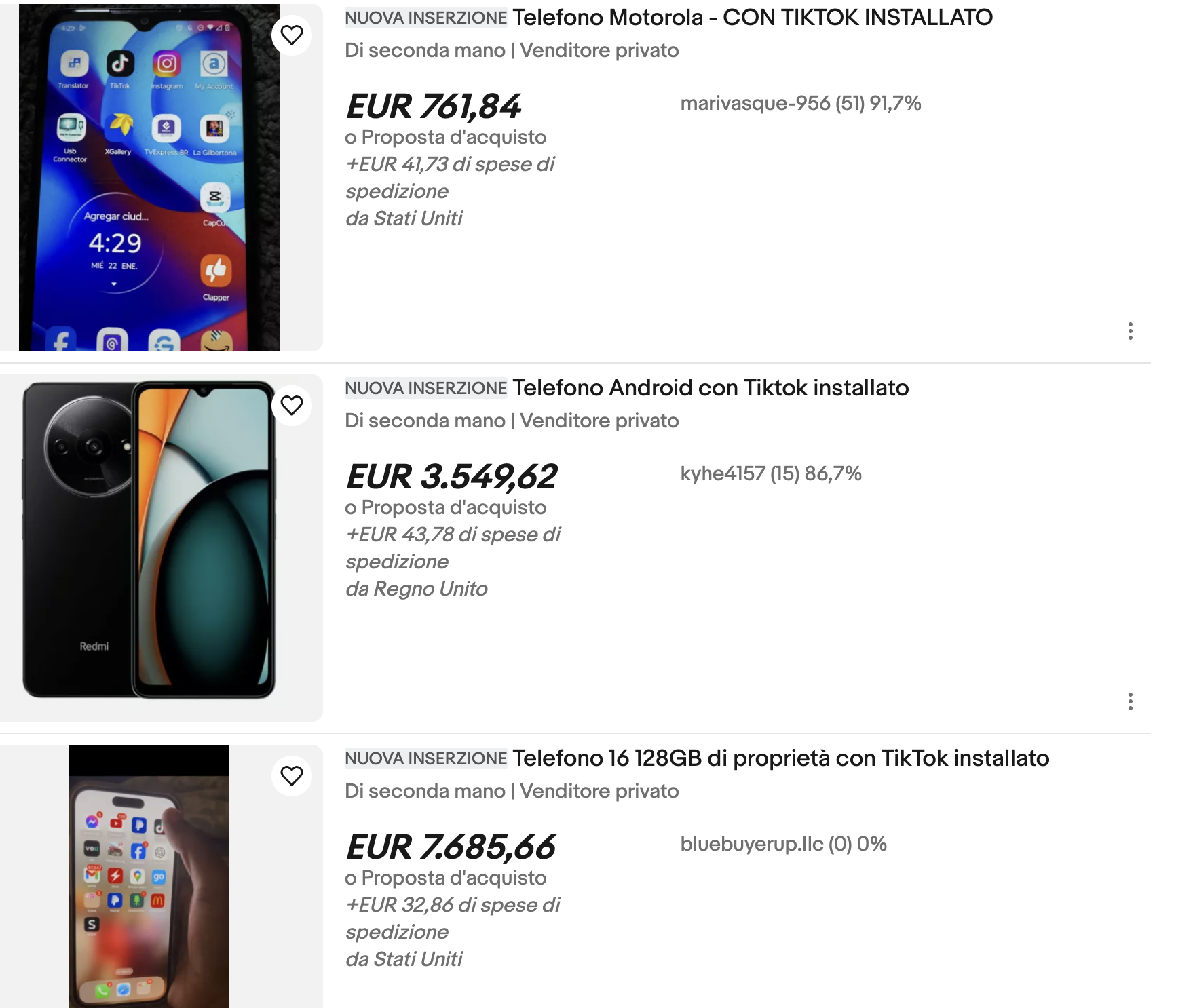 Al momento nessun app store americano possiede TikTok e né Google né Apple hanno rilasciato comunicazioni su cosa succederà. L’impossibilità di scaricare l’app sta spaventando gli utenti, specialmente i social media manager e i content creator: se si elimina TikTok per sbaglio, se si perde il telefono o se si compra un nuovo dispositivo non c’è modo di riaverlo. Per i venditori eBay la situazione rappresenta un’occasione impareggiabile: sulla piattaforma al momento ci sono migliaia di listing di telefoni usati, di tutti i tipi di marca, con TikTok. Per far sì che l’app non venga perduta, il venditore abbandona l’account iCloud o Google associato al telefono ma non ripristina le impostazioni di fabbrica del dispositivo; in questo modo l’app rimane installata a meno che l’acquirente non compia l’errore di effettuare il backup. Il prezzo di partenza scelto dai venditori è altissimo, si aggira tra i $2mila e i $50mila, ma non abbiamo la certezza che qualcuno abbia veramente deciso di investire così tanto in uno di questi telefoni usati ma ultra-costosi.