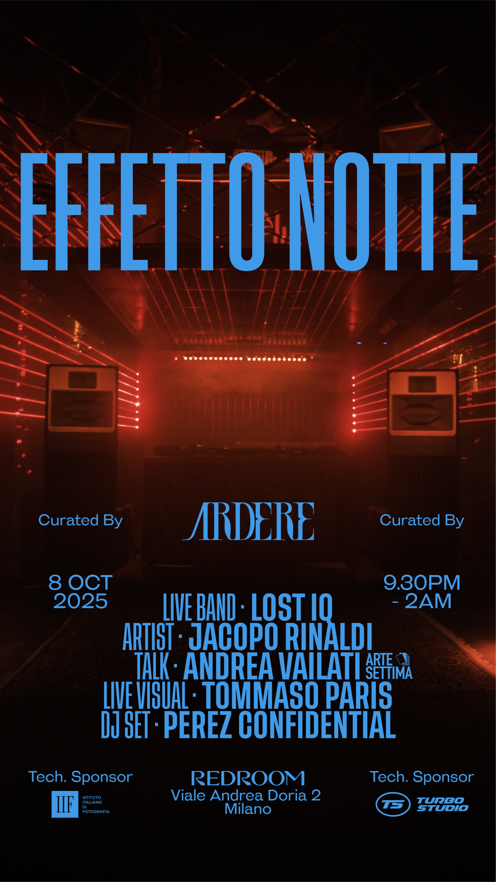 L’8 ottobre il RedRoom Members Club ospita EFFETTO NOTTE, evento a cura di Ardere che esplora la notte come linguaggio, spazio di possibilità, palcoscenico di incontri e sperimentazioni. Durante la serata prenderà forma un territorio sospeso in cui le immagini si sovrappongono ai suoni e la dimensione intima del club si trasforma in un laboratorio sensibile. Al centro dell'evento c’è la proiezione-performance curata da Andrea Vailati e Tommaso Paris di ArteSettima, per accompagnare il pubblico in un viaggio tra le notti del cinema, dalle lune fantastiche di Méliès alle atmosfere disturbanti di Arancia Meccanica, fino alle frammentazioni del contemporaneo.