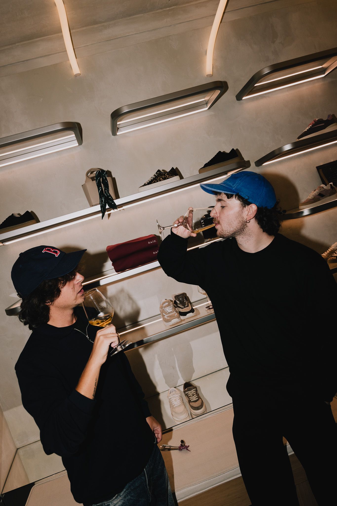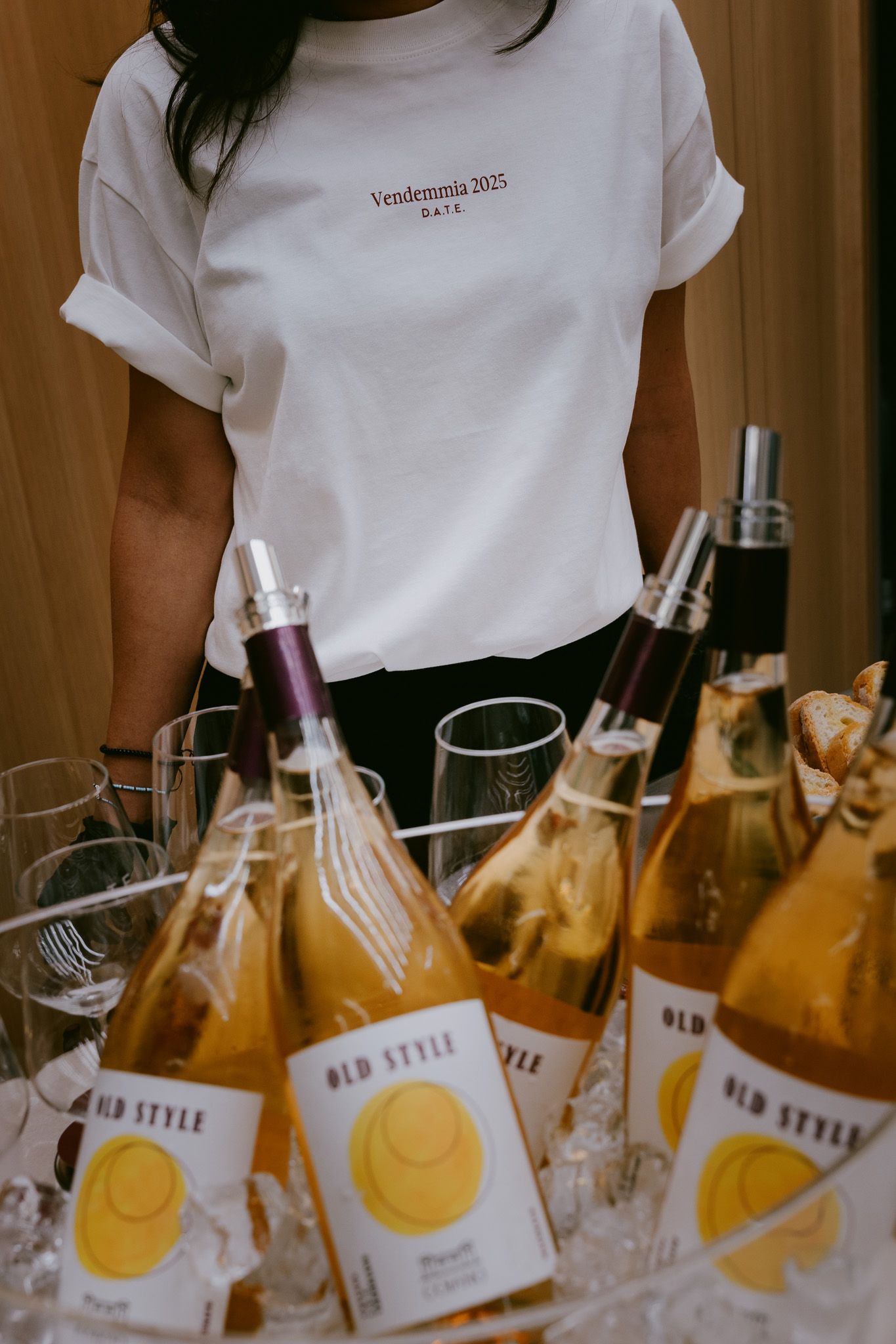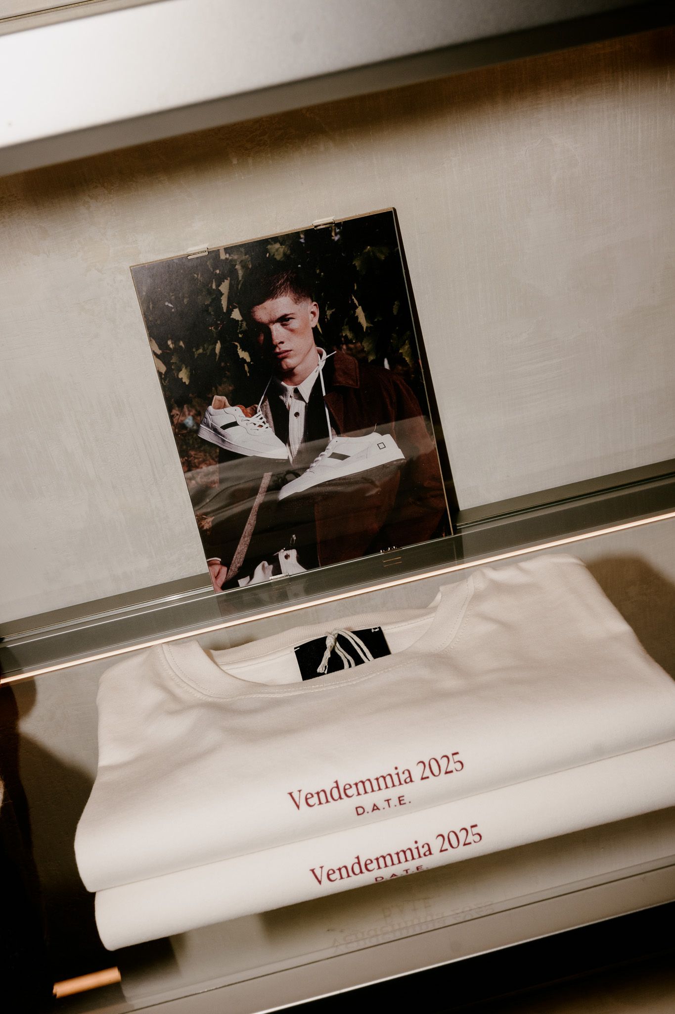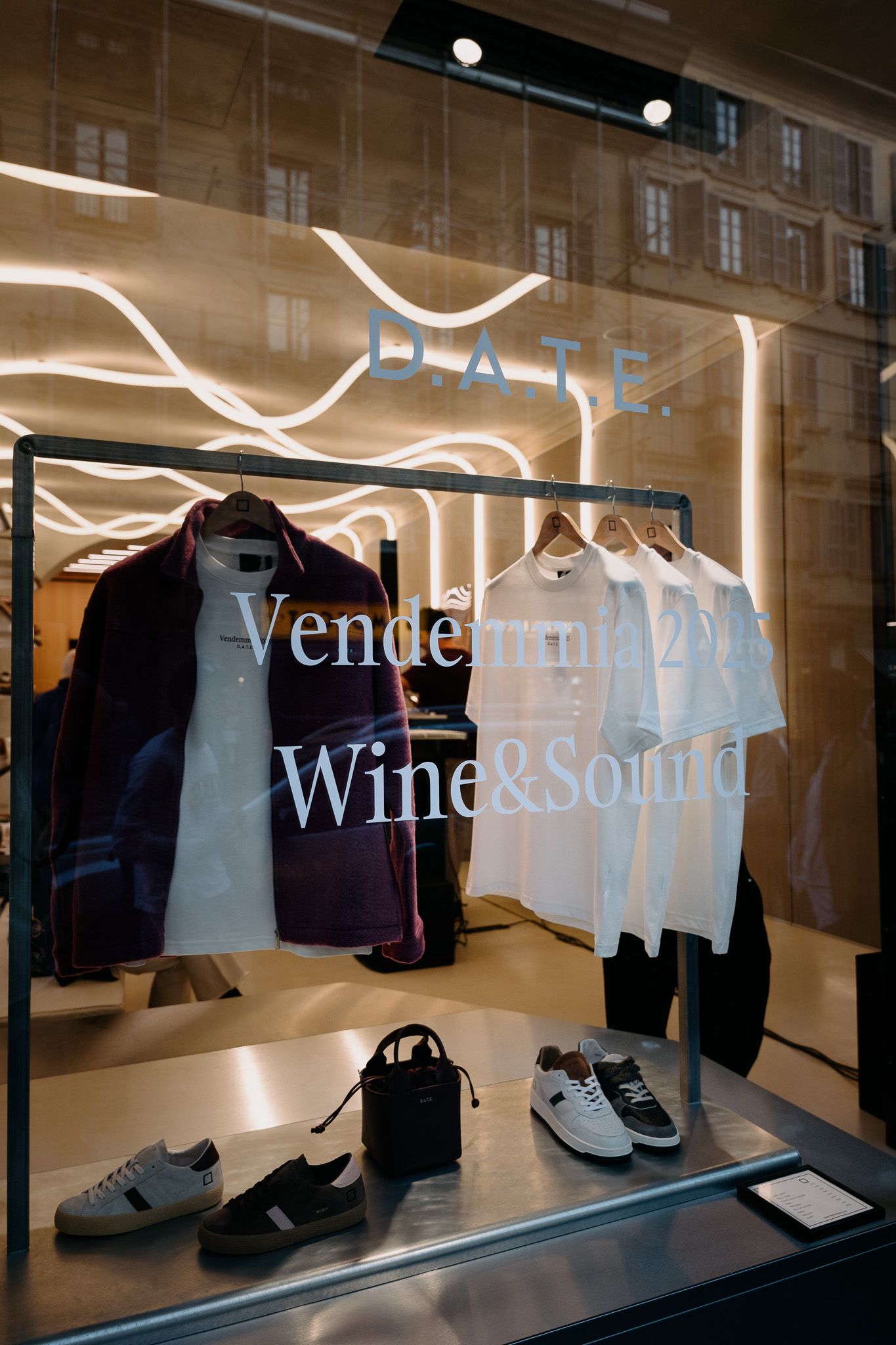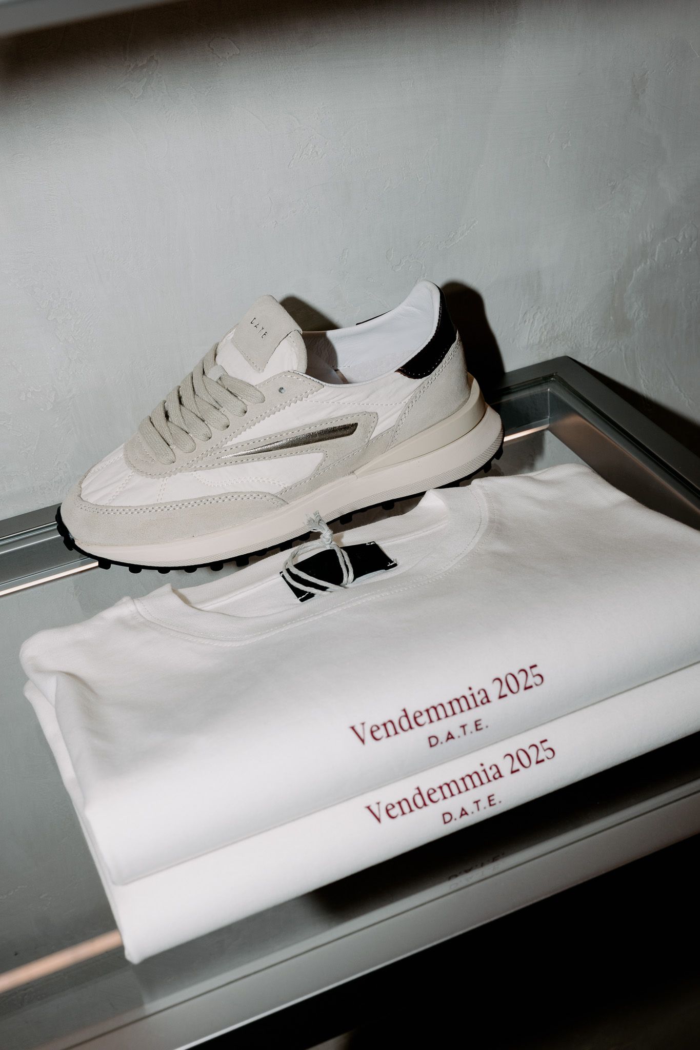 Per celebrare l'evento, il brand ha creato una capsule collection esclusiva che include una serie di t-shirt in tonalità avorio con il logo "Vendemmia 2025" in bordeaux, accompagnata da una selezione di sneakers, abbigliamento e accessori della linea Fall/Winter 2025. I colori prevalenti e cioè i rossi terrosi, verdi scuri e beige neutri, riflettono le sfumature delle vigne autunnali, in linea con i temi enologici dell'evento più ampio. Un aspetto condiviso tra enologia e moda è il ruolo del tempo: la vendemmia, come la realizzazione di un prodotto D.A.T.E., implica fasi di attesa e attenzione, dalla selezione dei materiali allo studio delle forme e dei dettagli.