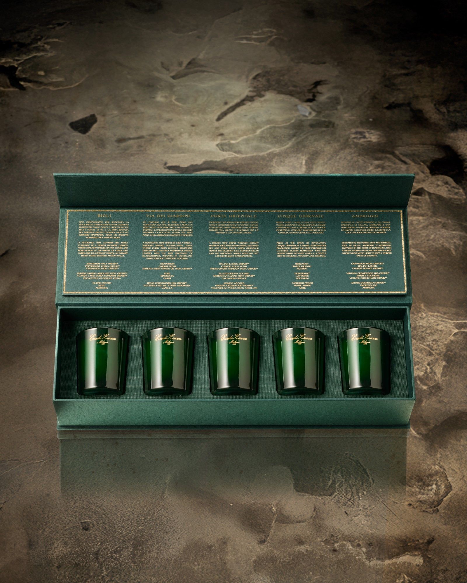 Le cinque fragranze principali catturano sfaccettature uniche della capitale lombarda: una dal carattere intenso e affumicato, ispirata a zone nascoste e legni pregiati; un'altra luminosa con accenti agrumati e floreali, che evoca la raffinatezza sartoriale; una terza fresca e balsamica, simbolo di sostanza e qualità; poi una verde e vivace, che riflette l'apertura cosmopolita; e infine un'essenza elegante con note di agrumi, fiori e legni chiari, omaggio ai cortili verdi privati.