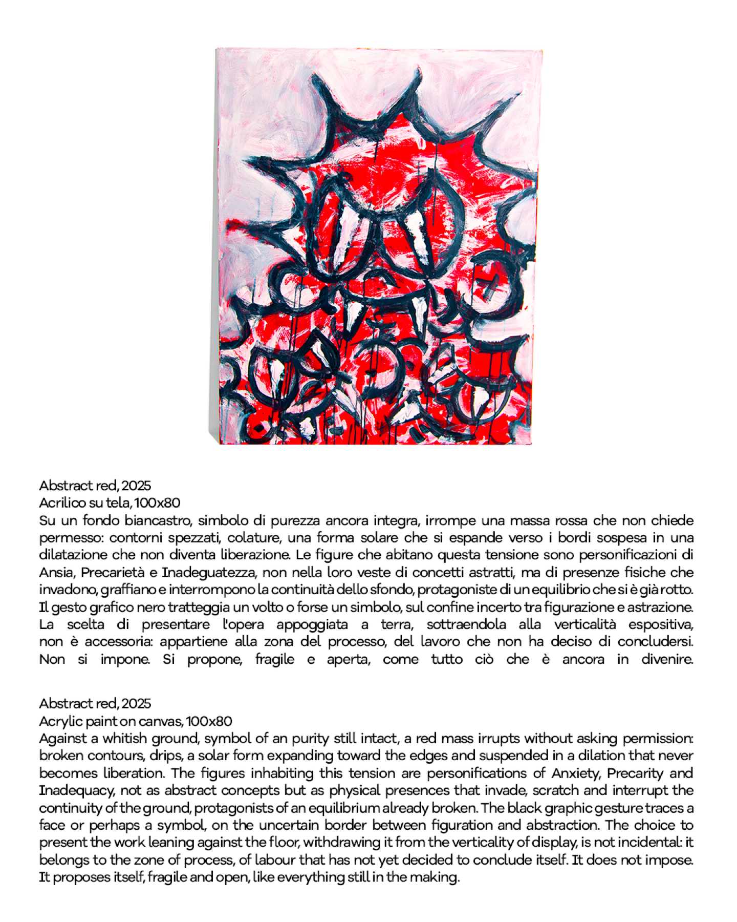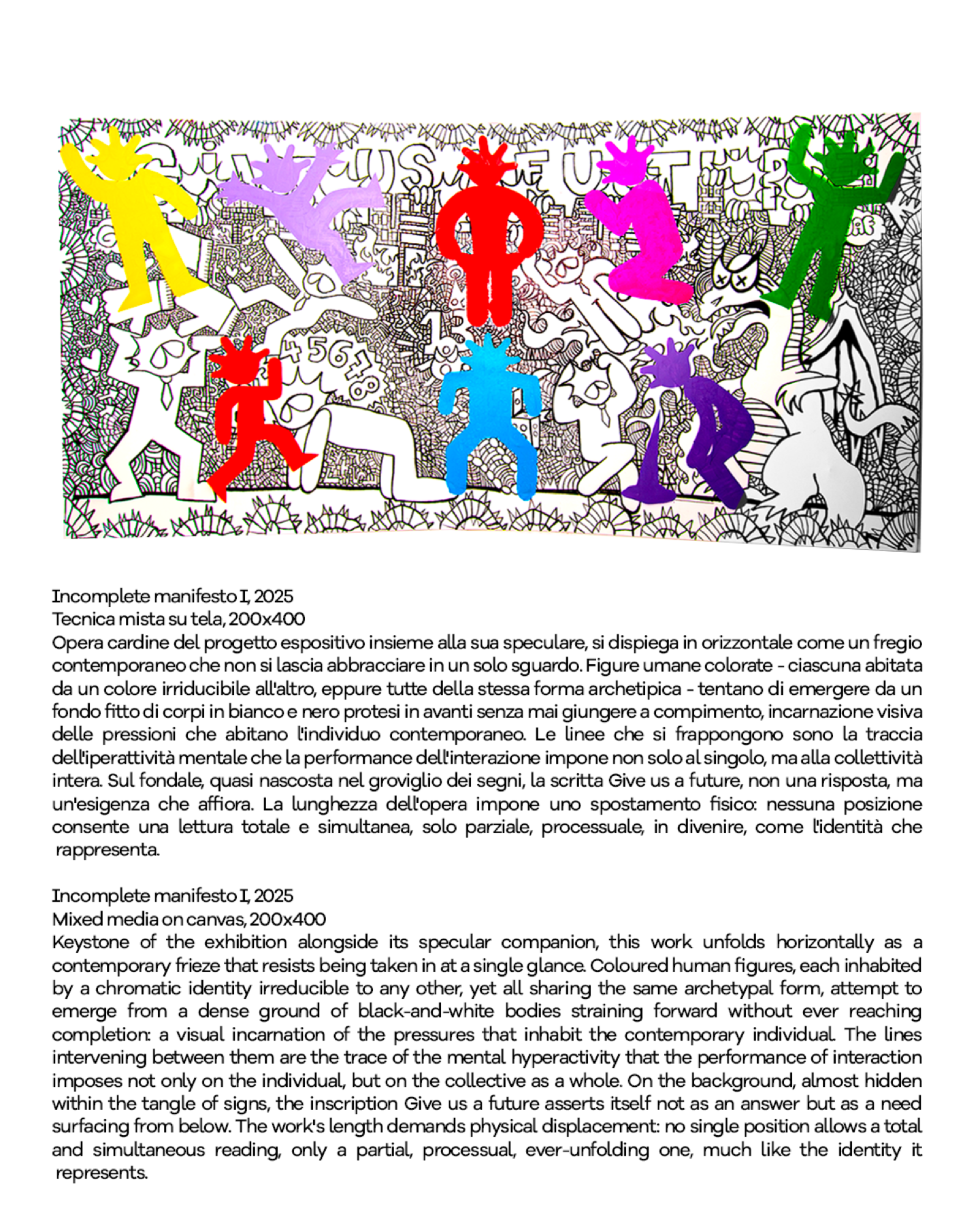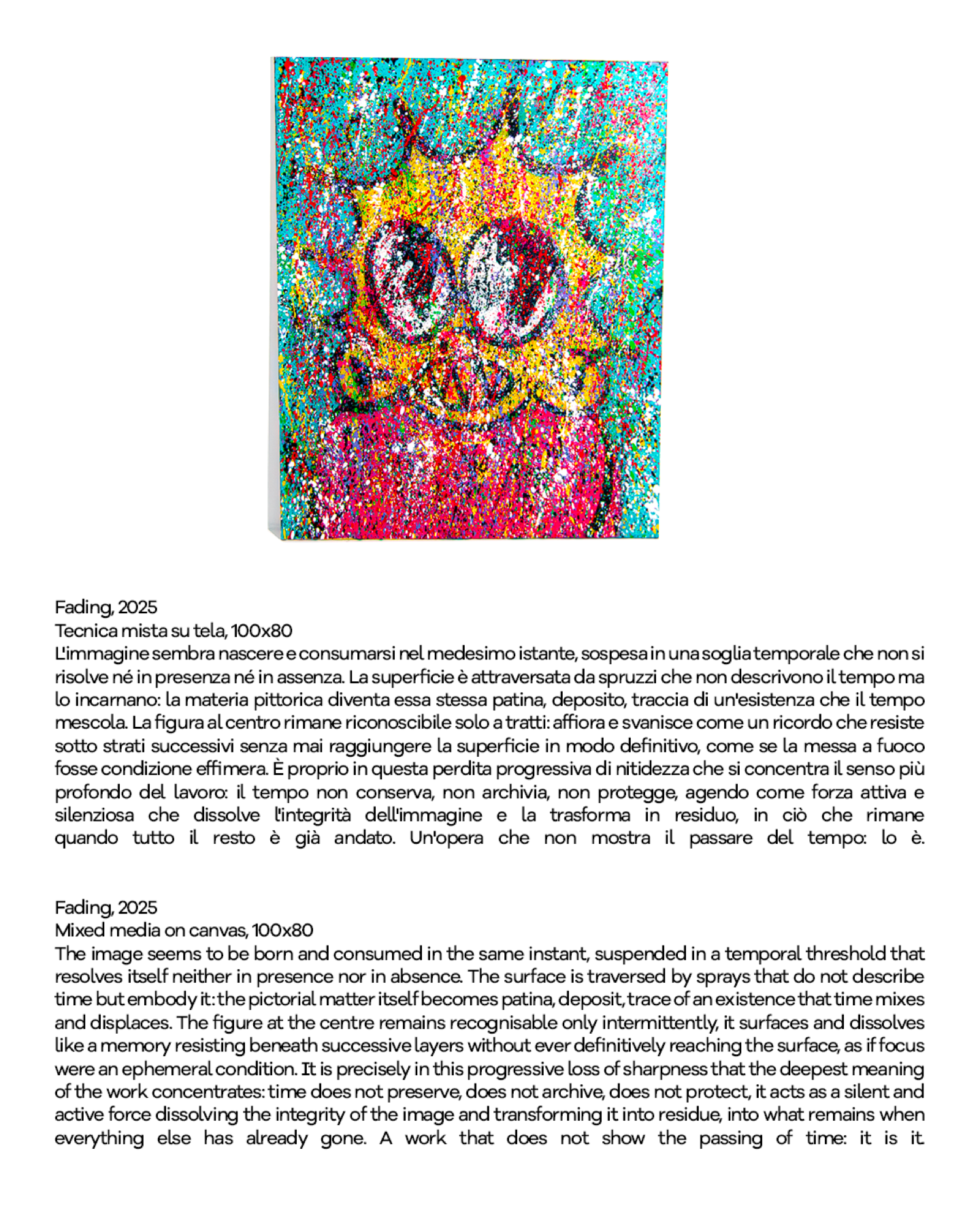 All’interno di questa prospettiva, anche lo studio dell’artista assume un ruolo centrale come spazio fisico e mentale dell’incompiuto. Le opere e gli interventi installativi tra pittura, elementi spaziali e dispositivi visivi costruiscono un ambiente poroso in cui processo e compimento restano costantemente in tensione. Il percorso espositivo invita il visitatore a un attraversamento libero, restituendo una narrazione aperta che riflette la frammentazione e la complessità dell’identità contemporanea.
