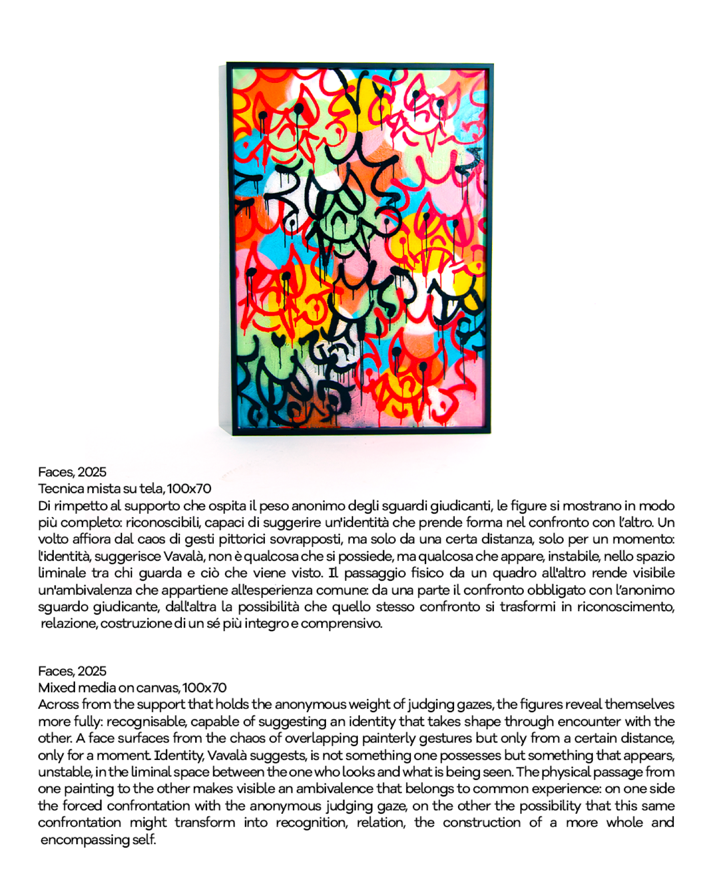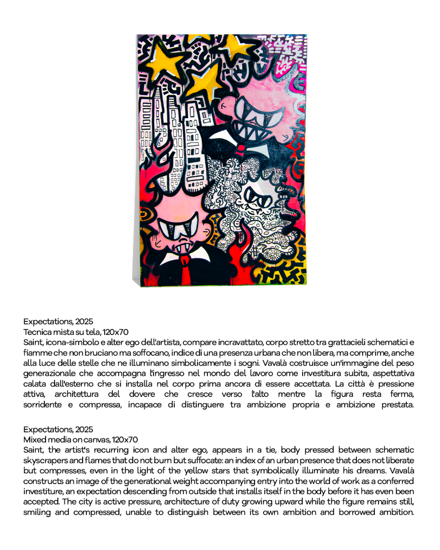 Il concept ruota attorno alla nozione di “incompiuto” come condizione esistenziale e creativa. In opposizione alla logica della performance, della definizione e del risultato, Vavalà costruisce uno spazio di sospensione in cui l’incompletezza non è mancanza, ma forza generativa. Nel tempo, il giovane artista ha costruito un linguaggio immediatamente riconoscibile, caratterizzato da colori intensi, segni netti, stratificazioni visive e dalla presenza ricorrente di “Saint”, il suo alter ego simbolico: una figura che incarna la possibilità di portare luce e significato anche nelle zone più fragili dell’esperienza contemporanea.
