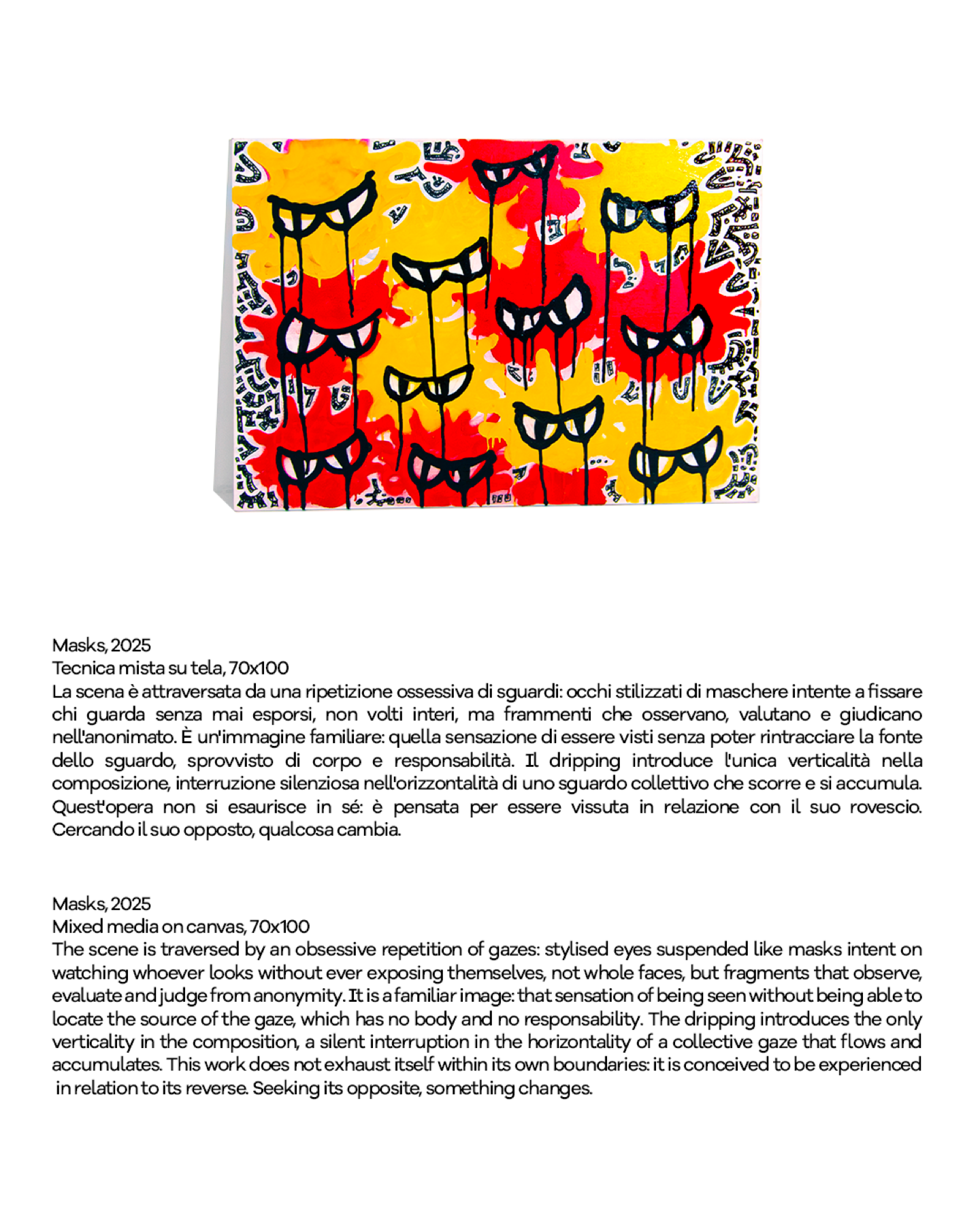 Il suo percorso, nato da una profonda urgenza espressiva, si è evoluto fino a trasformarsi in un immaginario condiviso, capace di parlare in modo diretto alla sua generazione. L’idea di in-betweenness diventa così una zona di soglia: un territorio instabile tra ciò che si è e ciò che si diventa, condiviso dall’individuo contemporaneo e dal processo artistico stesso.
