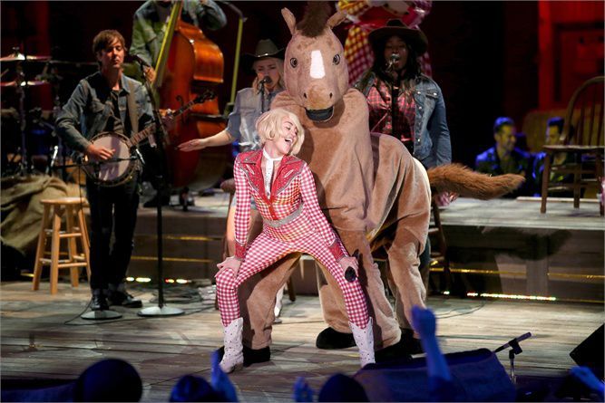 Con parrucca bionda alla Dolly Parton, durante una esibizione, decide di twerkare...con un cavallo. A voi i commenti.