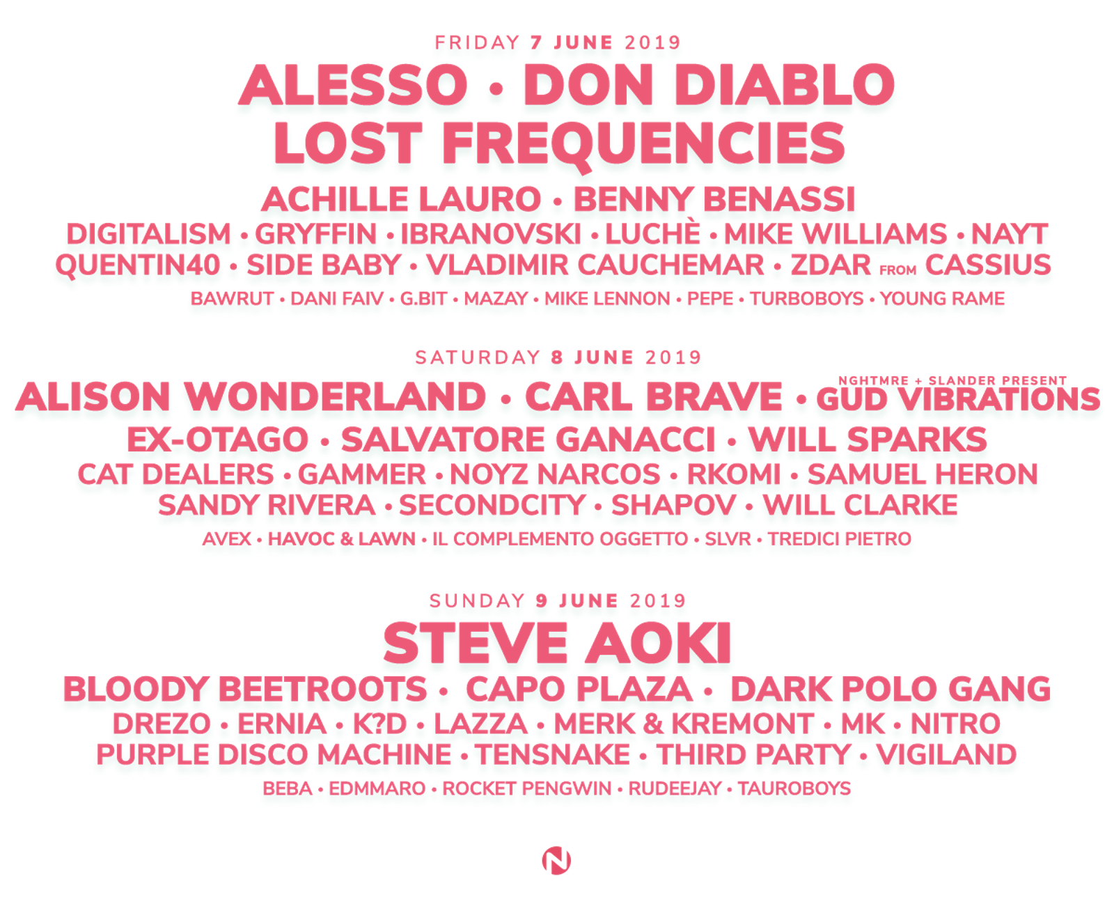 I nomi dell'edizione 2019 sono stati svelati qualche mese fa e confermano l'enorme crescita del festival di questi anni, pronto ad accogliere tra gli altri artisti del calibro di Alesso, Achille Lauro, Carl Brave, Steve Aoki, e la Dark Polo Gang.