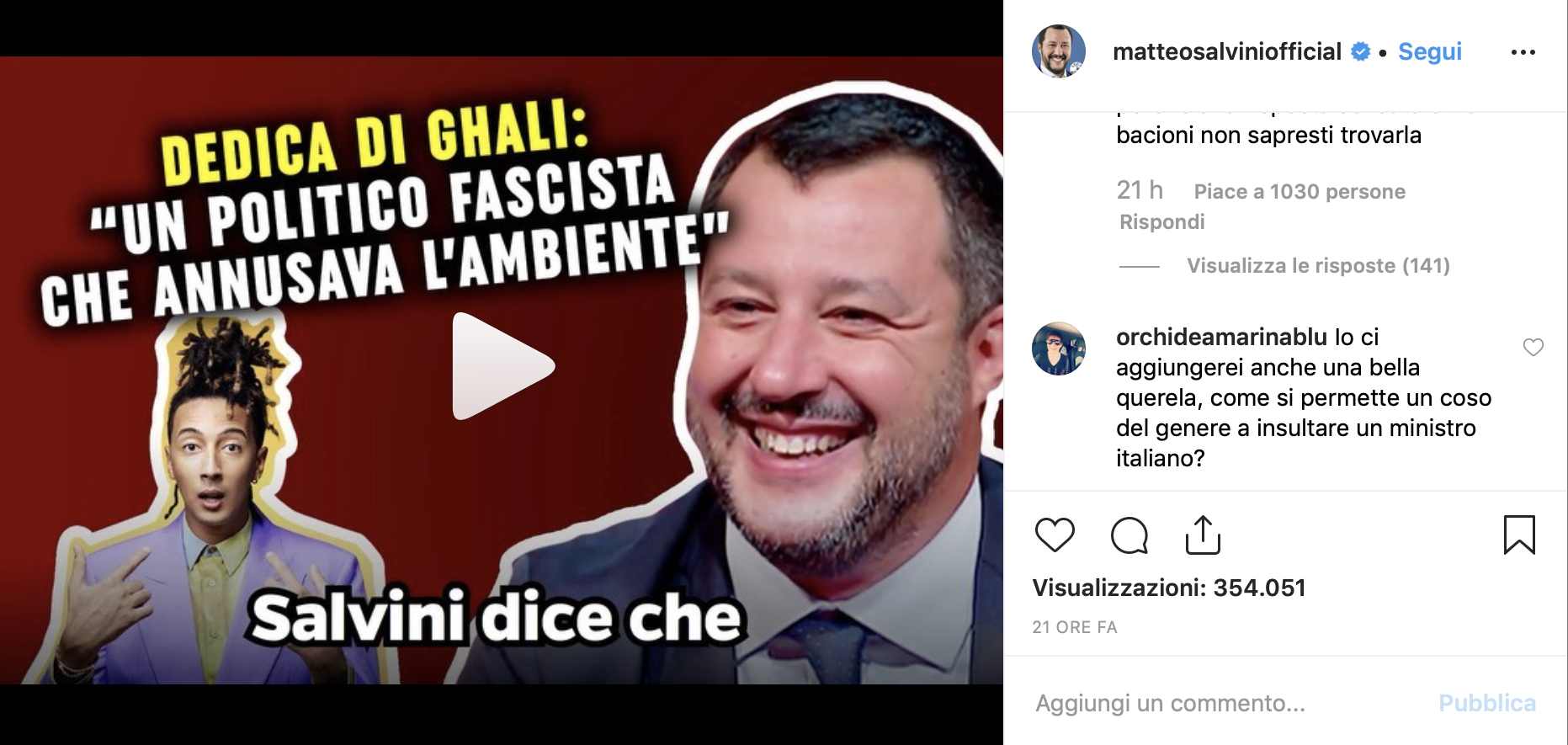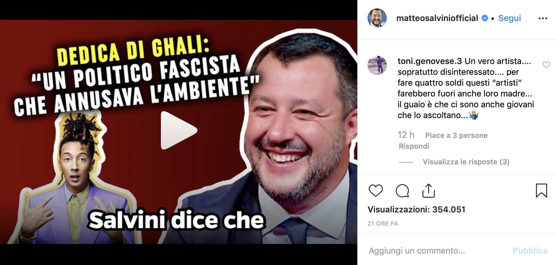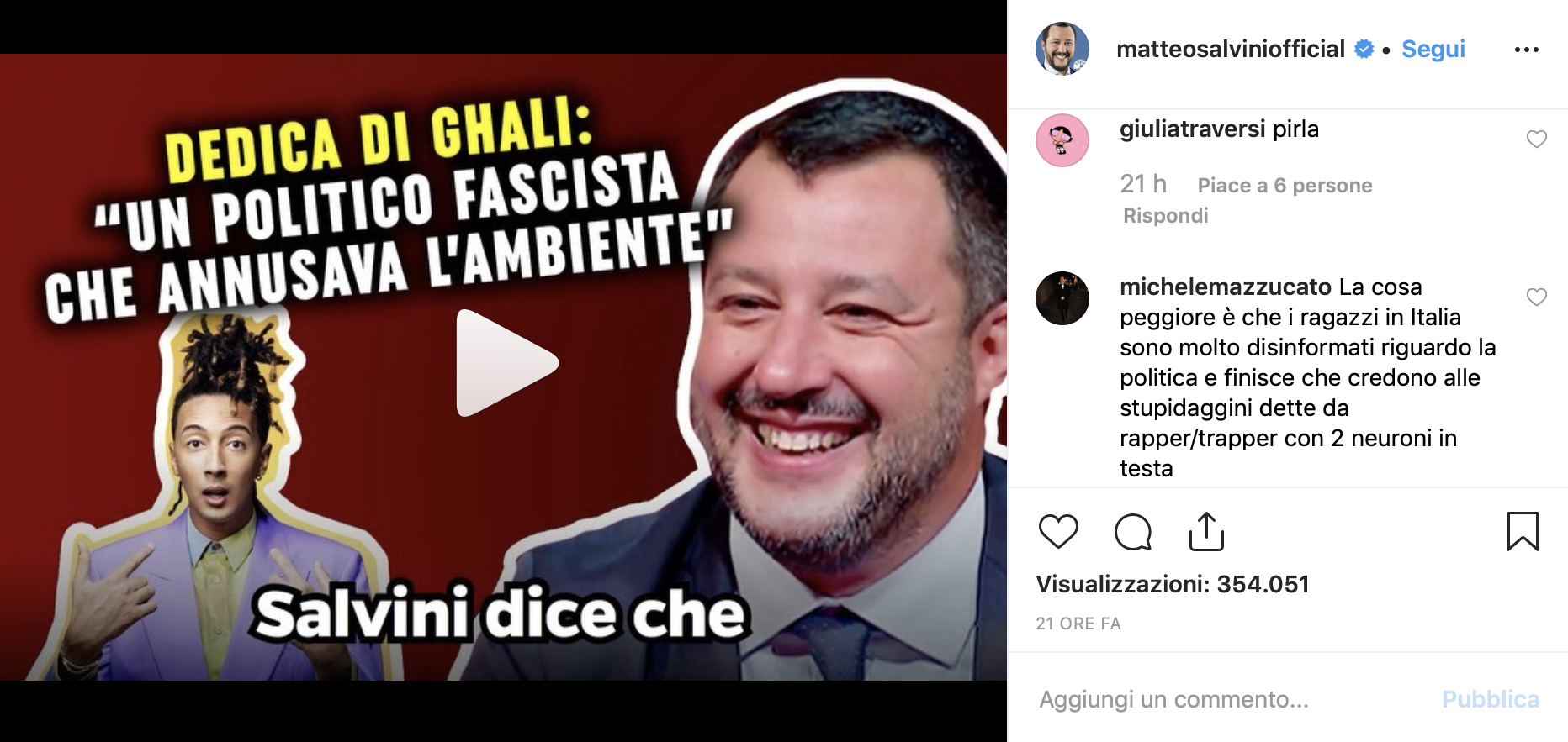 Ghali probabilmente è già in cima alla lista nera di Salvini degli artisti da riportare a casa loro, ma in realtà in questo caso la questione politica è totalmente secondaria, o meglio, la questione politica non esisteva nemmeno prima che Salvini postasse il brano sul suo Instagram. Seguendo un modello di comunicazione obiettivamente molto efficace, al segretario della Lega serviva solo un pretesto per risvegliare i suoi follower, assopiti per la mancanza di polemiche veramente interessanti causa vacanze estive - l'emergenza sbarchi è un evergreen, ma ogni tanto serve qualcosa di fresco. Il profilo Instagram di Salvini, caratterizzato da un'estetica francamente brutta, è l'esempio migliore per capire come funziona la comunicazione del ministro: le immagini postate sono quasi tutte screenshot di titoli di giornale in grado di accumulare un tasso di engegament che farebbe invidia ad ogni influncer. Salvini è concreto, vuole parlare di un argomento? Posta l'articolo che più gli fa gioco e aspetta solo che i suoi follower gli diano ragione, come nel caso della canzone di Ghali.