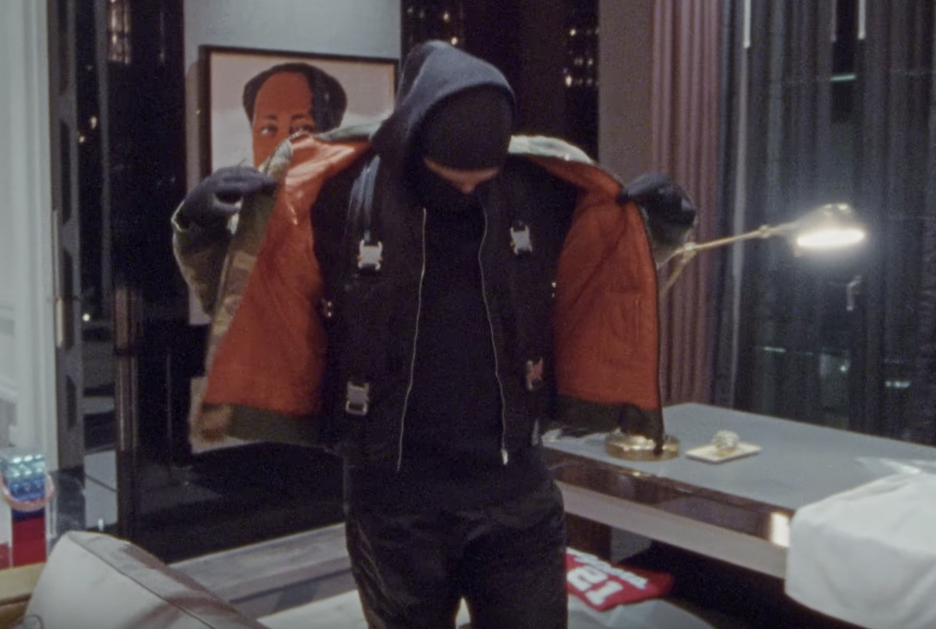 Ma se la coreografia di Toosie Slide è destinata a diventare virale, la vera grande protagonista del video è la casa di Drake, con tutto quello che contiene e che Drake mostra nel video. Quella che segue è quindi una shopping guide impossibile, per arredare la vostra casa come se fosse quella di Drake e vestirvi come si veste Drake con il leggendario “Riot! Riot! Riot!” Camo Bomber Jacket di Raf Simons con due soli pezzi in vendita attualmente (per circa 32 e 47 mila dollari su Grailed). Altri possessori del pezzo, oltre ovviamente a Drake: Kim Kardashian e Kanye West. O un Mao di Andy Warhol, oltre all’omaggio a Kobe Bryant e diversi quadri con i rapper preferiti di Drake.