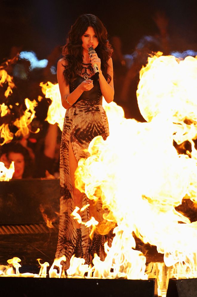 Allure delicato nei toni e nelle forme per la mise della presentatrice Selena Gomez, in Marchesa, in antitesi con l’aggressività di quelle sfoggiate dalle due top model Bar Rafaeli e Irina Shaik entrambe in Replay, marchio sponsor dell’ awards, con taglio sartoriale ed immancabile spacco vertiginoso.