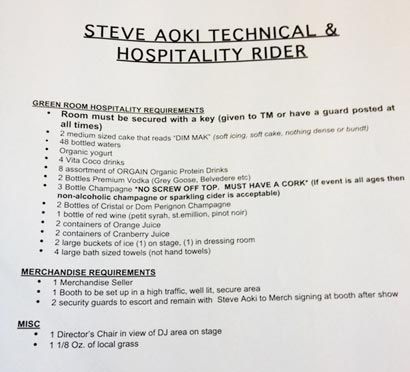 Consolle di prim'ordine, impianto audio eccezionale, un albergo di buona qualità per poter riposare. Un tempo erano questi i lussi dei dj, ora sembrano un miraggio se confrontati con la lista della spesa che il team di Steve Aoki richiede per poter far suonare il suo pupillo in giro per gli States e non solo.