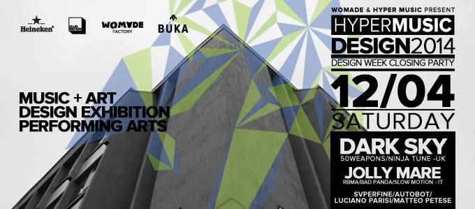 Un evento speciale per celebrare la Design Week 2014. Arte, musica, design e interattività allo spazio BUKA. WOMADE e HYPER MUSIC trasformeranno l’ex casa discografica abbandonata in un club fuori-luogo e temporaneo, un micro cosmo dove sperimentare e fare ricerca in ambito musicale ed artistico. Dopo lo straordinario successo dell’edizione 2013 alla Fabbrica del Vapore, che ha coinvolto migliaia di curiosi, creativi e appassionati di musica, HYPER MUSIC DESIGN si è guadagnato il titolo di party di chiusura della Design Week. WOMADE e HYPER MUSIC uniscono così di nuovo le forze e le idee per dare la propria interpretazione di club del futuro dove la contaminazione tra creatività e musica plasmerà uno spazio ibrido. Lo spettatore sarà trasportato in uno “labirinto” dove vivrà un’esperienza scandita da live performance, installazioni, video e dj set.