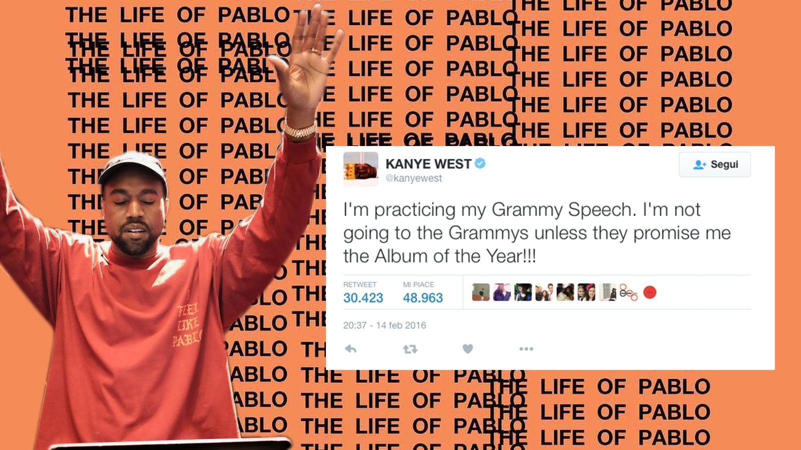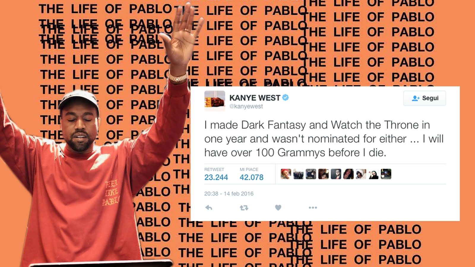 Kanye ha sottolineato di aver pubblicato My Beautiful Dark Twisted Fantasy e Watch The Throne - in collaborazione con Jay-z - in un solo anno, e di non essere stato nominato comunque ai Grammy. Ora, torna a dichiarare il suo desiderio e la sua ambizione scrivendo con un tweet “Avrò più di 100 Grammys prima di morire”.