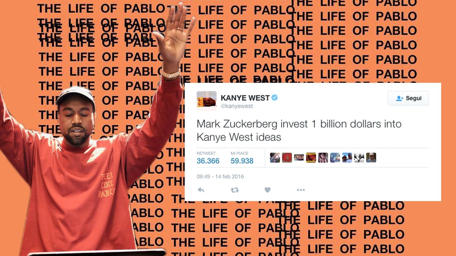 In uno dei suo più recenti tweet, Kanye ha chiesto al fondatore di Facebook Mark Zuckerberg di investire $ 1 miliardo nelle sue idee - definendosi con la sua solita modestia come “il più grande artista di tutti i tempi” - chiedendo aiuto ai suoi fan per attirare l’attenzione di Zuckerberg. “Mark ti sto chiedendo aiuto pubblicamente” sembra implorare Kanye, ma per ora sembra rimanere un desiderio.