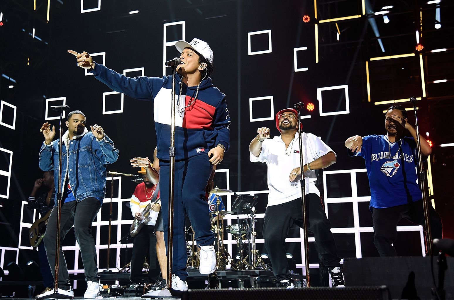 Il cantante ha dato uno tocco di funky alla serata, suonando la sua nuova hit e presentandosi sul palco in total look Tommy Hilfiger in stile America Pre-Clinton.