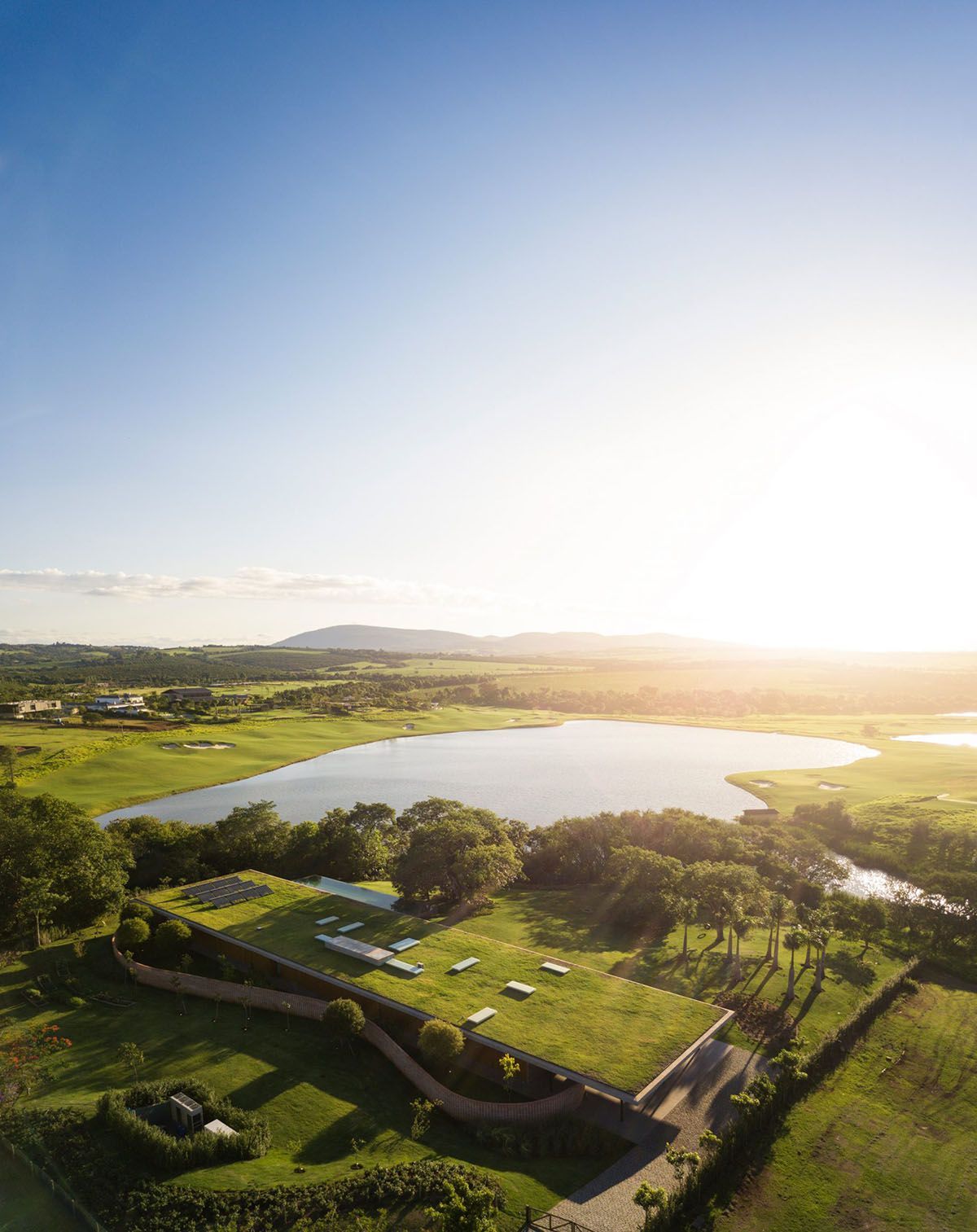 Le fotografie aeree del progetto mostrano vegetazione, lucernari e pannelli solari che coprono questa “quinta facciata dell'edificio”, mentre sotto di essa ci sono due scatole programmatiche, arredate con mobili bassi e massicci.