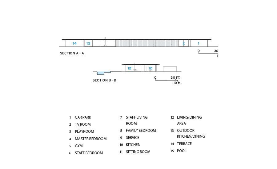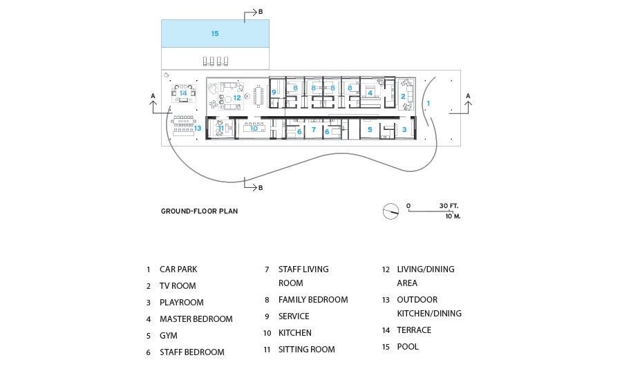 La prima contiene aree di servizio, una palestra, TV e sale giochi, mentre la seconda ospita cinque camere da letto con bagno.