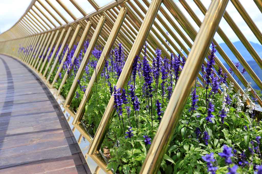 La costruzione lunga 150 metri, composta da otto campate e sospesa a più di 1400 metri sul livello del mare, sembra un nastro dorato tenuto da due mani giganti che emergono dal fianco della collina, evocando a chi lo percorre l’impressione di camminare sulle nuvole, di “attraversare il paradiso”. Una sensazione spirituale, quasi divina, amplificata dai bellissimi fiori viola di Lobelia che costeggiano il ponte.