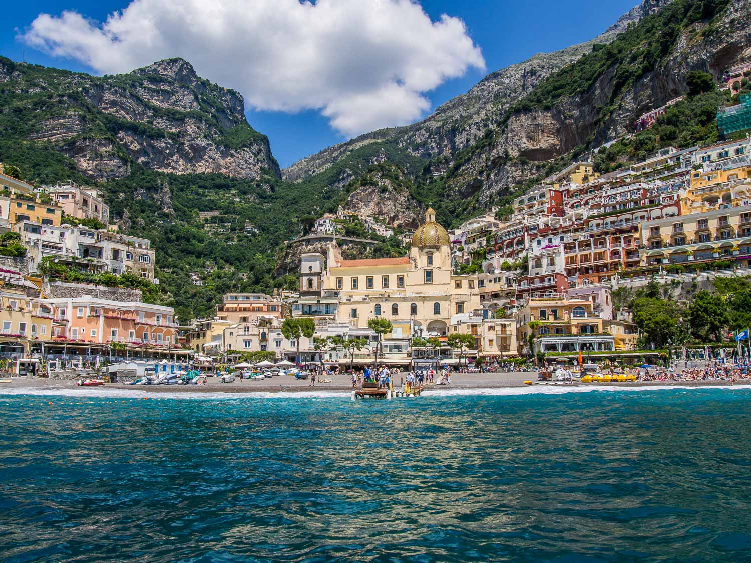 Tappa fondamentale di ogni viaggio in Costiera Amalfitana, Positano offre stradine strette piene di boutique e negozi tra le quali passeggiare, ma anche luoghi speciali da visitare come la Chiesa Santa Maria Assunta con la sua cupola in maiolica, il Sentiero degli Dei, una celebre passeggiata panoramica e, ovviamente, le spiagge dove prendere il sole e fare un tuffo in un mare blu meraviglioso.