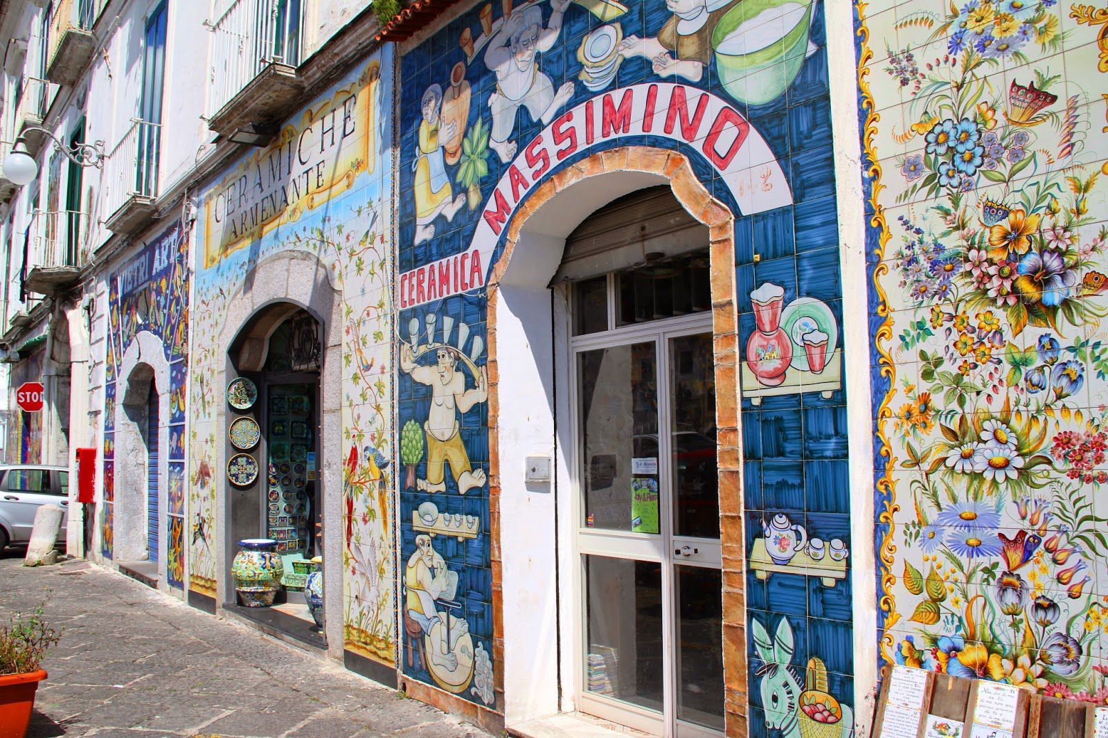 Vietri sul Mare è un bel borgo antico sospeso sul Tirreno, con un centro storico pieno di botteghe di ceramiche artigianali, una chiesa con la cupola in maiolica colorata e due spuntoni di roccia in mezzo al mare come simbolo della città.