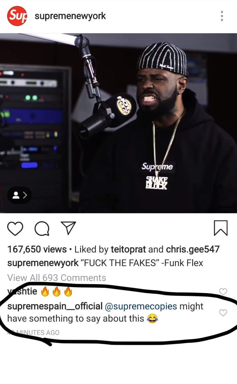 Tra le migliaia di commenti sotto al video di Supreme non è mancata la risposta sarcastica proprio di Supreme Italia - tramite il profilo IG @Supremespain_official - che ha citato l'account Instagram @supremecopies.