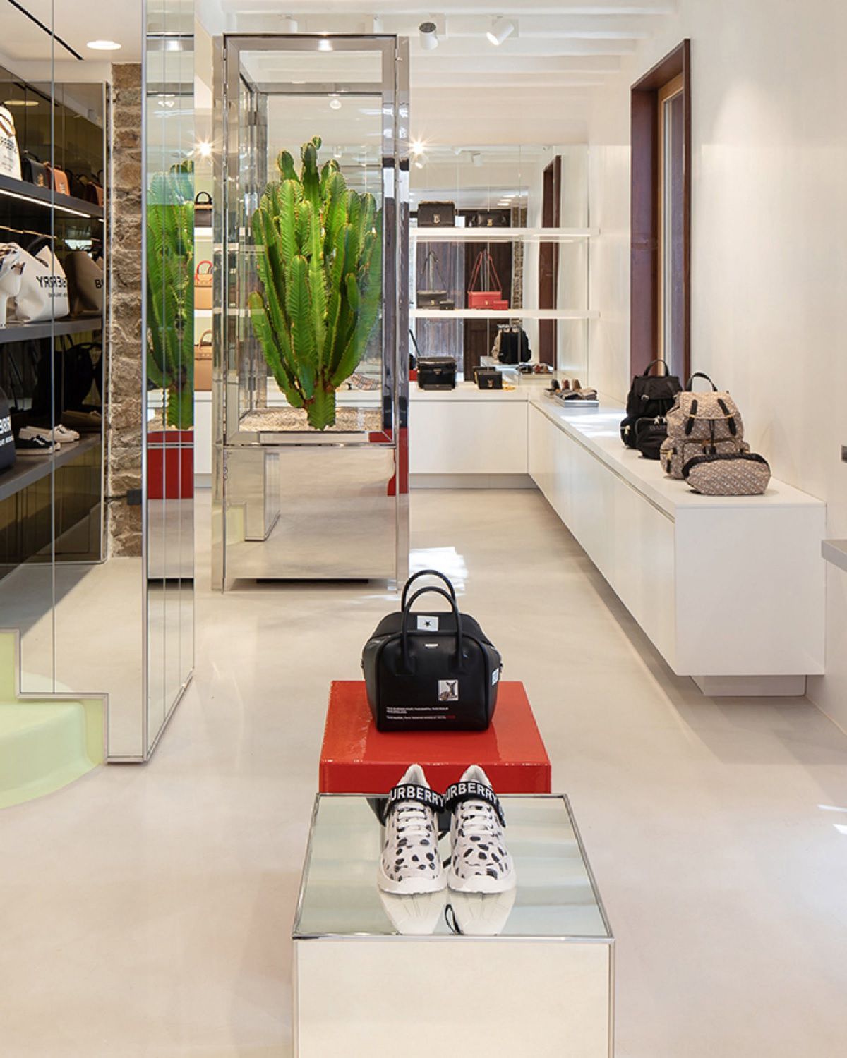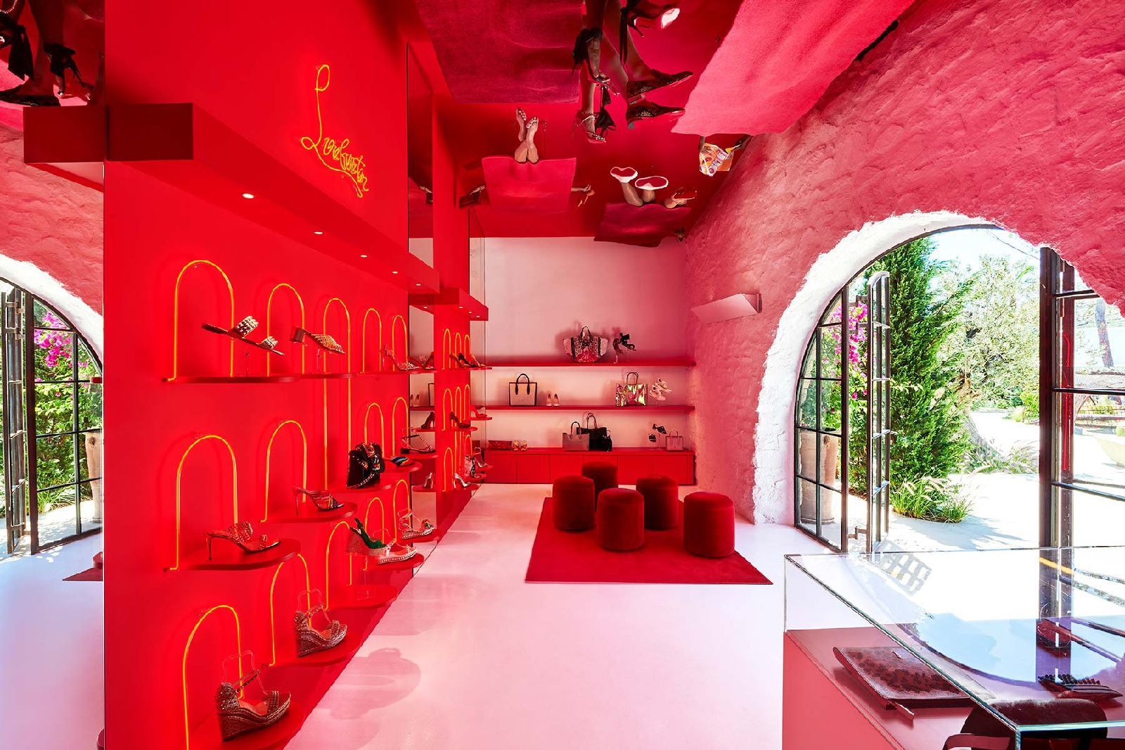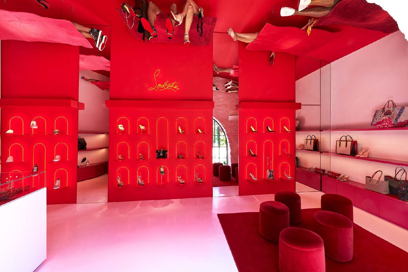 Soprannominato "Loubi Beach", questo spazio di Christian Louboutin è uno dei tanti temporary shop racchiusi Nammos Village. La boutique fonde insieme elementi chiave del marchio di scarpe con riferimenti alla cultura e all'atmosfera da party che caratterizza l'isola. Le tipiche tonalità rossa Louboutin domina ovunque, con luci al neon e scaffalature rosa e bianche che completano il look glam. Questa colata di colore dà all’insieme un’atmosfera quasi decadente che è spezzata solo dall'installazione unica ispirata ai beachgoers dell'isola: gambe che penzolano dagli asciugamani da spiaggia.