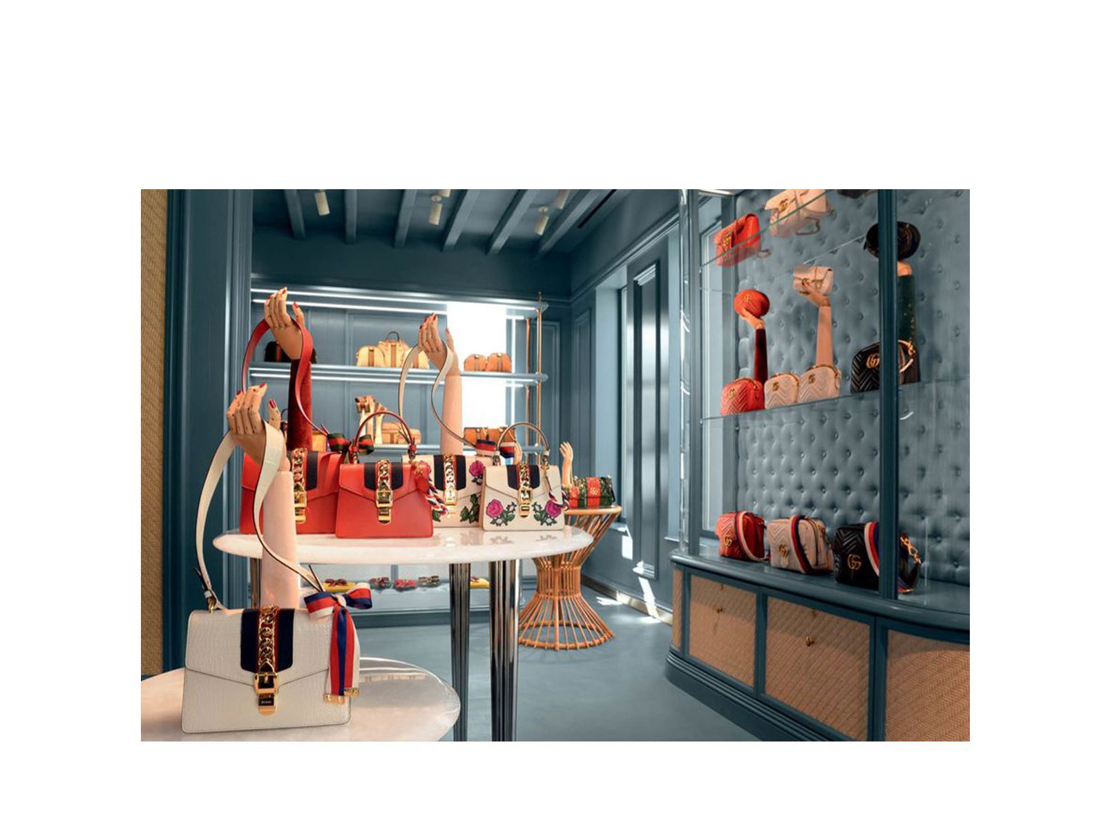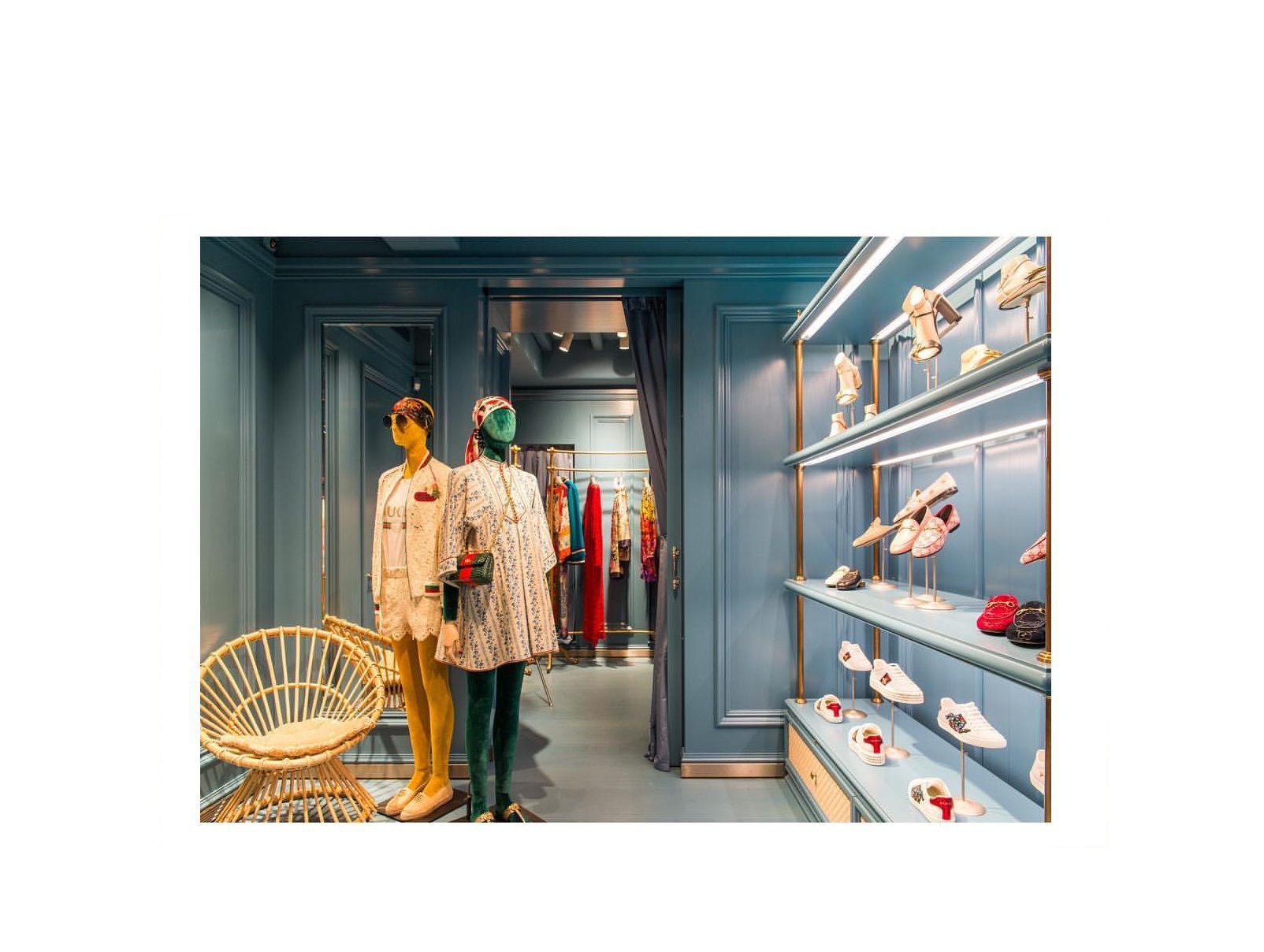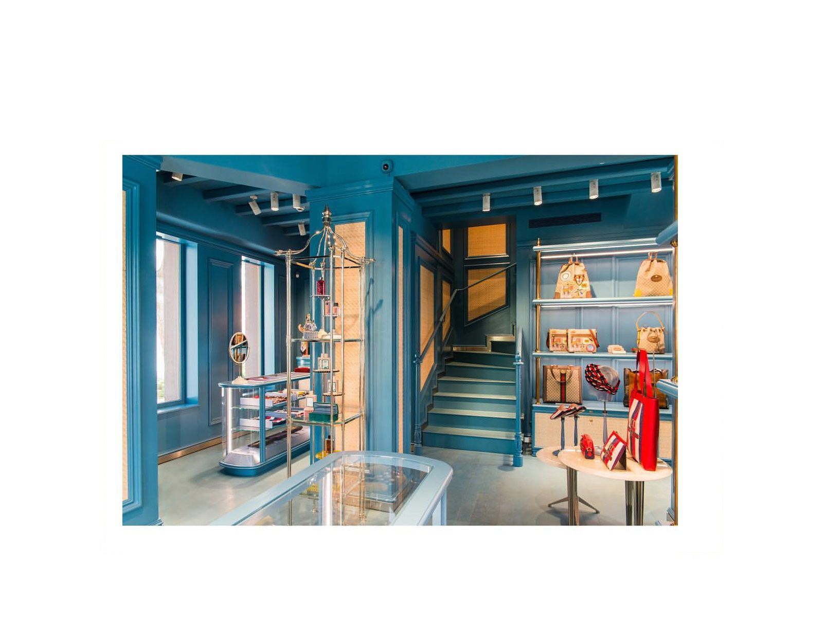 Sempre nel Nammos Village, Gucci ha allestito allestito un pop up store su due piani si estende su una superficie di 120 metri quadrati. L’atmosfera rispecchia sia il gusto vintage del creative director Alessandro Michele sia il paesaggio dell’isola greca. Il risultato è un cabinet de curiosités dove pareti, pavimenti e soffitti di azzurro cielo ricordano i colori del Mar Egeo. Varcare la soglia di questo store significa accedere ad luogo in bilico tra passato e presente animato da bellissime borse e capi d’abbigliamento unici che è quasi impossibile non desiderare.