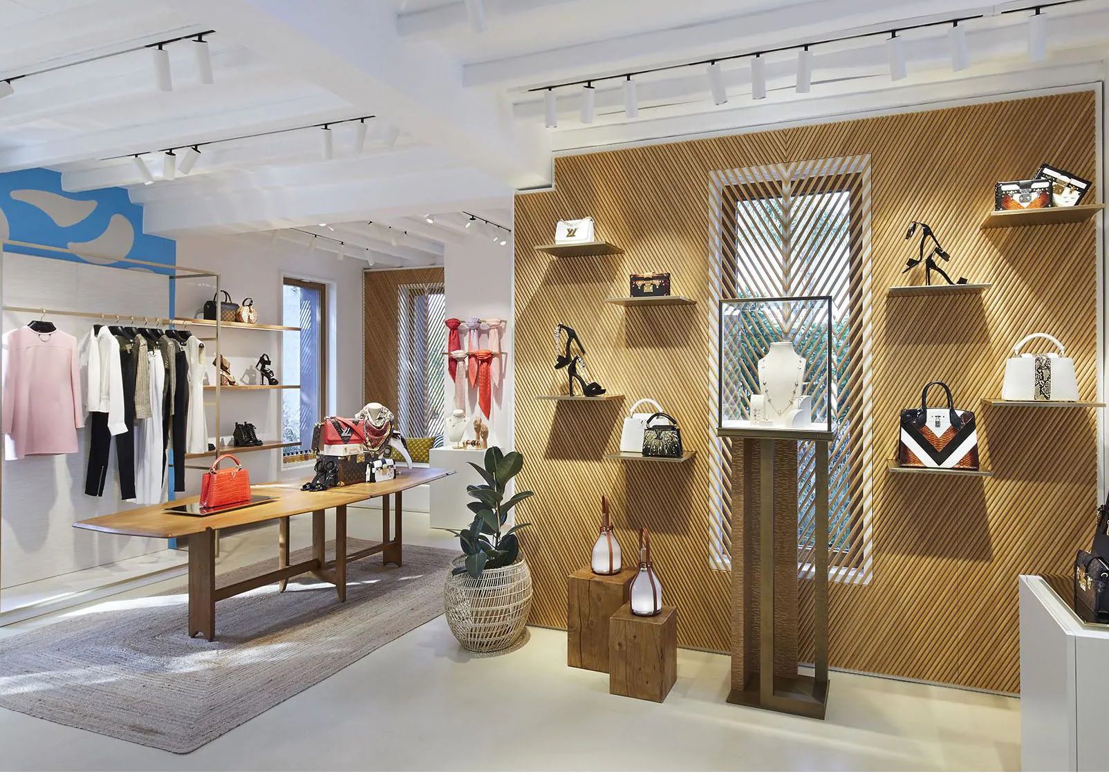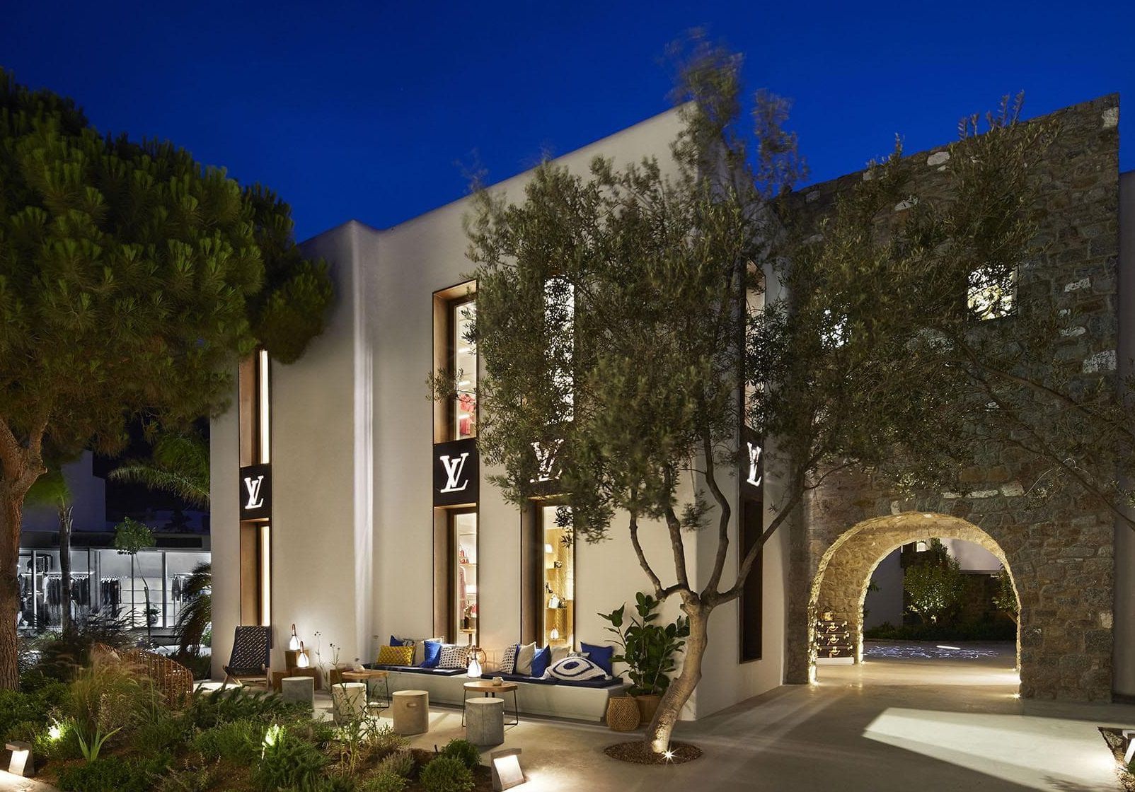 LV ha inaugurato la sua prima boutique a Mykonos, nel cuore della Chora dell'isola, nel 2012. La struttura rispecchiava l'architettura tipica delle Cicladi: pareti candide e legno di quercia, stile pulito,rivestimento di giunchi del soffitto. Sopravvissuto ad una serie di guai fiscali con le autorità greche, lo store temporaneo si è trasferito nel Nammos village, inserendosi perfettamente tra le tante proposte luxury del mall.