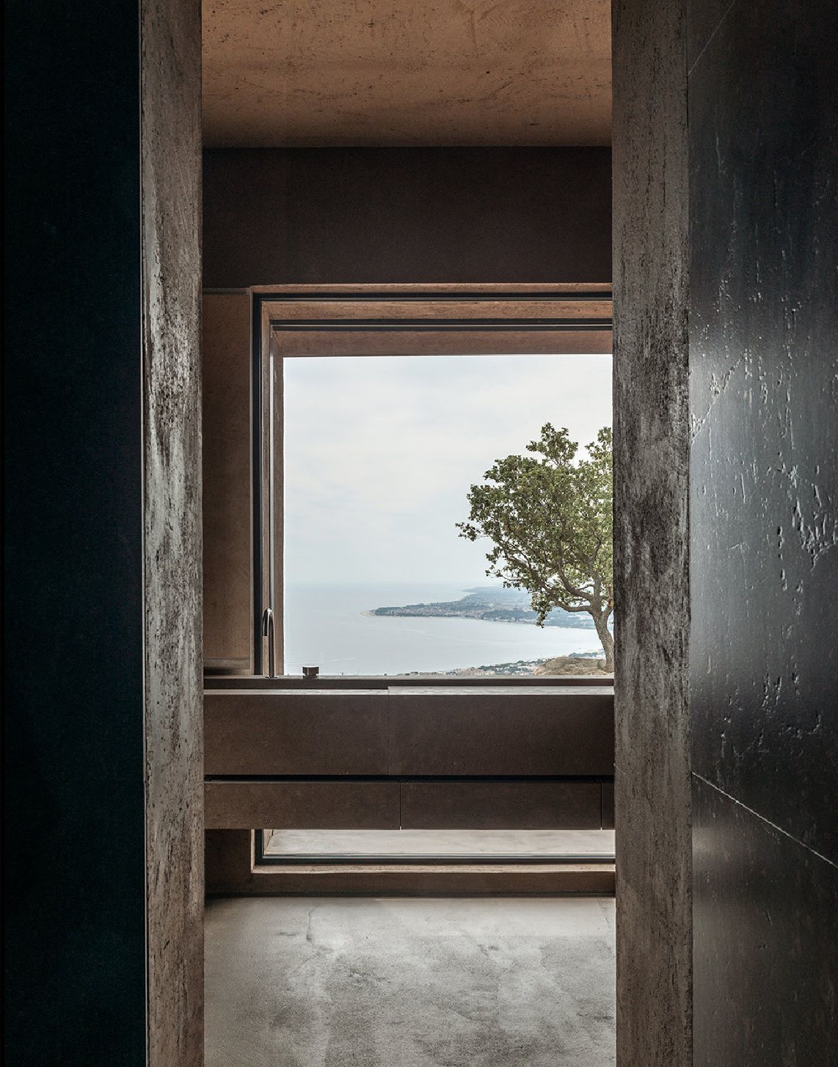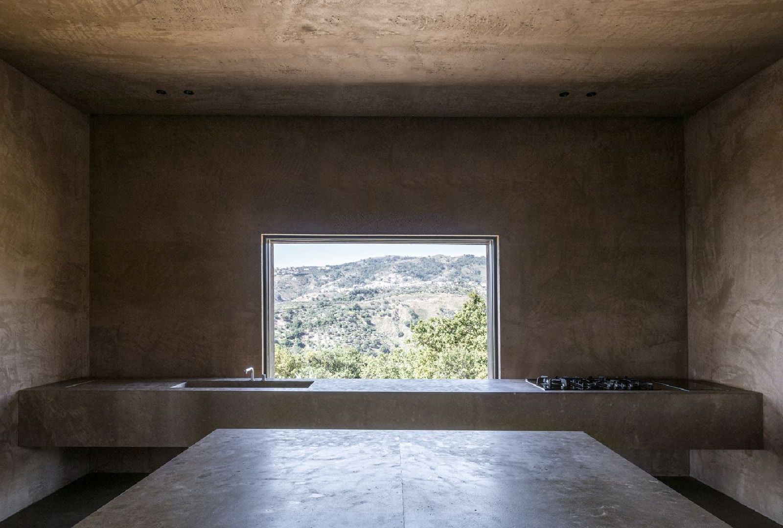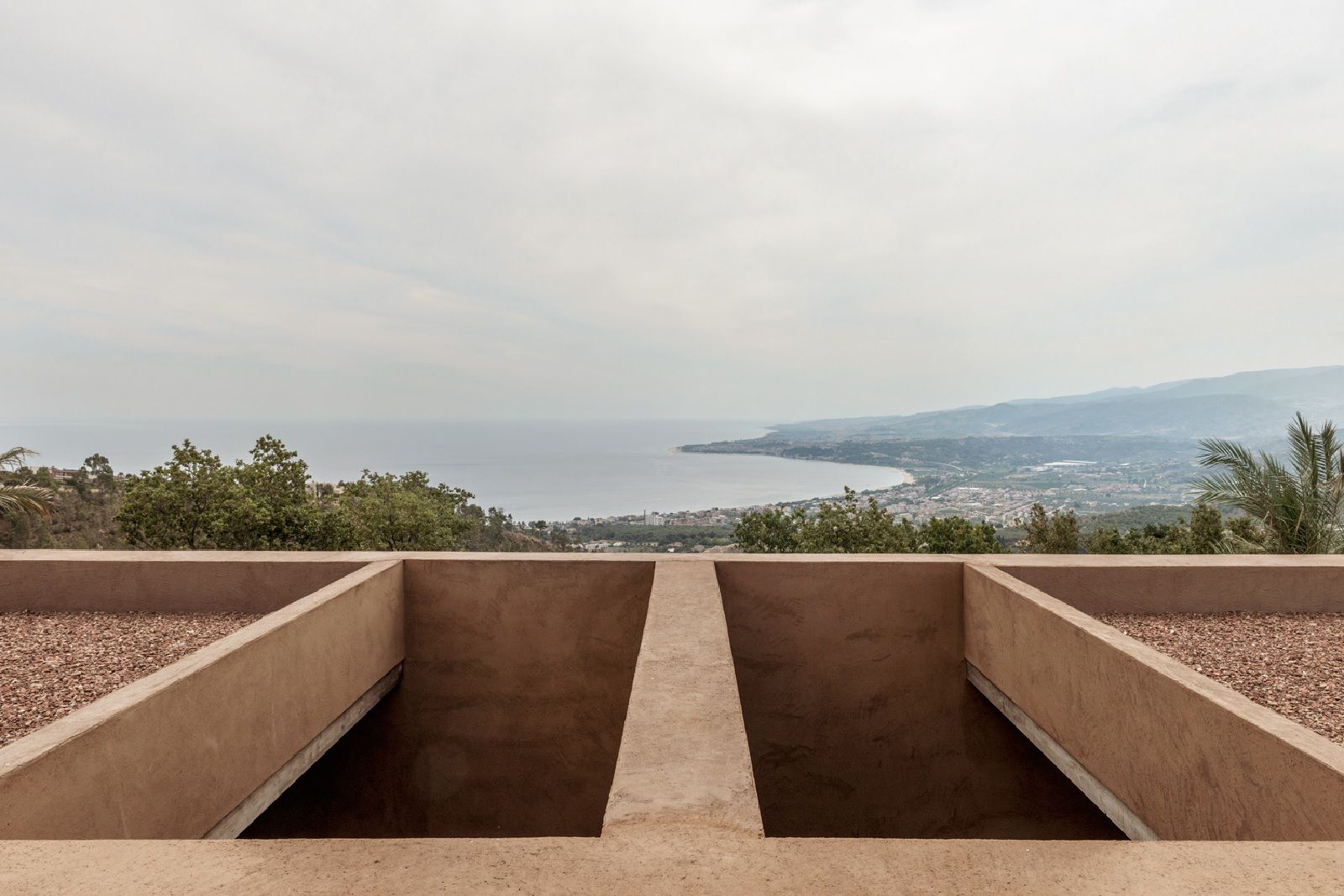 Perfetto esempio di questa filosofia è Villa RA. La casa si trova a Squillace, in Calabria, in un territorio rurale, con le montagne dell’Aspromonte a ovest e il mare a sud. Concepito come ritiro estivo, il progetto è saldamente radicato nel paesaggio mediterraneo, fino quasi a perdersi in esso, soprattutto grazie al Cocciopesto, una tipologia di intonaco cromaticamente simile al terreno, ottenuta attraverso rigorose campionature e prove.Il materiale ricopre egualmente interno ed esterno, regalando un’estrema omogeneità al volume solido della struttura.