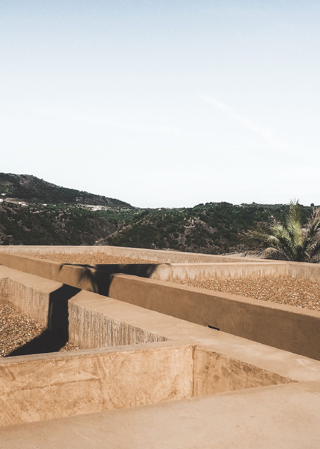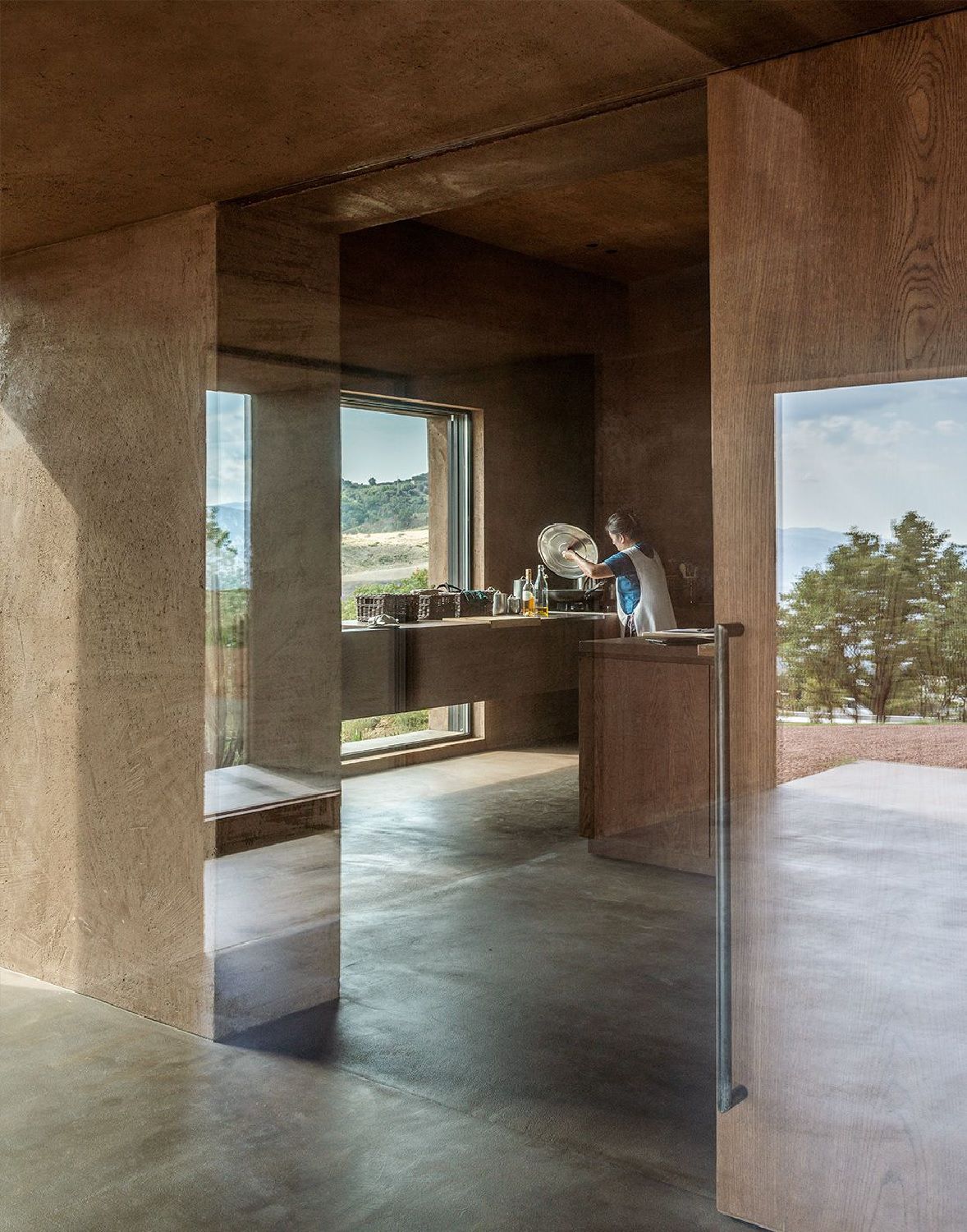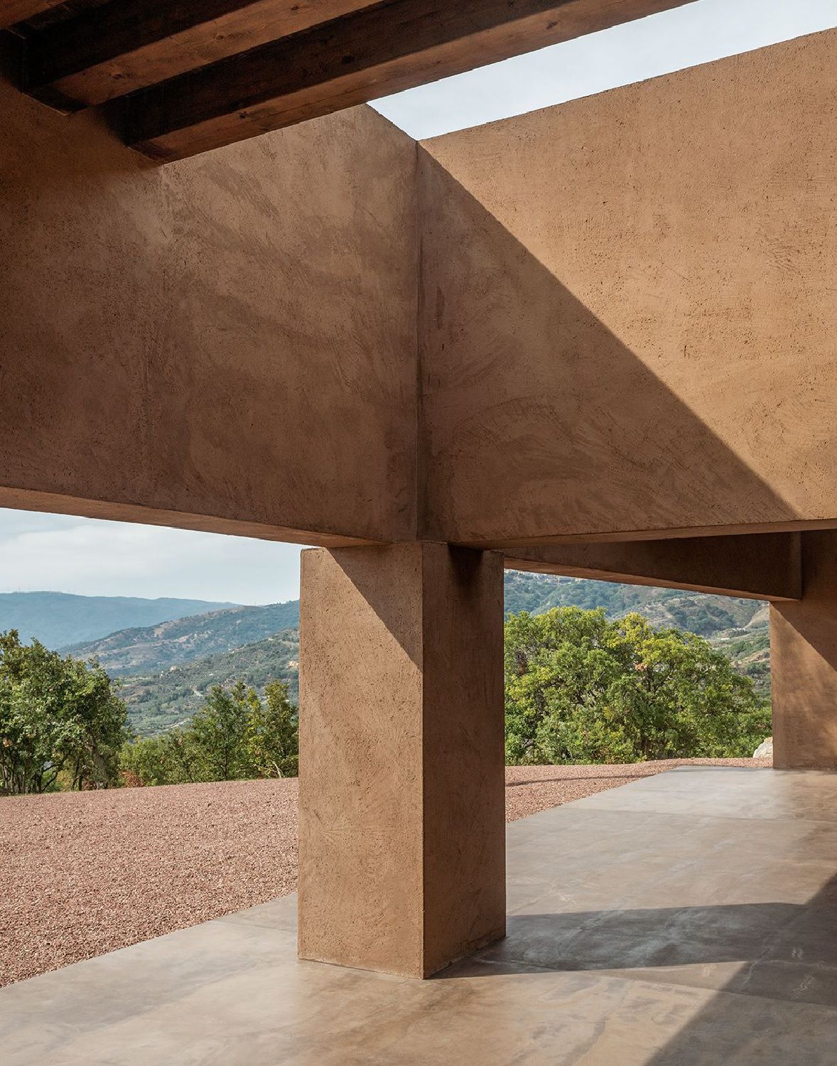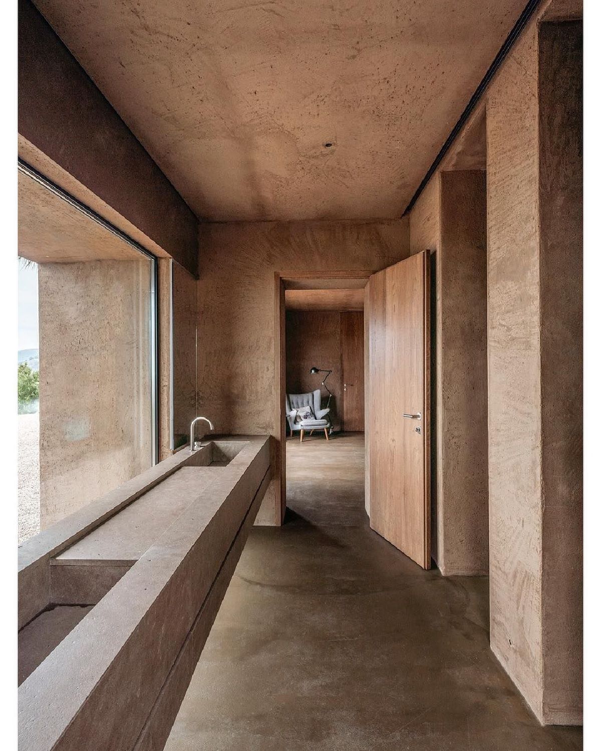 Perfetto esempio di questa filosofia è Villa RA. La casa si trova a Squillace, in Calabria, in un territorio rurale, con le montagne dell’Aspromonte a ovest e il mare a sud. Concepito come ritiro estivo, il progetto è saldamente radicato nel paesaggio mediterraneo, fino quasi a perdersi in esso, soprattutto grazie al Cocciopesto, una tipologia di intonaco cromaticamente simile al terreno, ottenuta attraverso rigorose campionature e prove.Il materiale ricopre egualmente interno ed esterno, regalando un’estrema omogeneità al volume solido della struttura.